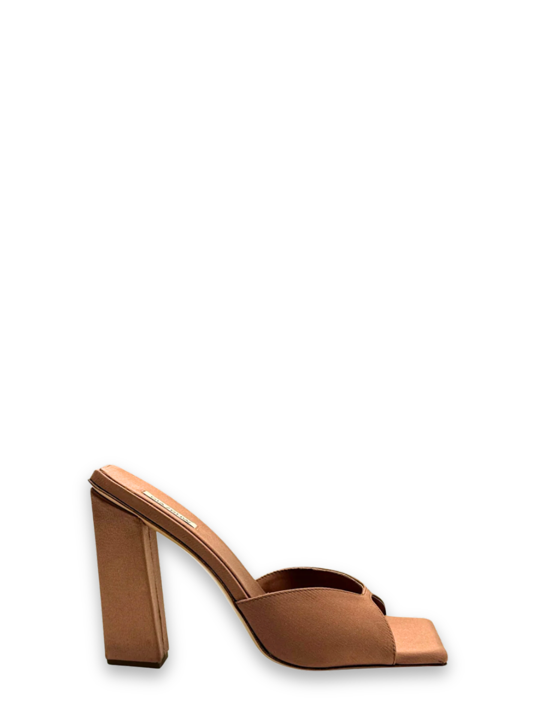 Mule elegante firmata Gia Borghini, realizzata in raso marrone con design moderno e sofisticato. Il modello presenta una silhouette essenziale con punta squadrata e tacco largo geometrico, che garantisce comfort e stabilità senza rinunciare all’eleganza. Perfetta per look da sera o outfit minimal chic.