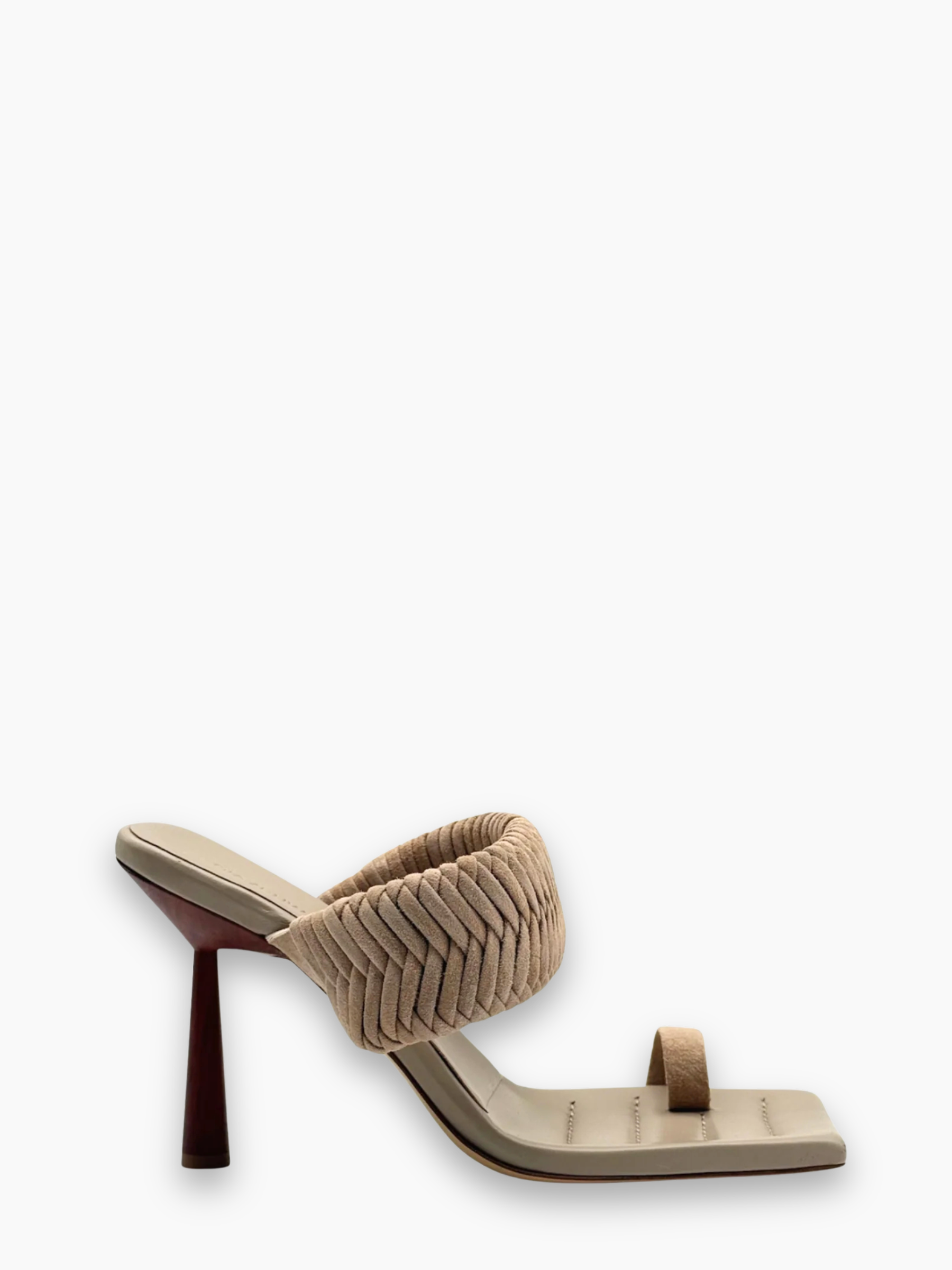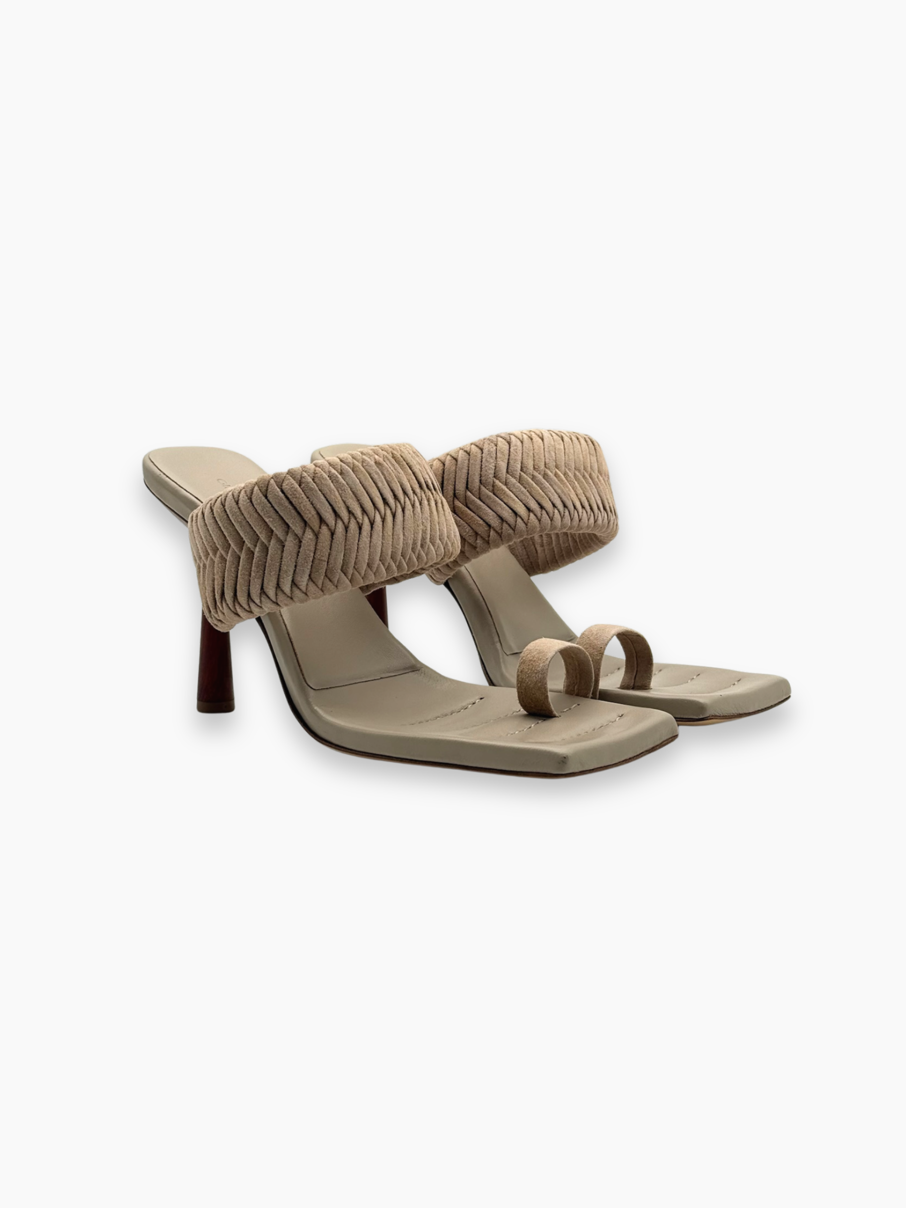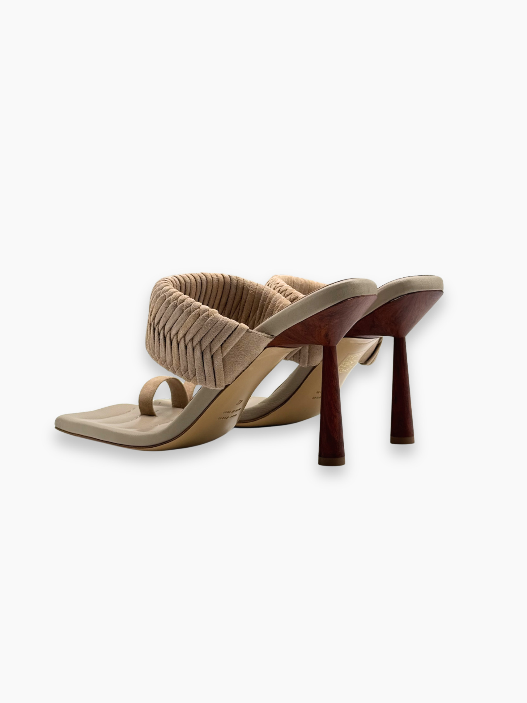 Mule raffinata firmata Gia / RHW in morbido suede beige, caratterizzata da una fascia intrecciata e un elegante tacco scultoreo effetto legno. Un modello sofisticato che combina design moderno e femminilità essenziale.