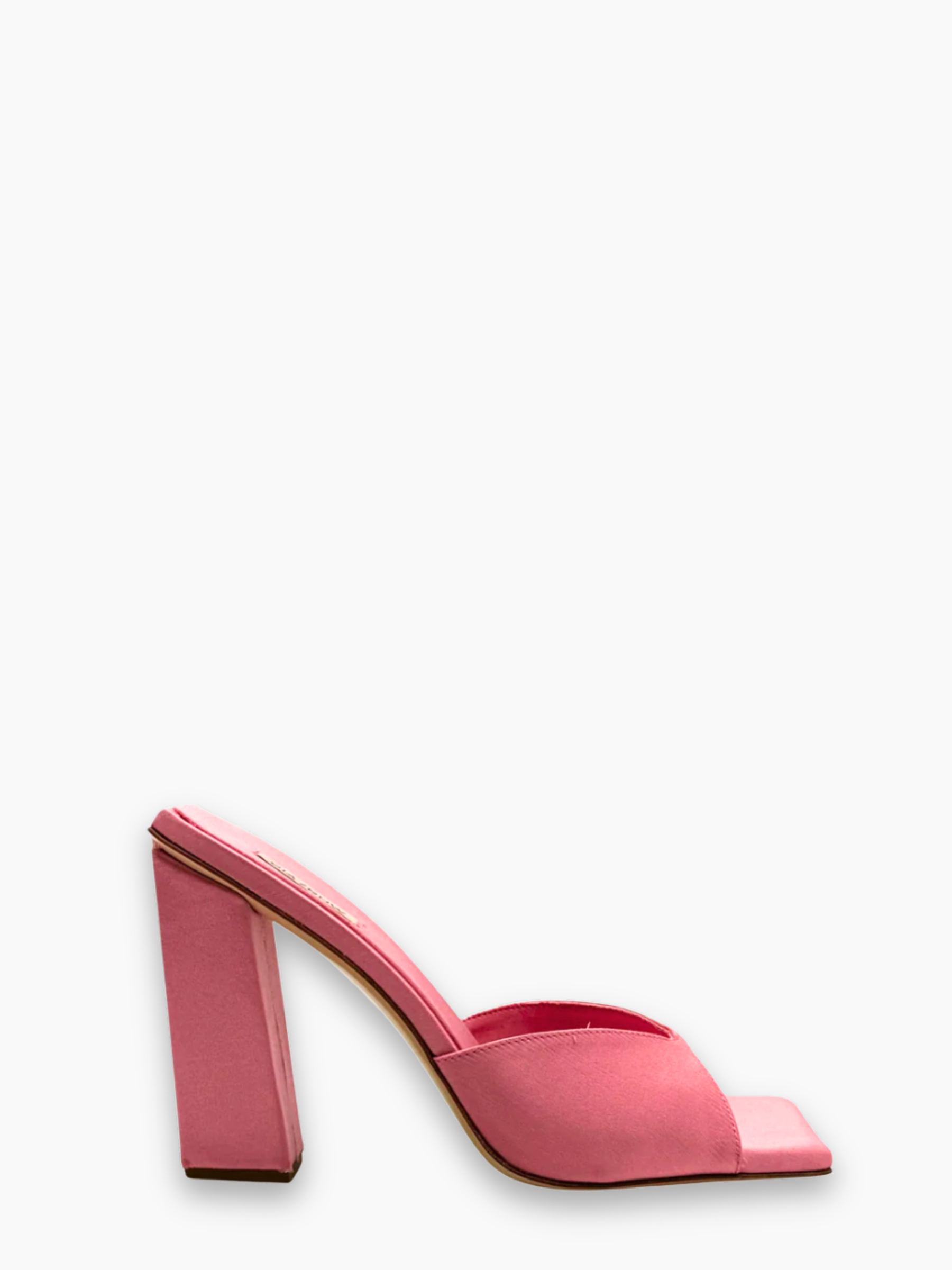 Mule rosa firmata Gia / RHW, realizzata in raffinato raso lucido. Il design con punta squadrata e tacco alto geometrico valorizza la silhouette, rendendo questa scarpa un must-have per look serali e occasioni speciali.