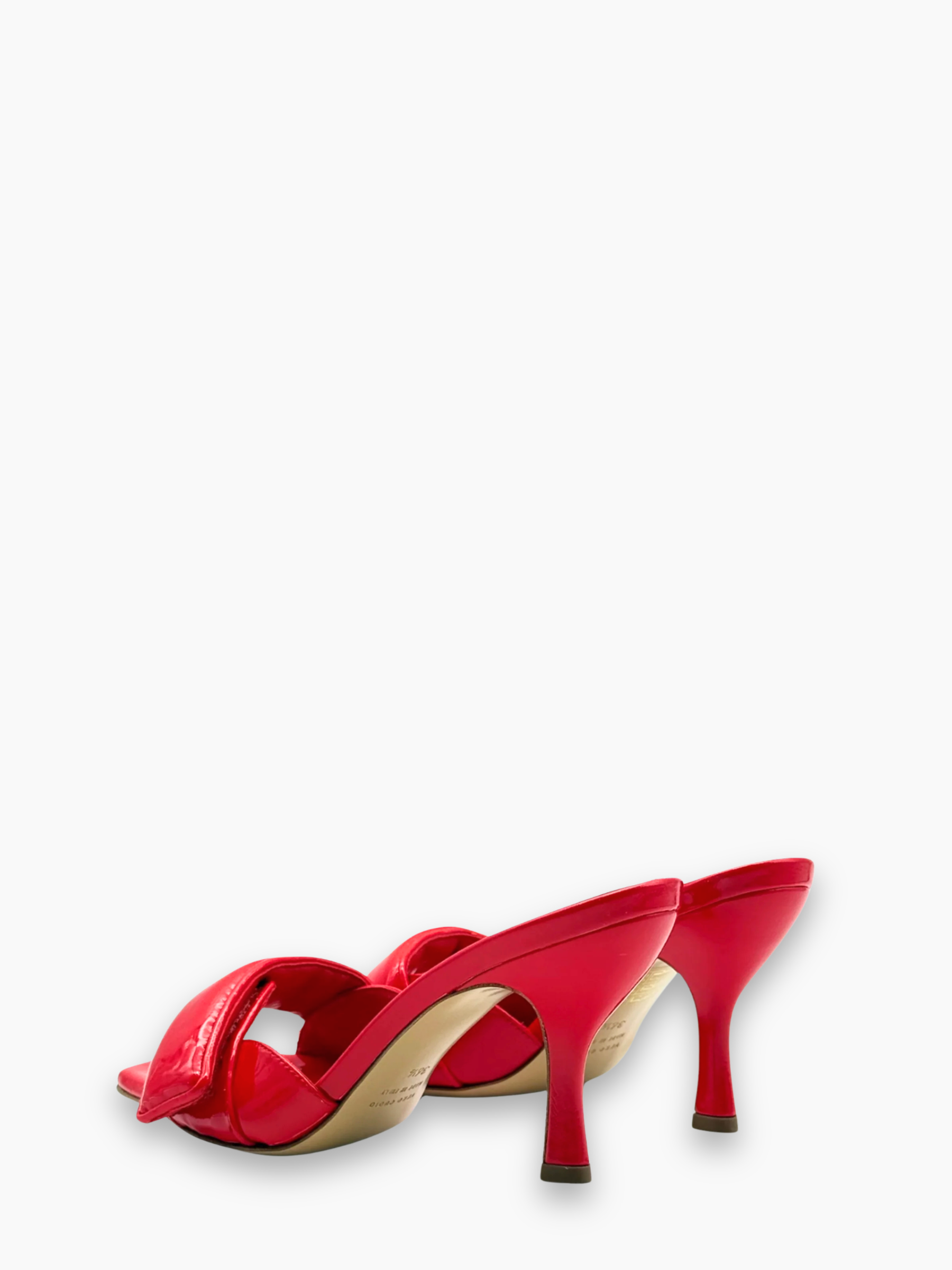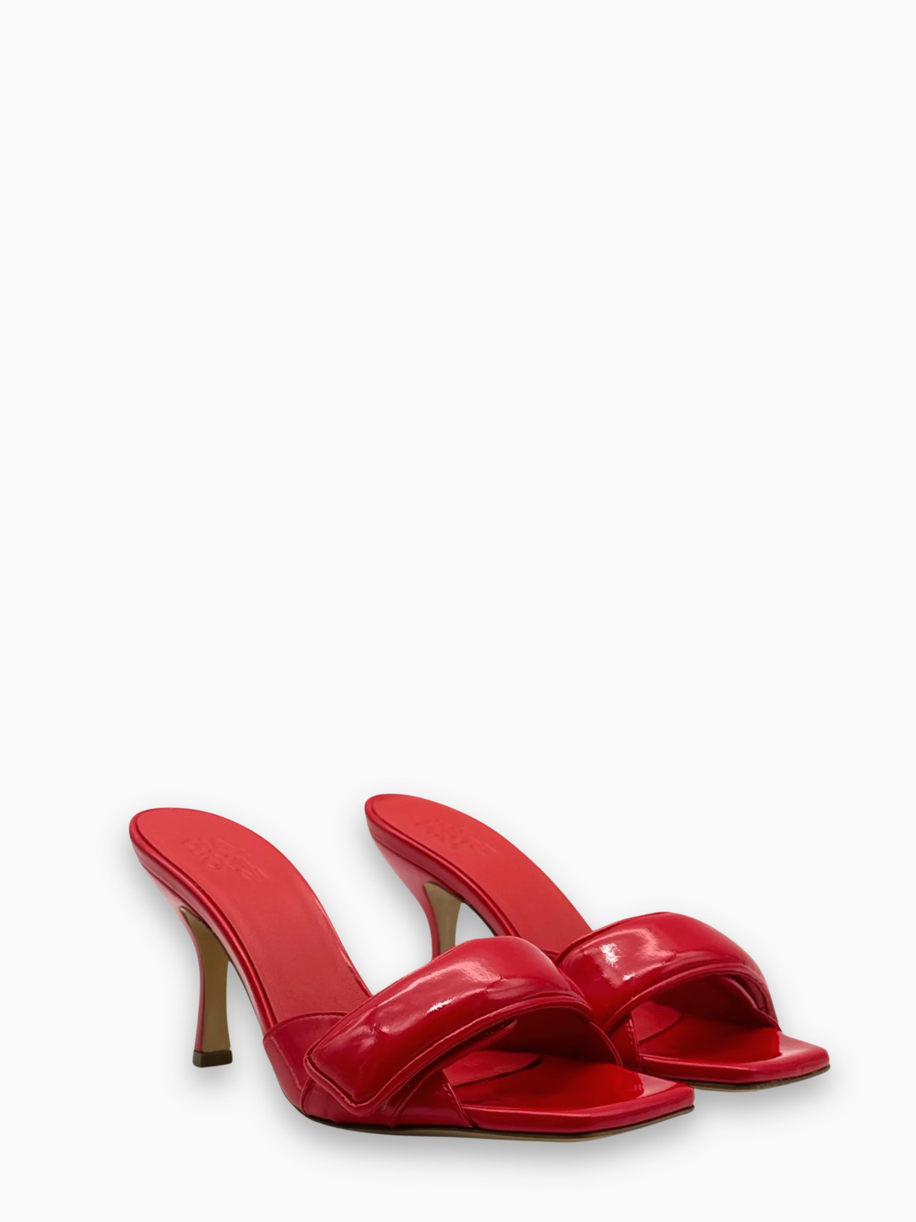 Mule in vernice rossa firmata Gia Borghini, caratterizzata da un design elegante e sensuale. La fascia imbottita e la silhouette minimalista con punta squadrata e tacco sottile esaltano la femminilità del modello. Ideale per aggiungere un tocco sofisticato e deciso ai look da sera.