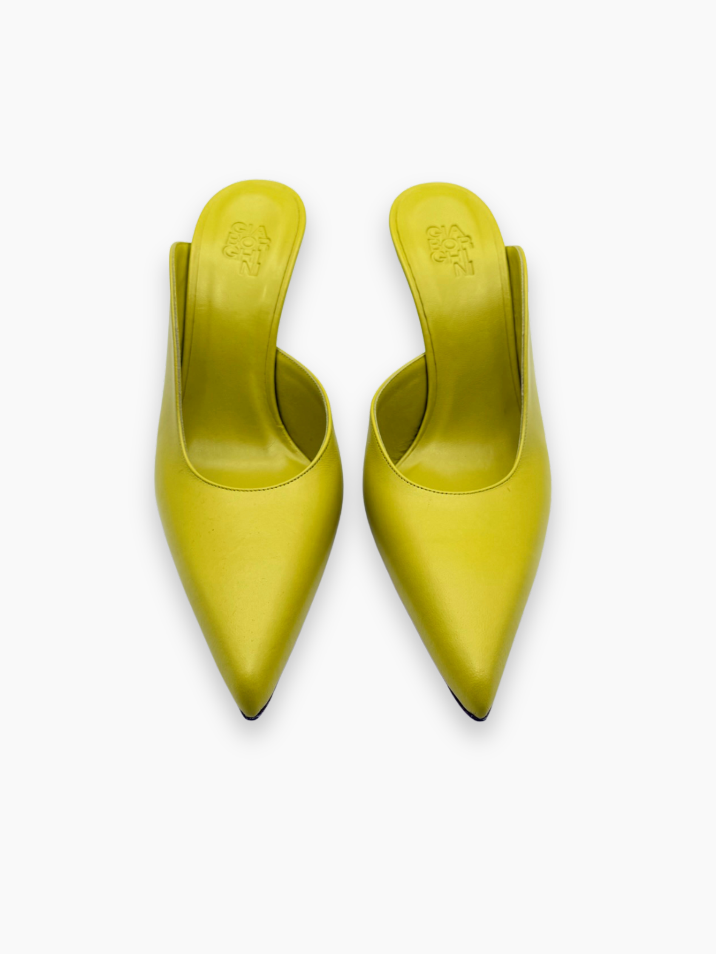 Mules Gia Borghini in pelle gialla dal design elegante e affusolato. La silhouette a punta e il tacco a spillo slanciano la figura, aggiungendo un tocco sofisticato e audace a ogni look. Perfette per serate estive o occasioni speciali.