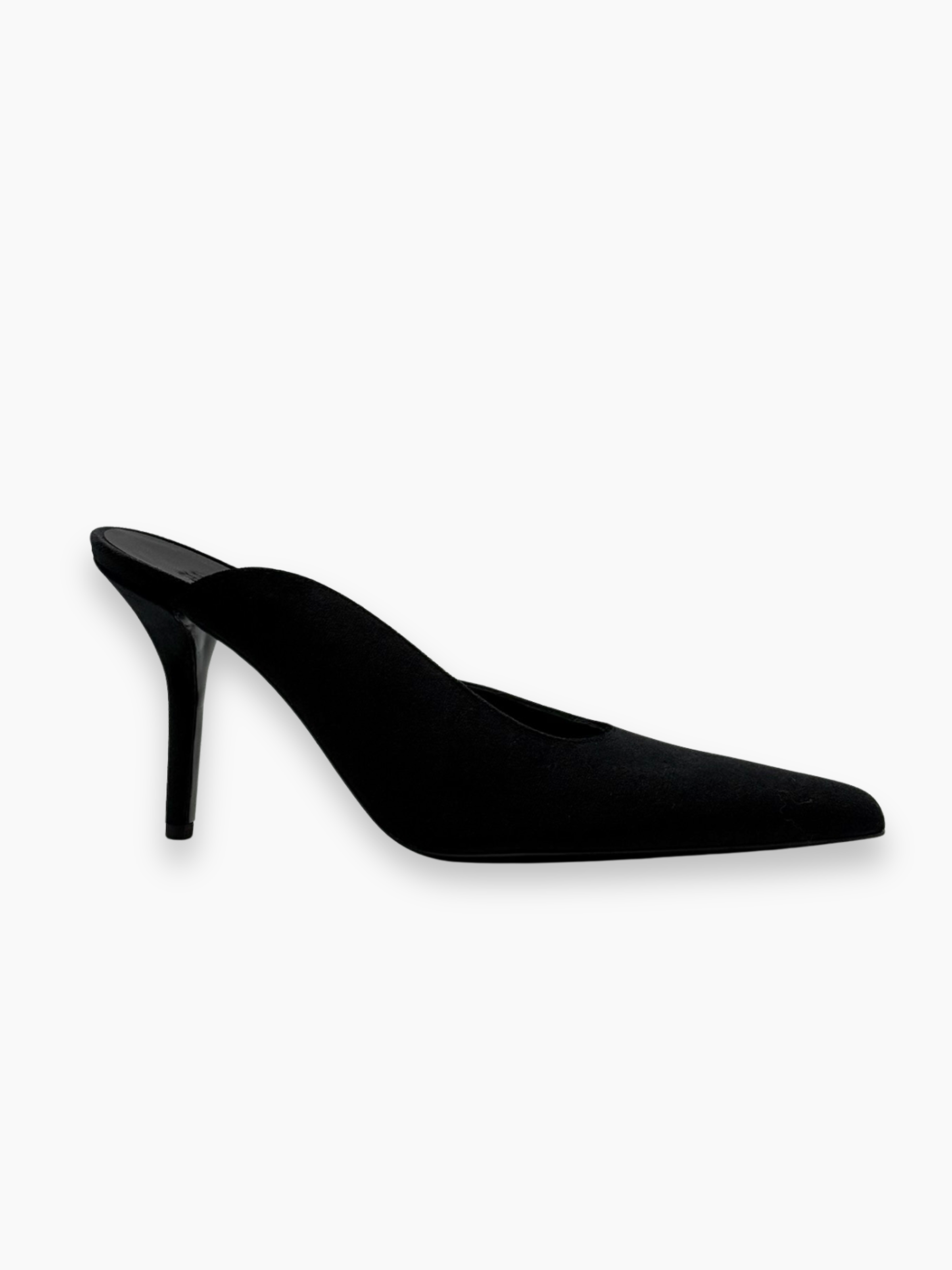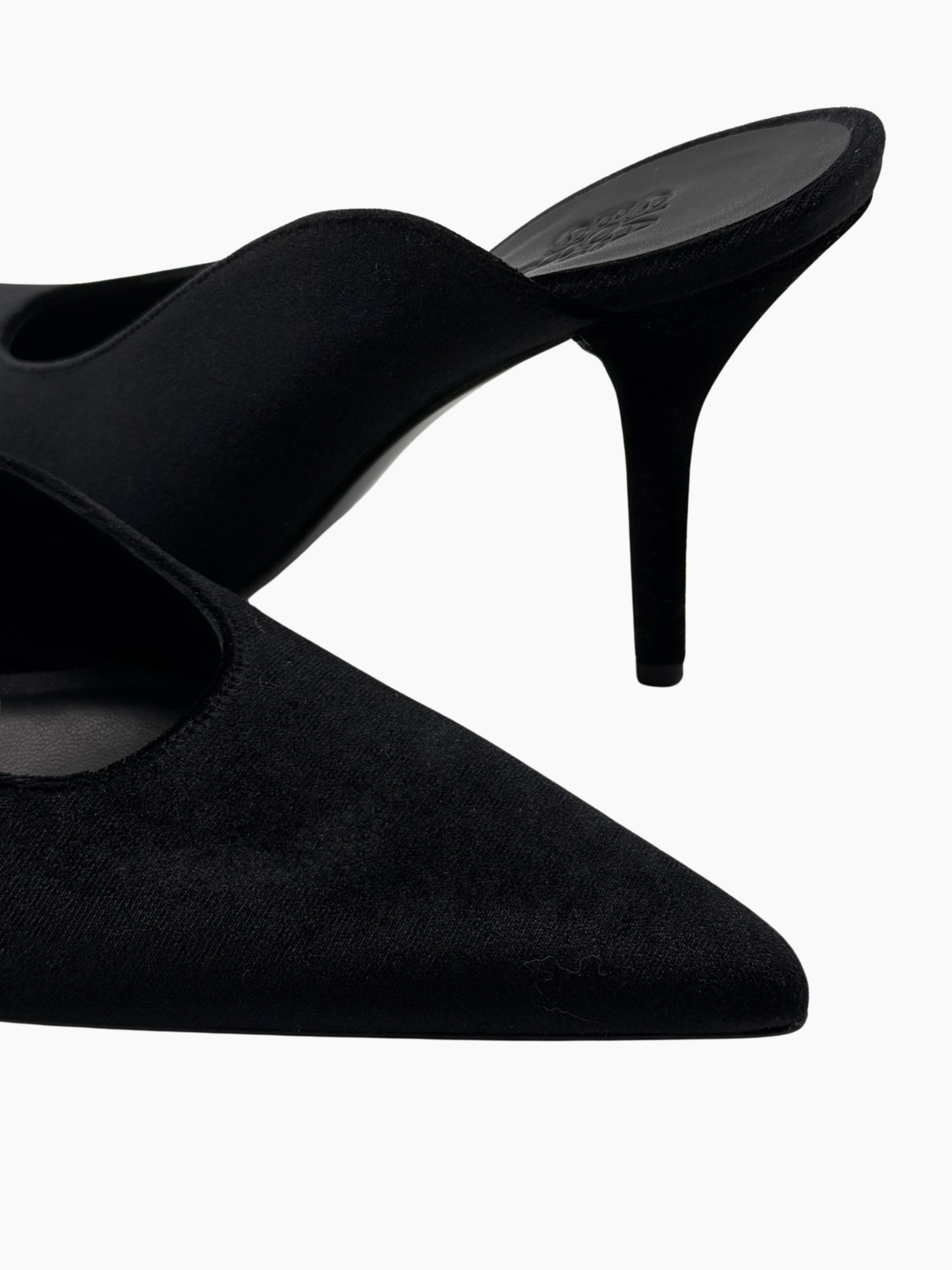 Mules sofisticate firmate Gia Borghini, caratterizzate da una silhouette affusolata e un elegante tacco a spillo. Realizzate in morbido tessuto nero effetto velluto, queste scarpe esprimono minimalismo e femminilità contemporanea, perfette per look serali e da occasione.