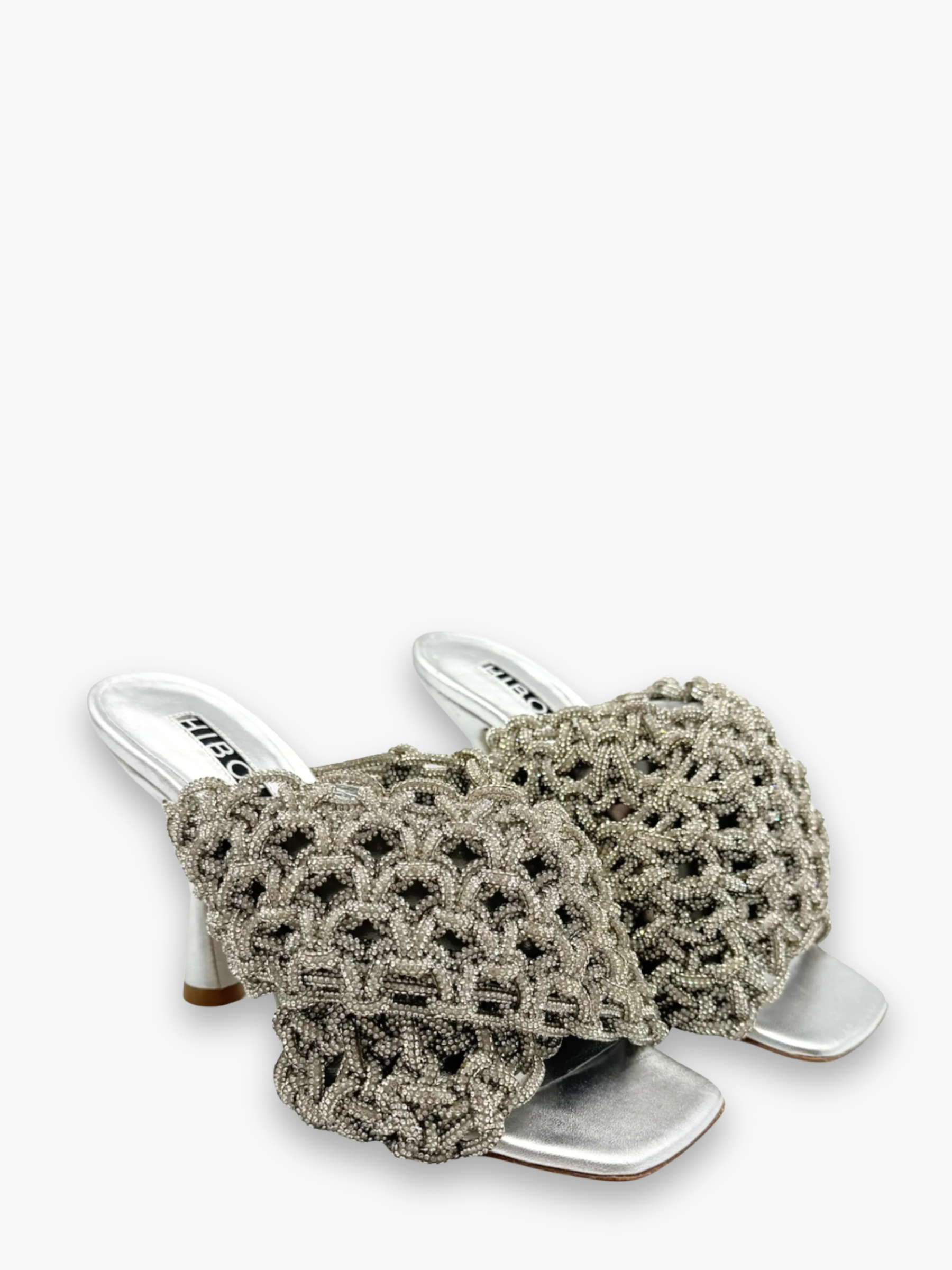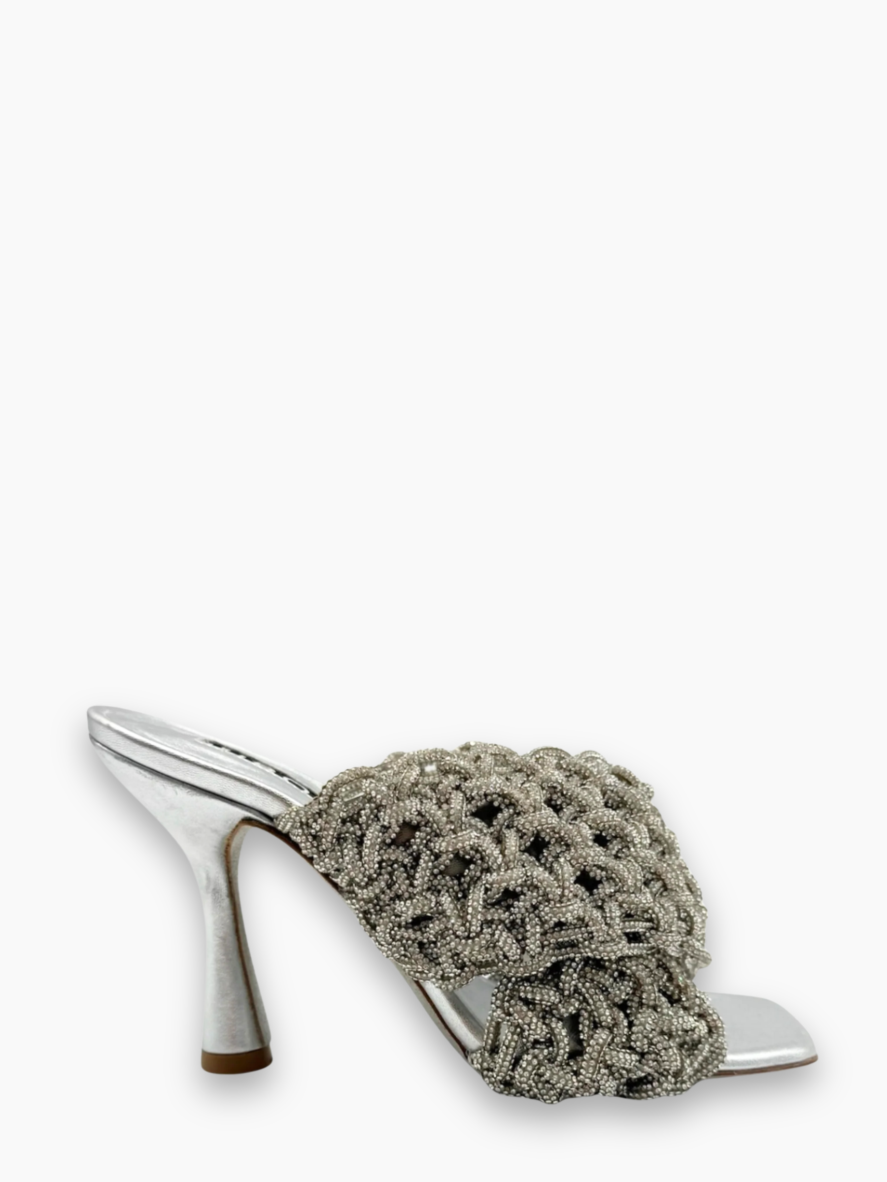 Sandali Hibourama modello Le Magiques realizzati in pelle laminata argento con tomaia intrecciata a mano in micro perline ton-sur-ton. Il design scultoreo è valorizzato da un tacco a clessidra di circa 9 cm, per uno stile ricercato e brillante che cattura lo sguardo. Un vero statement piece, ideale per le occasioni più speciali.