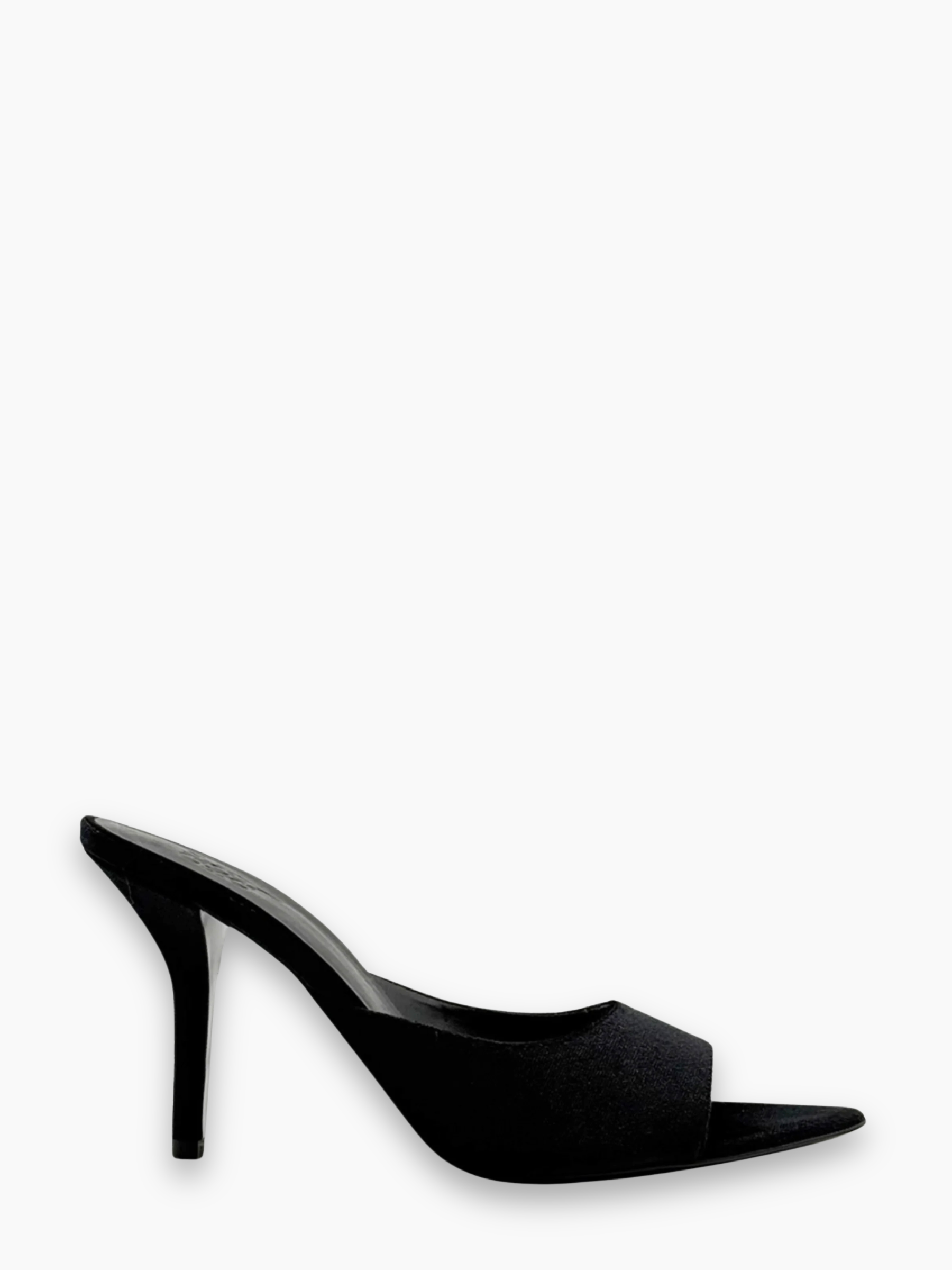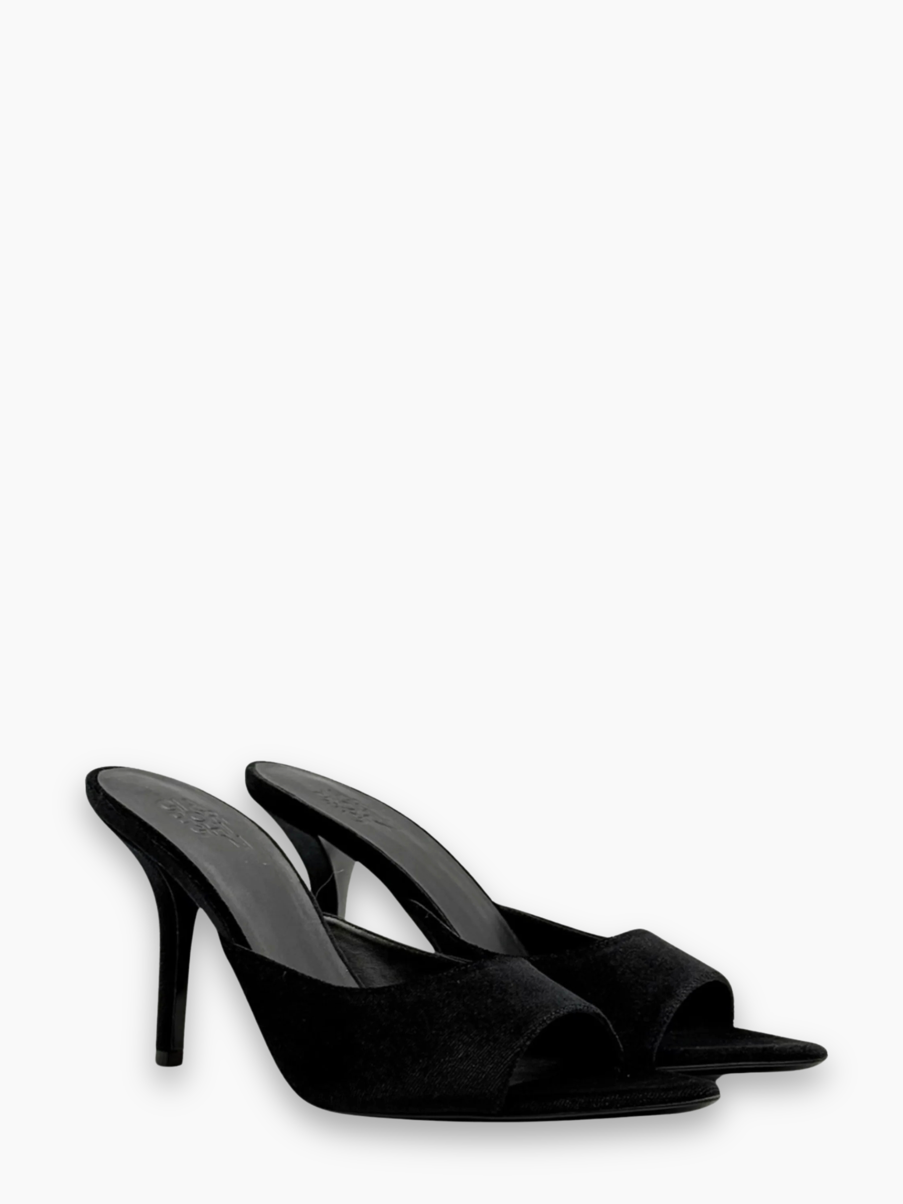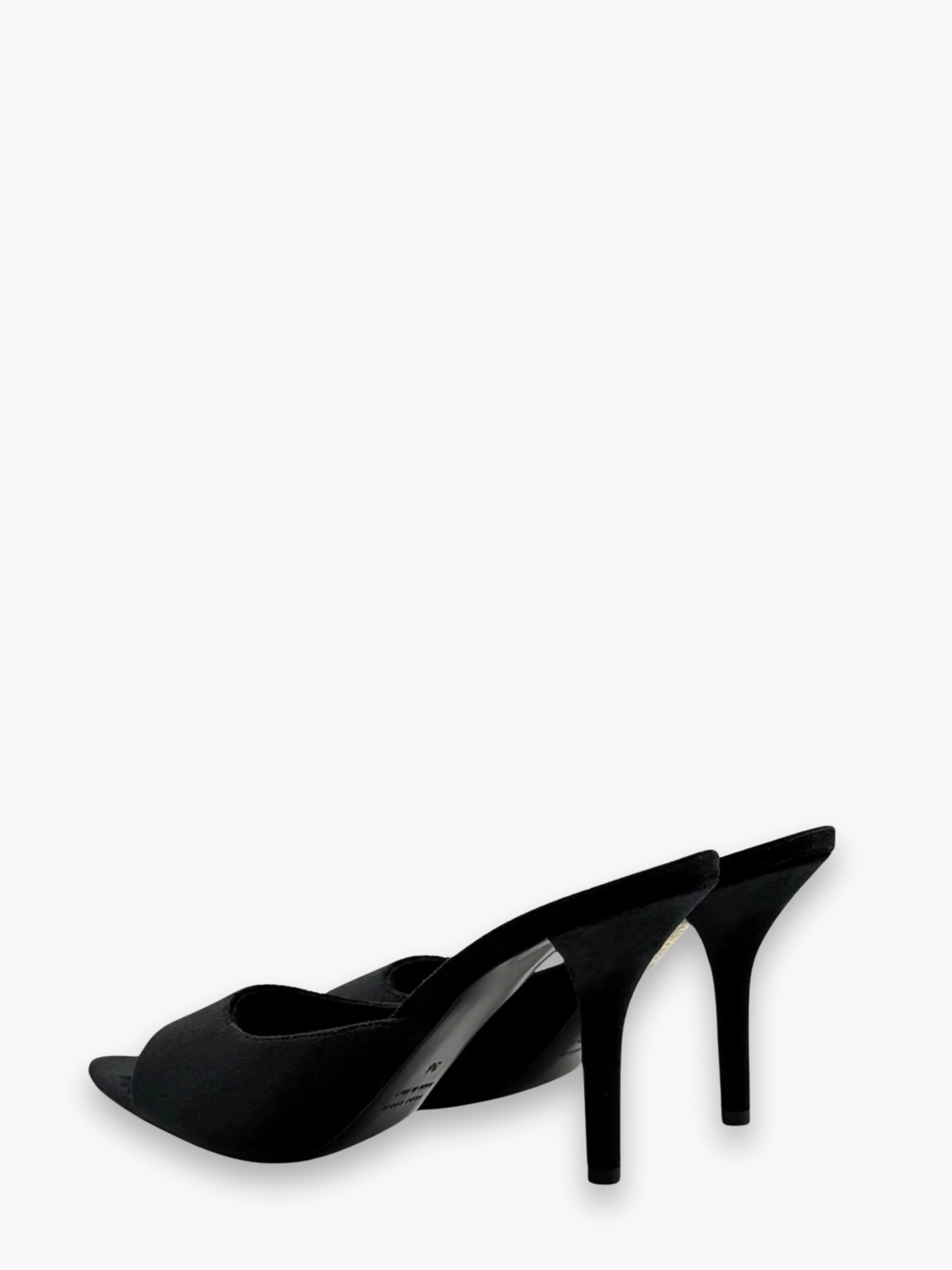 Mules raffinate in velluto nero, caratterizzate da una silhouette elegante con punta affusolata e tacco sottile medio. Il velluto lucente dona luminosità e carattere al modello, rendendolo la scelta ideale per look serali, outfit sofisticati o eventi speciali.