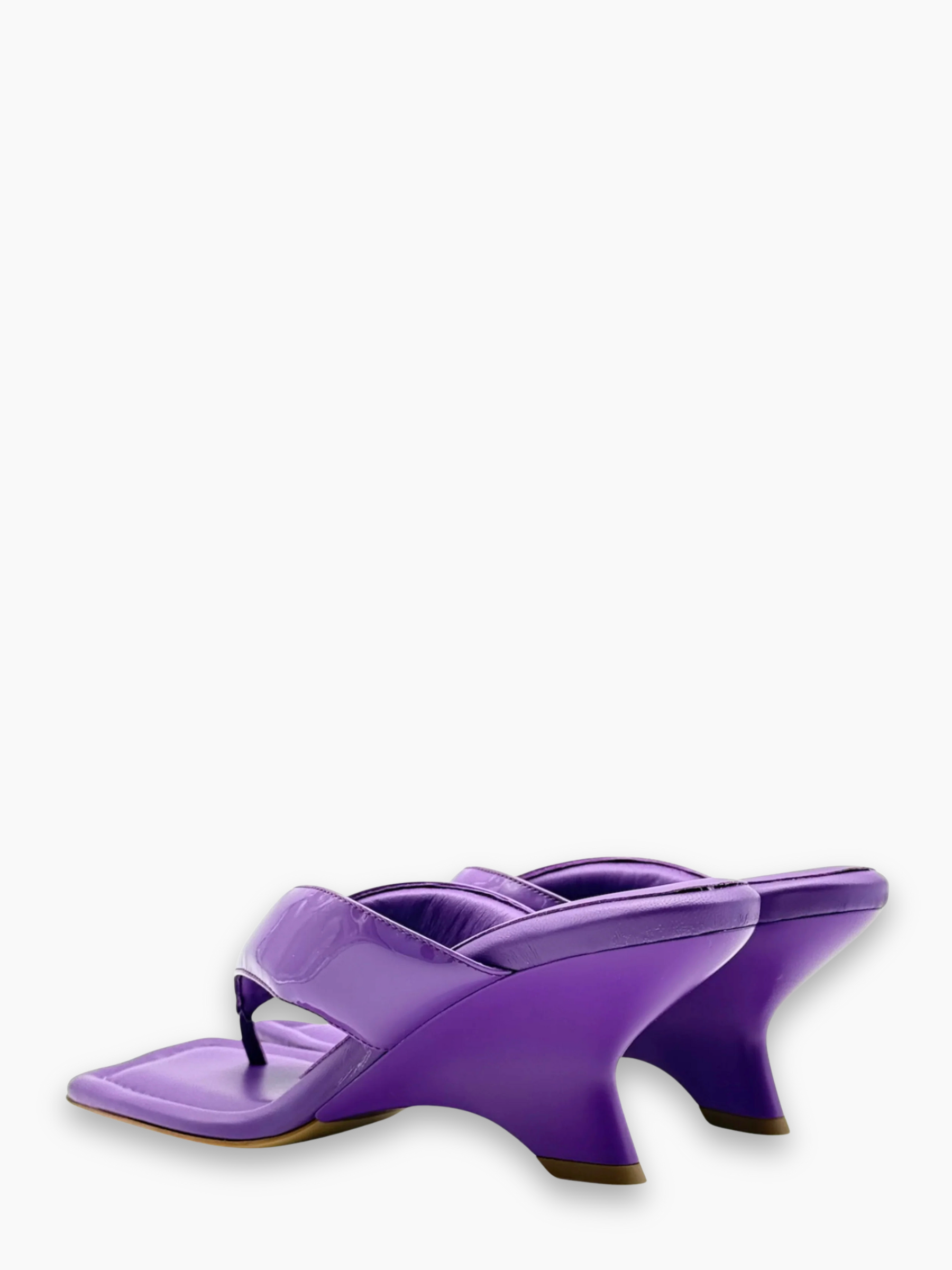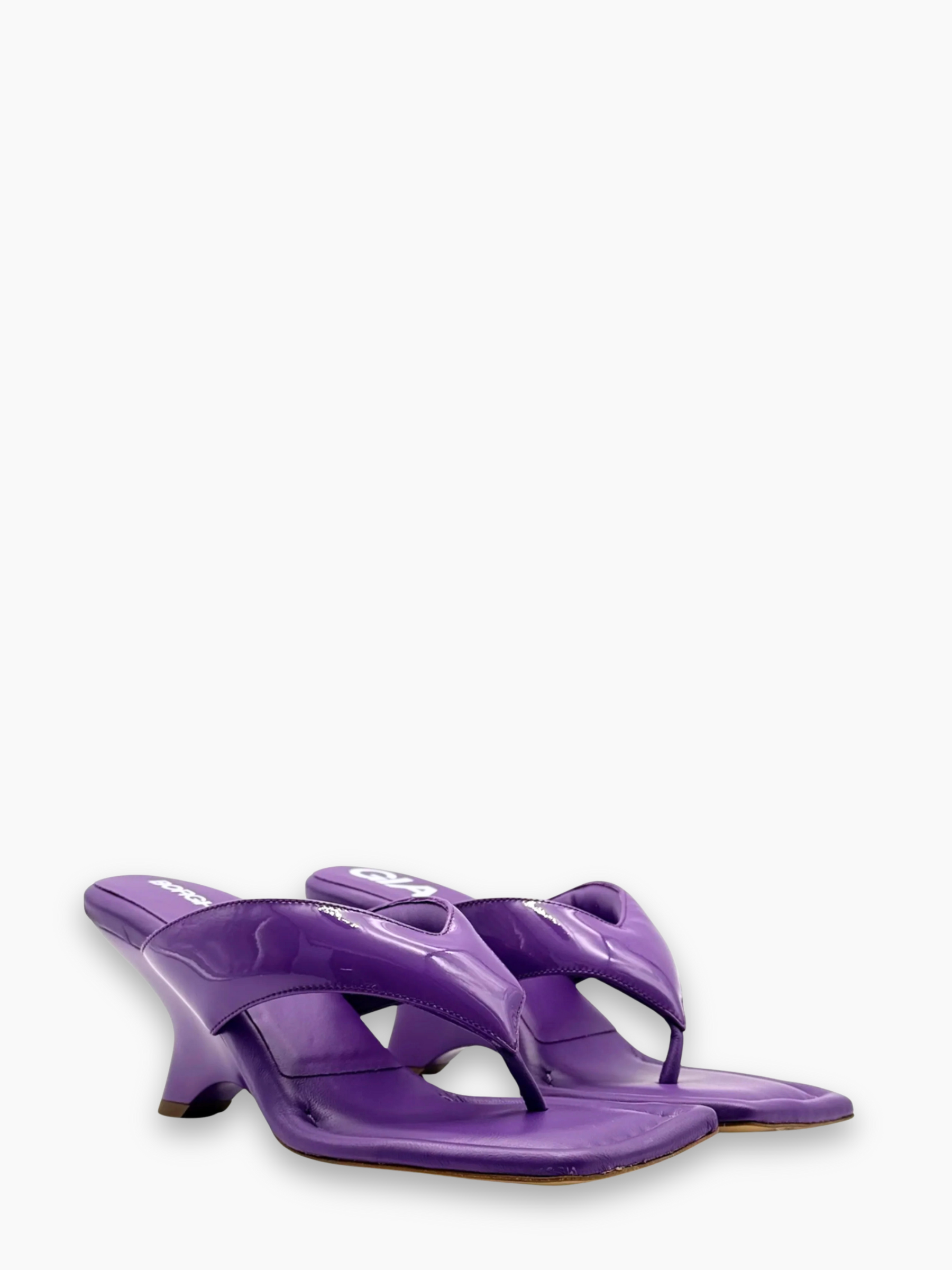 Sandali viola firmati Gia Borghini, caratterizzati da un design con infradito e tacco scultoreo di ispirazione architettonica. Realizzati in pelle verniciata, presentano una silhouette moderna con punta squadrata e un effetto lucido che dona luminosità al look. Perfetti per aggiungere un tocco di colore e stile ai tuoi outfit estivi.