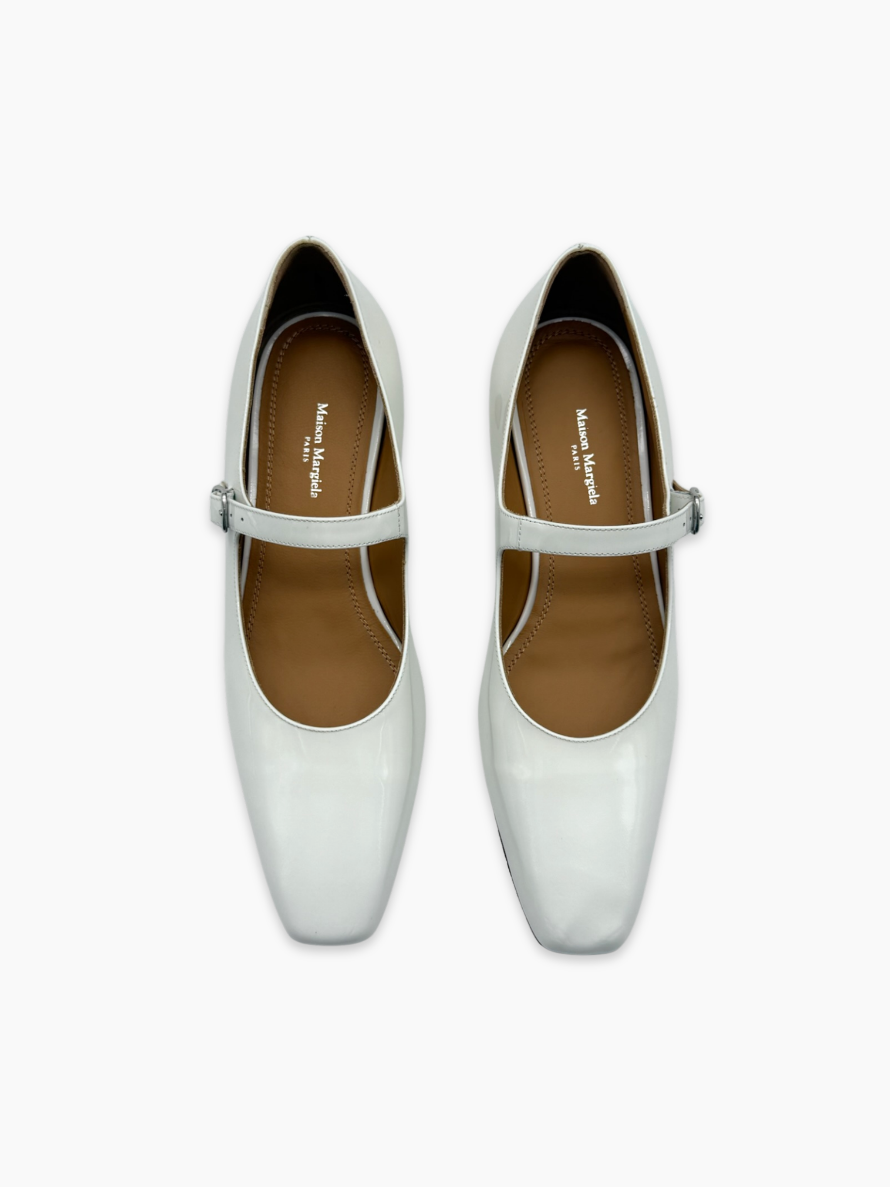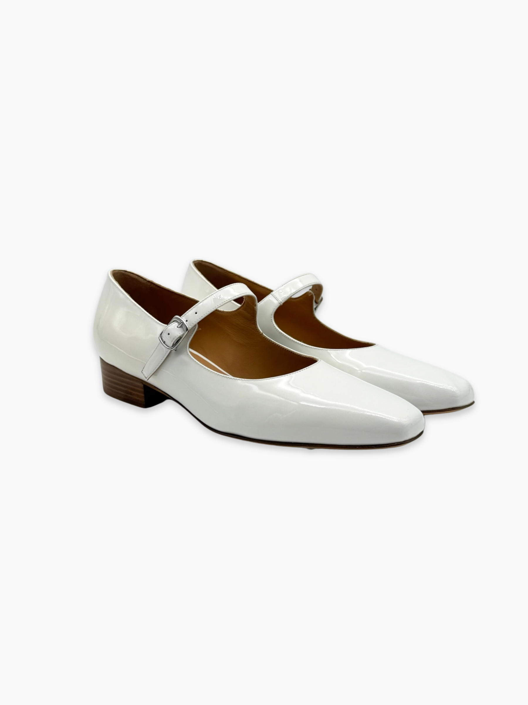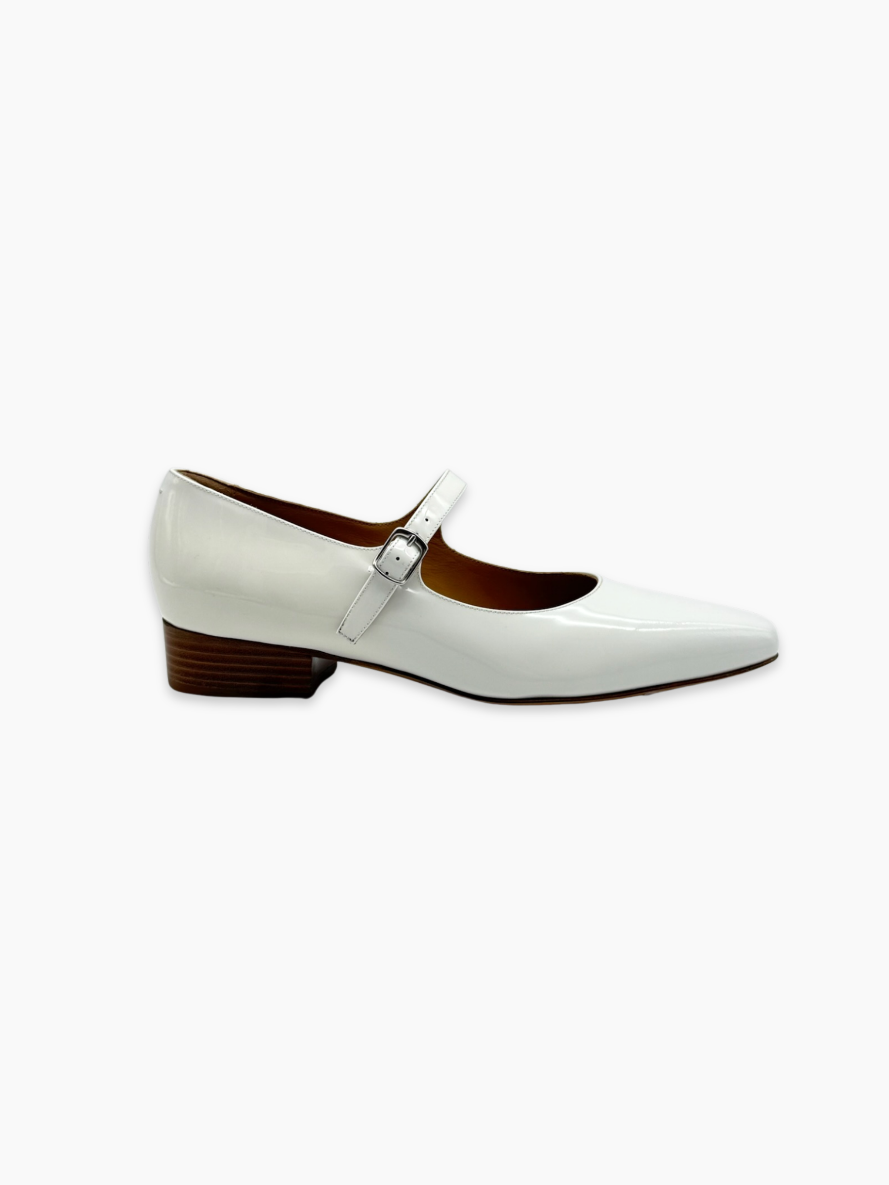 Le Mary Jane bianche in vernice con cinturino regolabile e tacco basso sono la quintessenza dello stile rétro, rivisitato in chiave moderna. La silhouette affusolata a punta e la finitura lucida le rendono perfette per completare look raffinati o aggiungere un twist bon ton a outfit più casual. Il tacco largo in legno naturale dona stabilità e un tocco sofisticato.