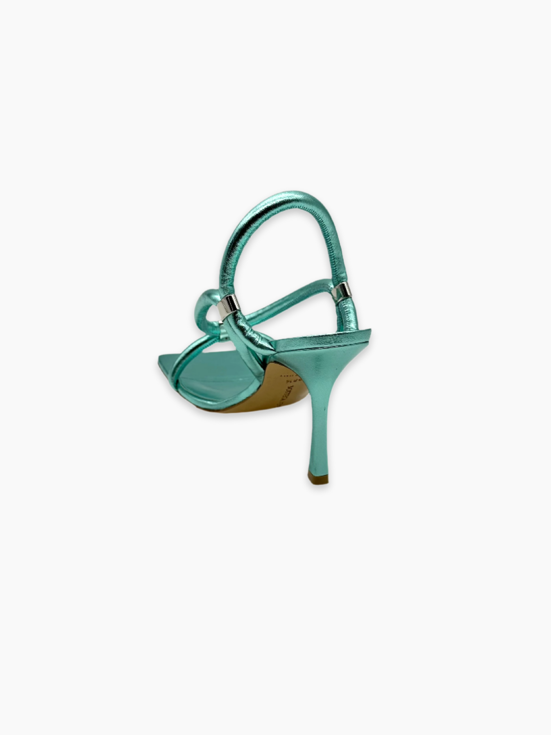 Sandali Bottega Veneta dallo stile moderno e raffinato, realizzati in pelle verde metallizzata. Il design con listini tubolari e tacco sottile dona un’eleganza minimalista e femminile, perfetta per look da sera o occasioni speciali.