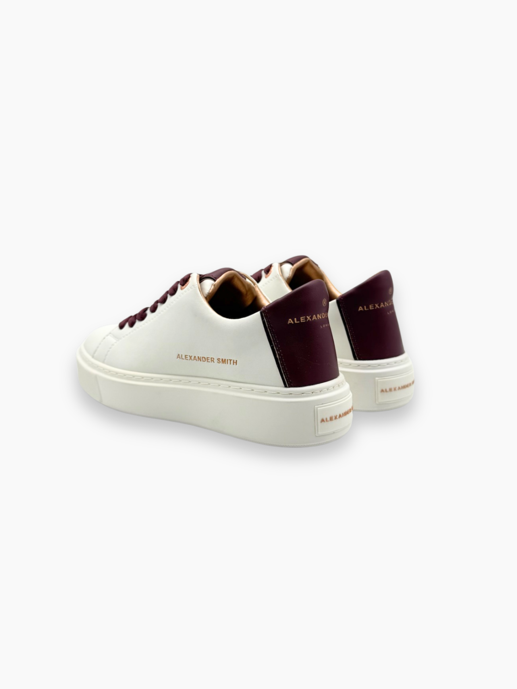 Sneakers basse dallo stile essenziale ma sofisticato, realizzate in pelle bianca con dettagli bordeaux a contrasto. I lacci e la linguetta in tono, insieme ai dettagli metallici color rame, donano un tocco contemporaneo e raffinato. Ideali per aggiungere eleganza a look casual o urban chic.