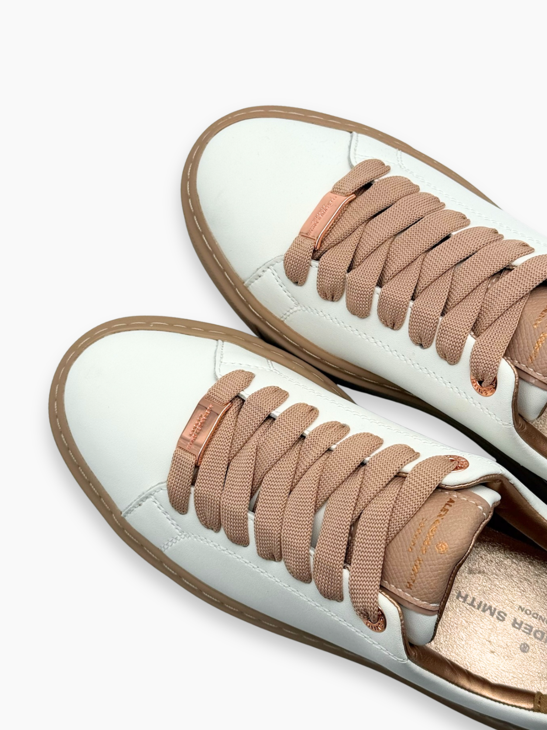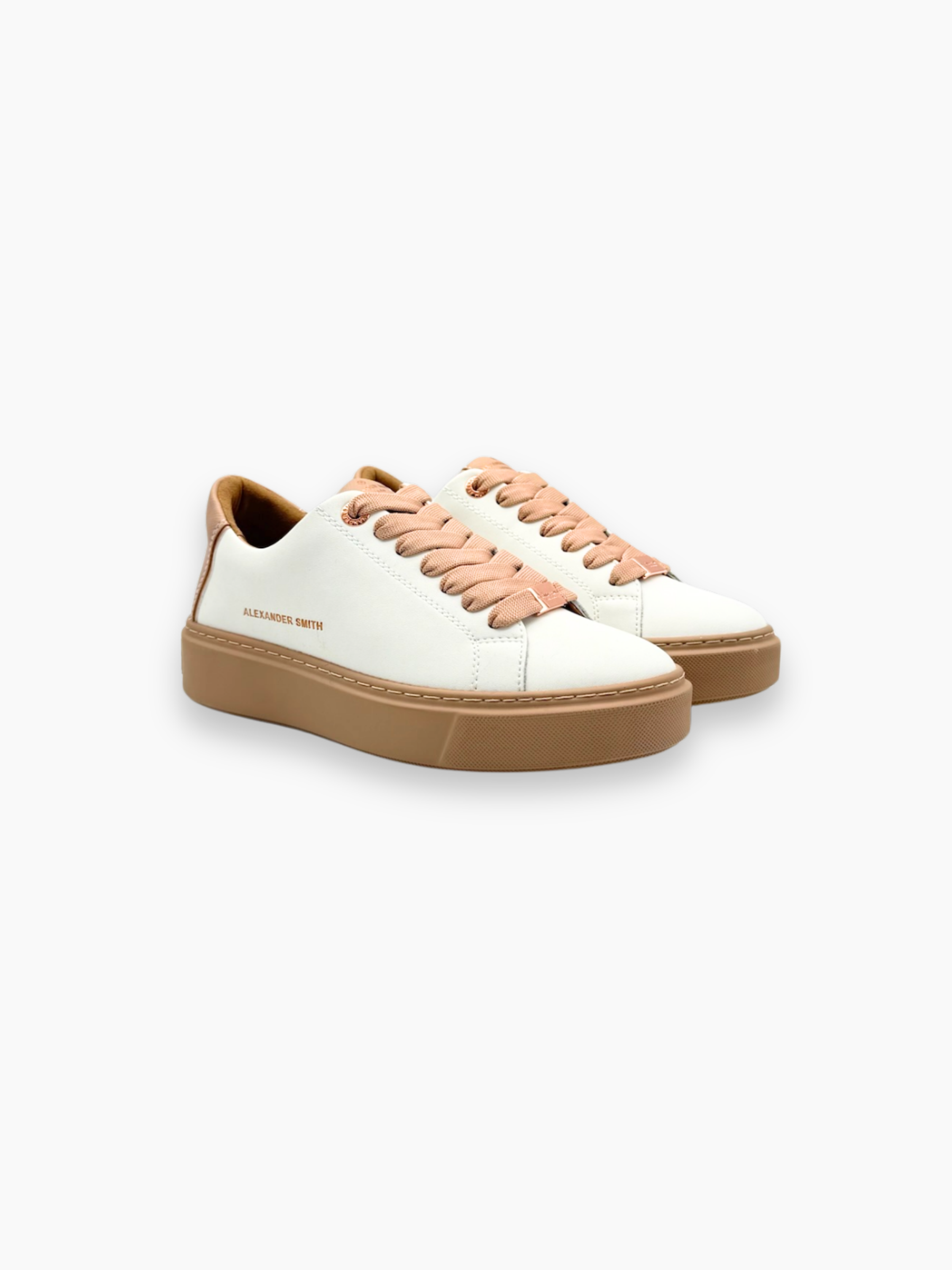 Sneakers Alexander Smith dallo stile contemporaneo e raffinato. Realizzate in pelle bianca con dettagli nude e finiture metalliche, combinano linee pulite e dettagli luminosi per un look versatile e sofisticato, ideale per tutti i giorni.