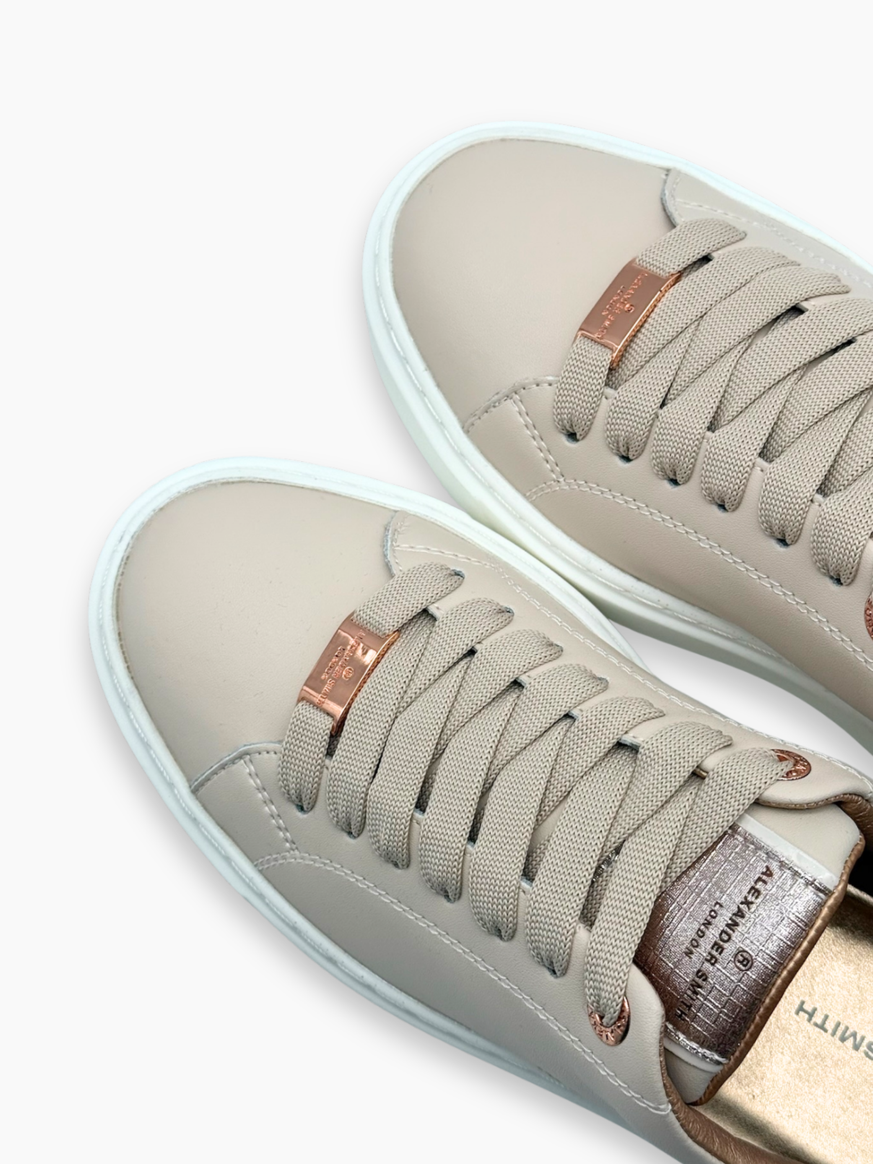 Sneakers basse Alexander Smith dallo stile sofisticato e femminile. Realizzate in pelle color crema con dettagli dorati, si distinguono per il loro design essenziale e il look luminoso, ideale per completare outfit eleganti e casual.