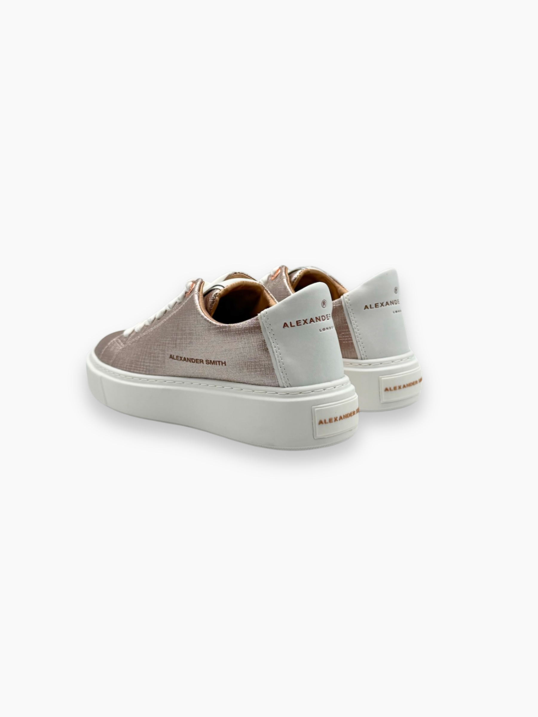 Sneakers basse dallo stile luminoso e moderno, realizzate in pelle dorata con finitura metallizzata e dettagli bianchi a contrasto. Il design minimal e la suola platform in gomma donano un tocco elegante e contemporaneo, ideale per completare outfit casual o chic con un accento sofisticato.