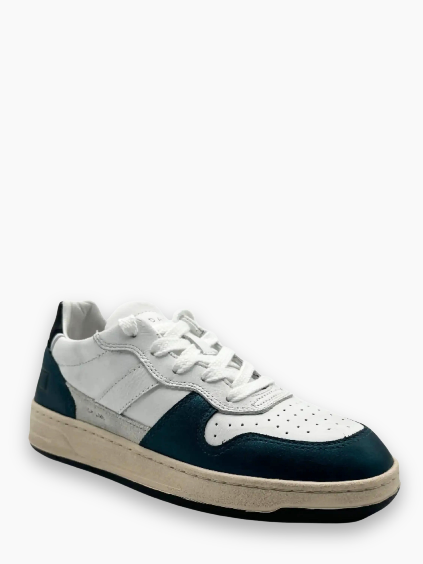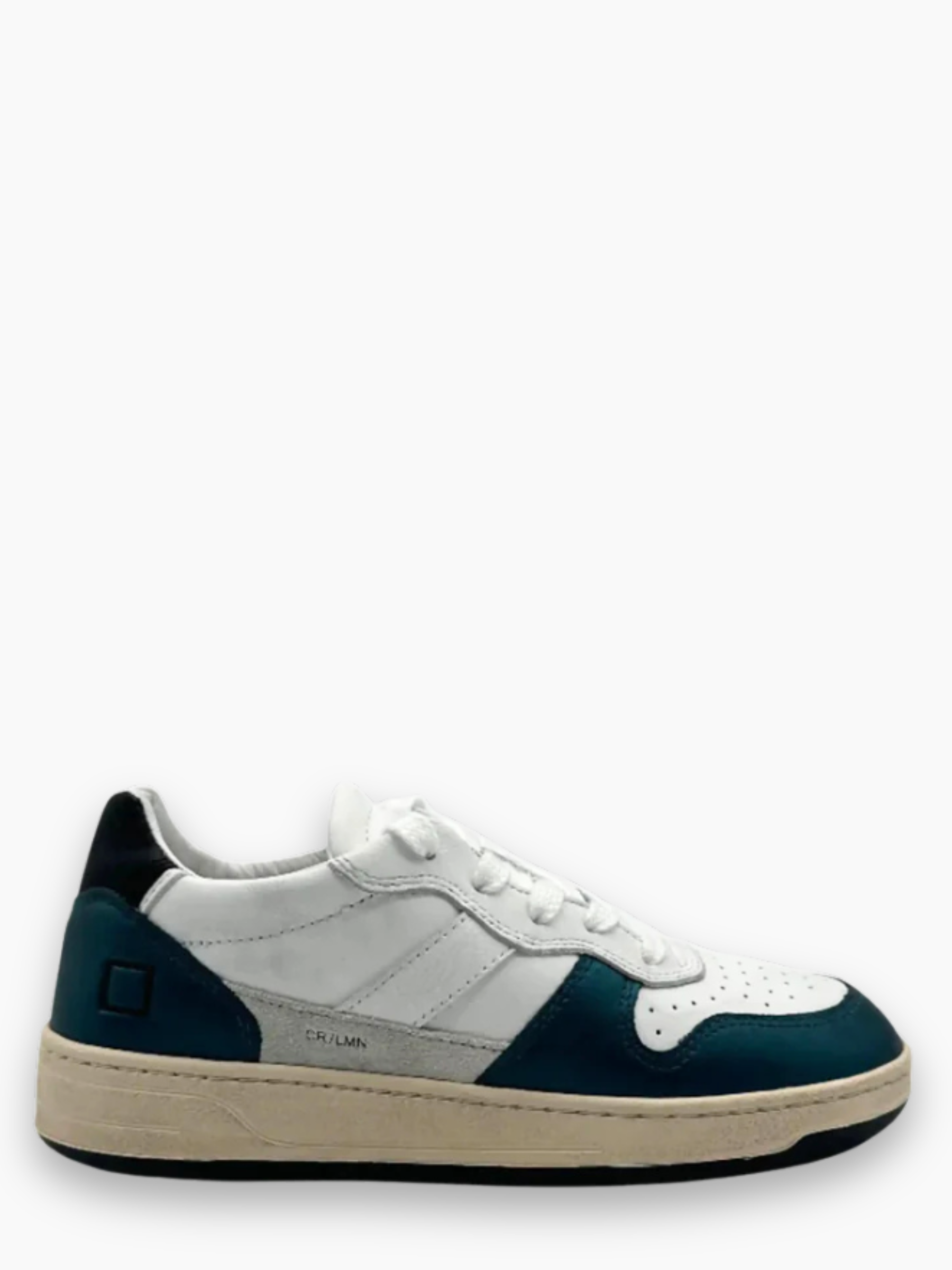 Sneakers Court 2.0 di D.A.T.E. con tomaia in pelle laminata bianca e inserti verdi. Il design ispirato ai modelli da tennis vintage si fonde con dettagli contemporanei, rendendo questa scarpa versatile per look casual e sportivi. La suola in gomma effetto used completa lo stile con un tocco autentico e urbano.