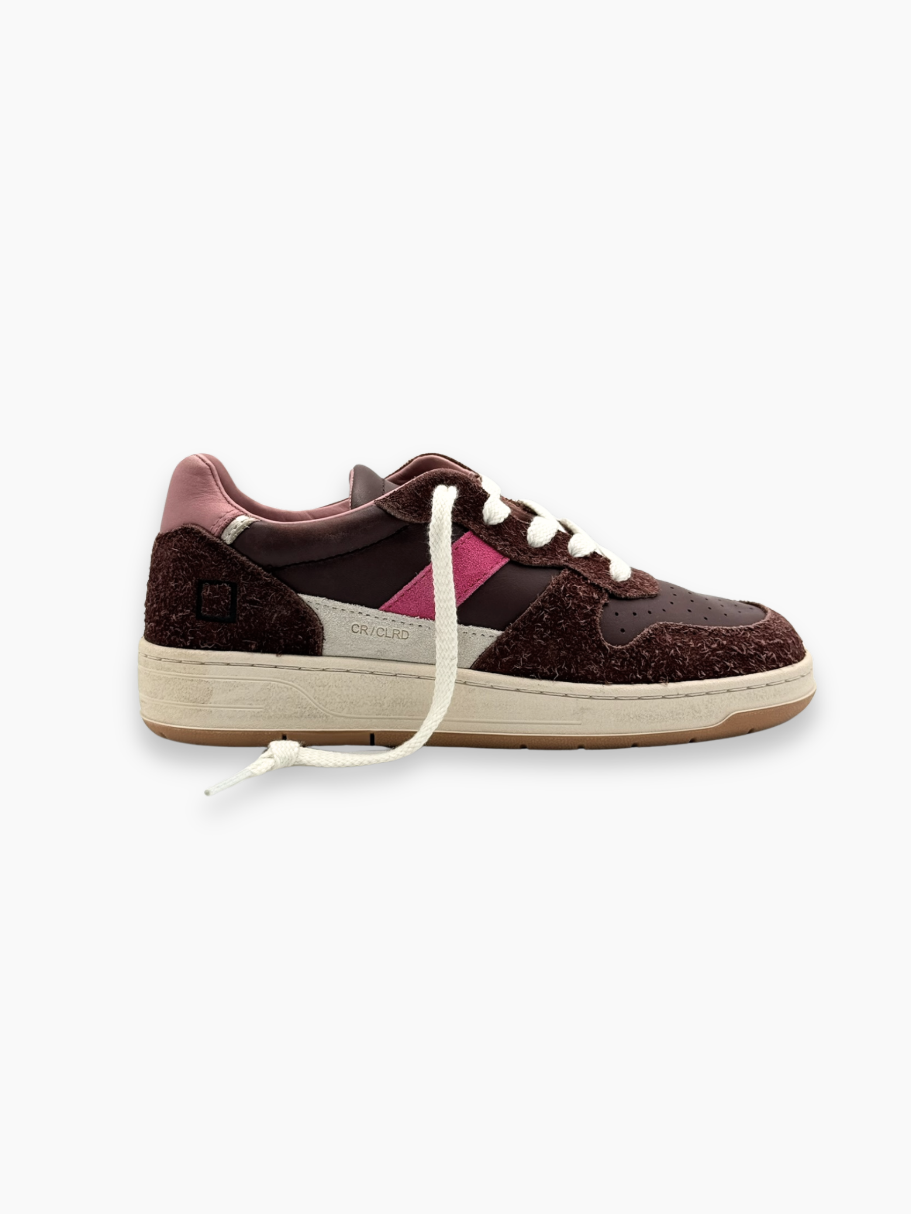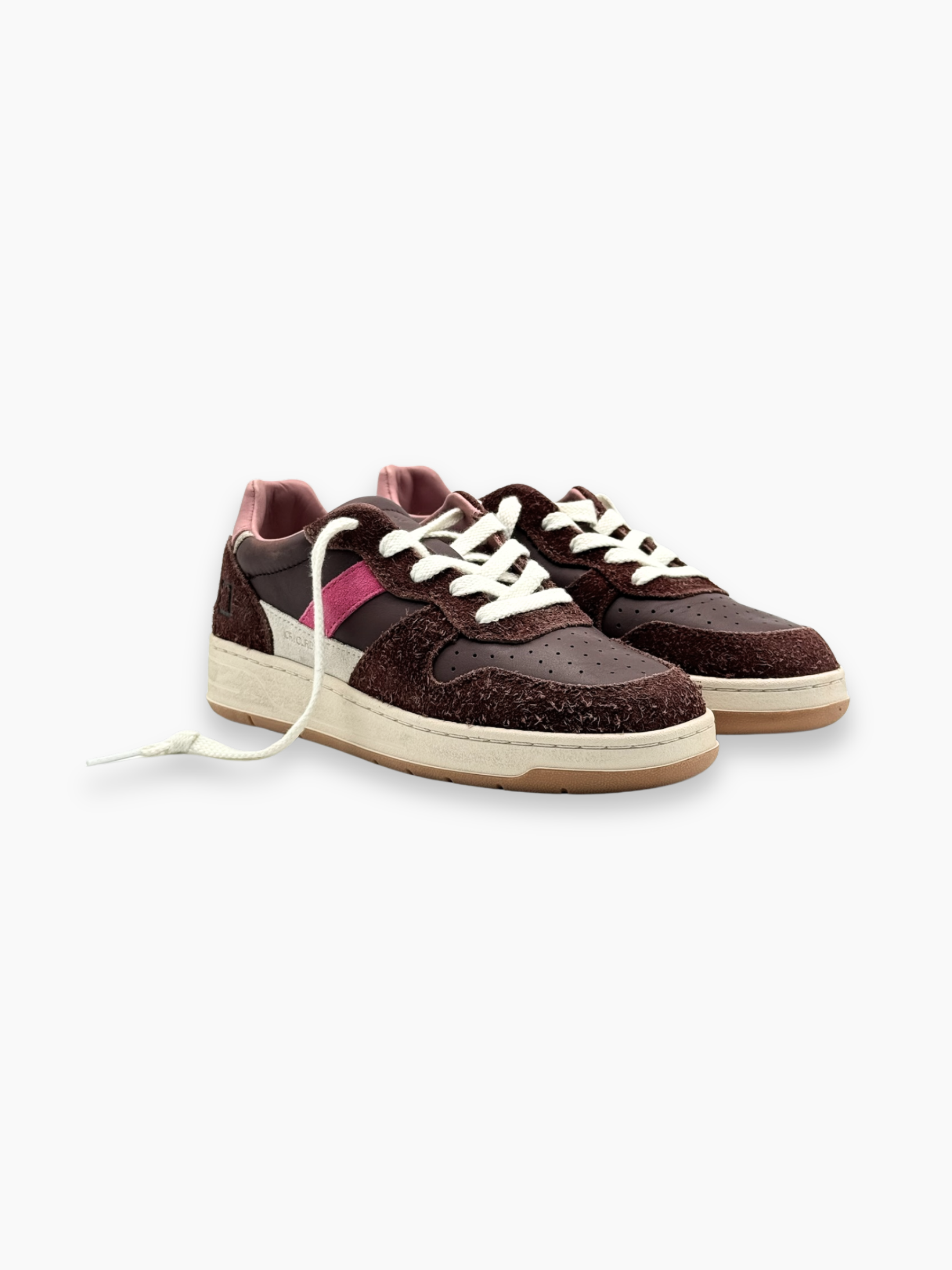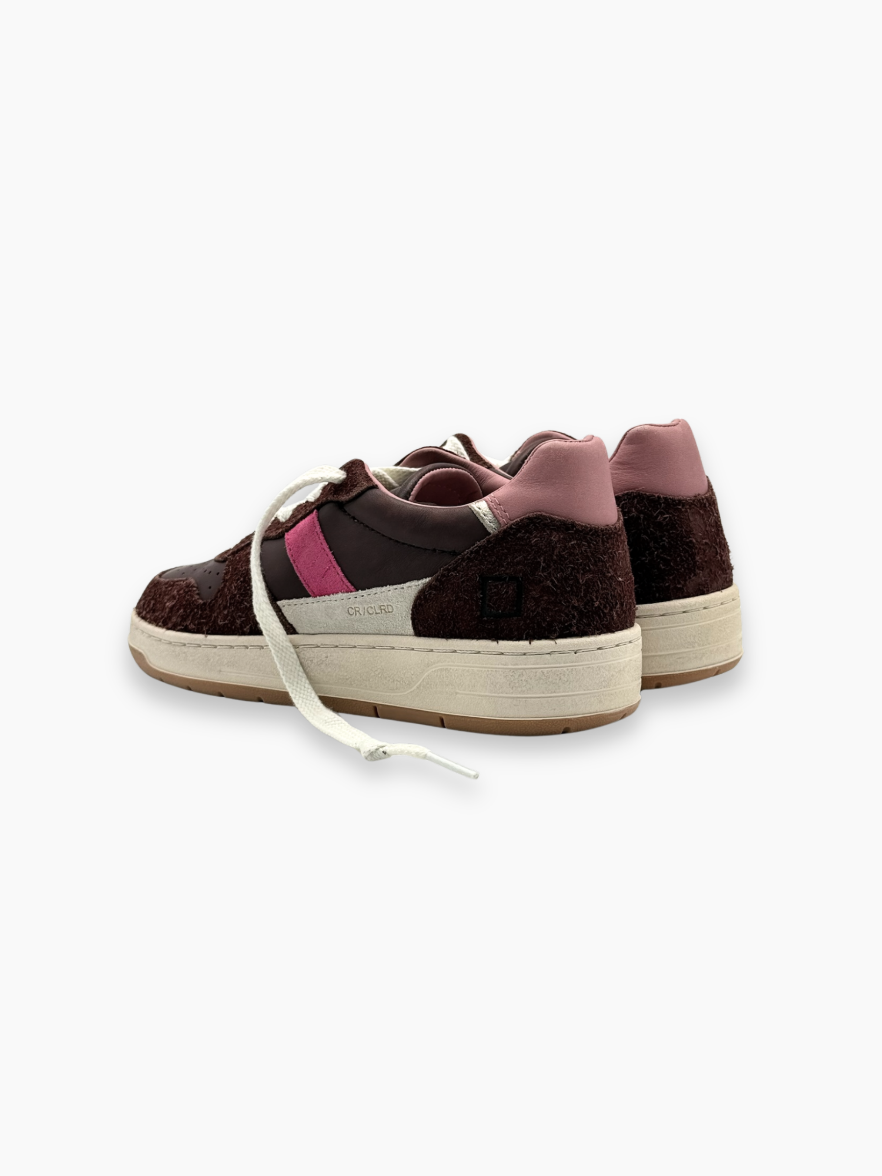 Sneakers D.A.T.E. Court 2.0 dal design rétro e raffinato, realizzate in pelle e suede color cioccolato con dettagli rosa acceso. Un mix di materiali e colori che dona un tocco vivace ai look casual femminili, mantenendo il comfort e lo stile distintivo del brand.