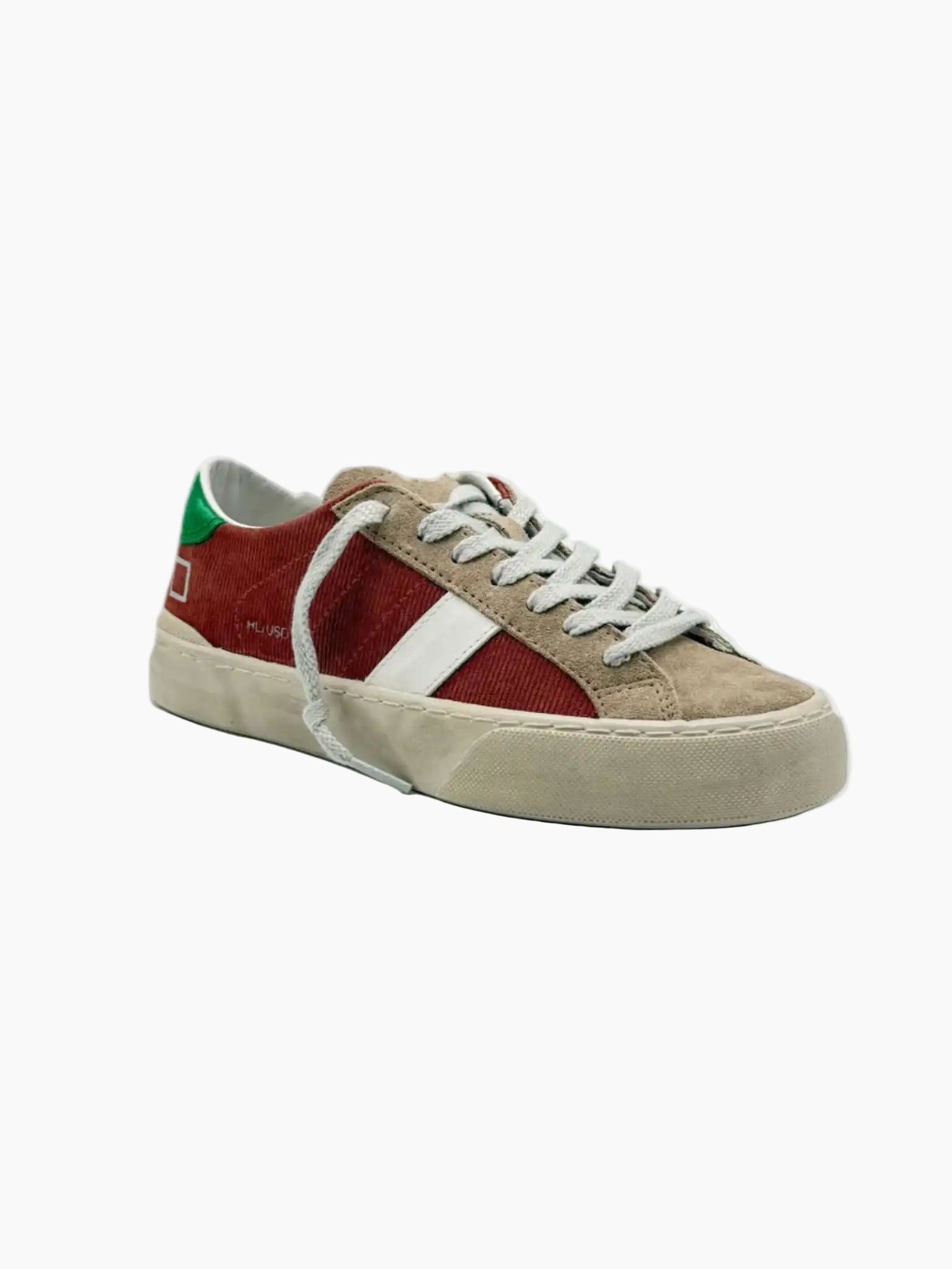 Le sneakers Hill Low Used di D.A.T.E. si distinguono per il loro mix di materiali e l’estetica rétro. Realizzate in tessuto effetto corda color phard con inserti in suede beige e dettagli in pelle bianca, sono rifinite con talloncino verde e scritta "HILL/USED" impressa lateralmente. La suola effetto used dona un tocco urbano vissuto. Un modello perfetto per completare look casual con un twist originale.