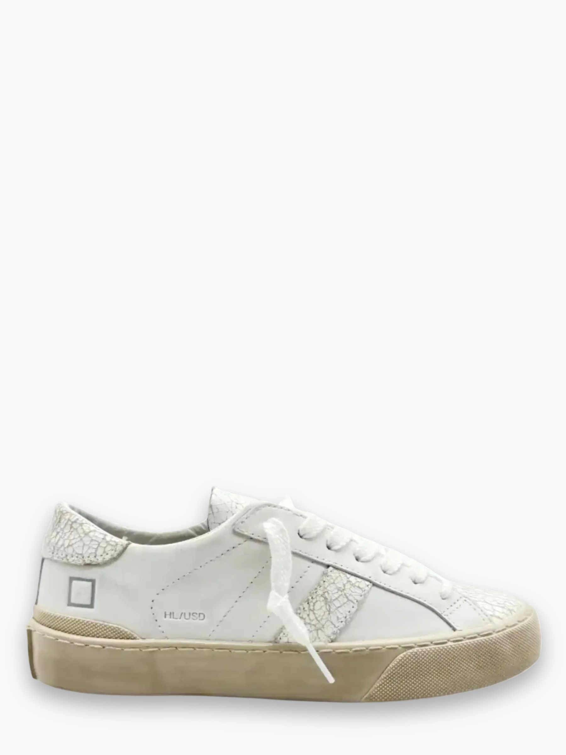 Le sneakers Hillow Used White firmate D.A.T.E. si distinguono per il loro look contemporaneo e vissuto. Realizzate in pelle bianca con inserti screziati effetto craquelé, presentano un design essenziale ma ricercato, arricchito da una suola in gomma a contrasto che dona un tocco vintage. Comode, versatili e perfette per completare outfit casual o urbani con un dettaglio unico.