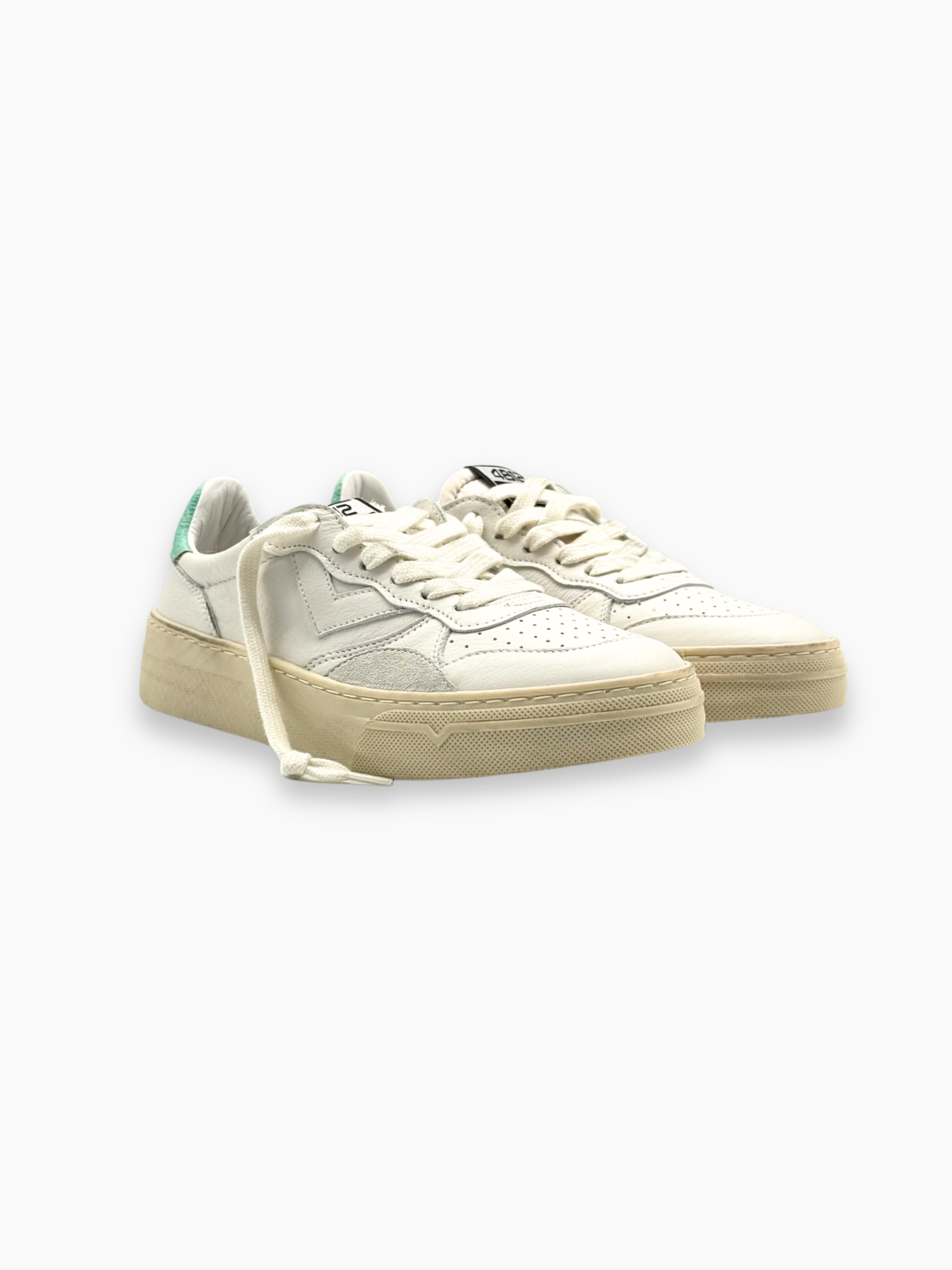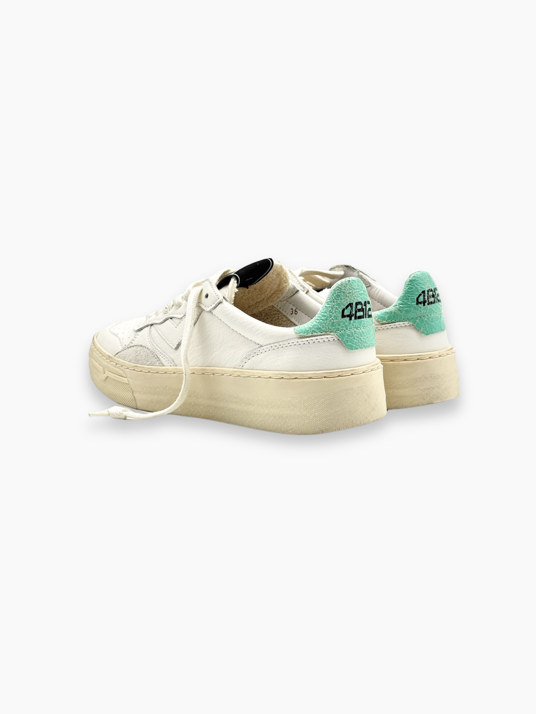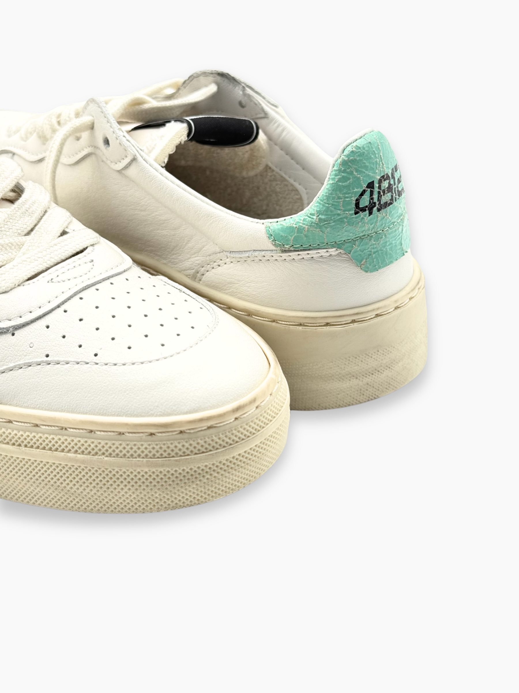 Sneakers 4B12 dallo stile pulito e moderno, caratterizzate da linee morbide e dettagli color acqua che donano freschezza al design. Realizzate in morbida pelle bianca, rappresentano l’equilibrio perfetto tra comfort e versatilità, ideali per un look casual e contemporaneo.