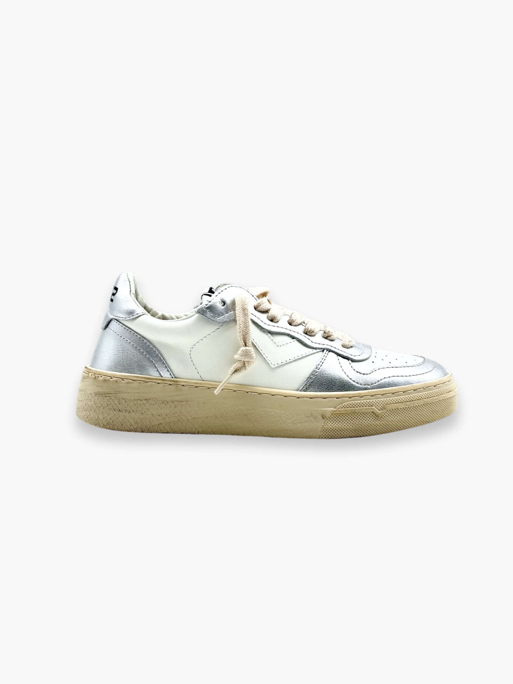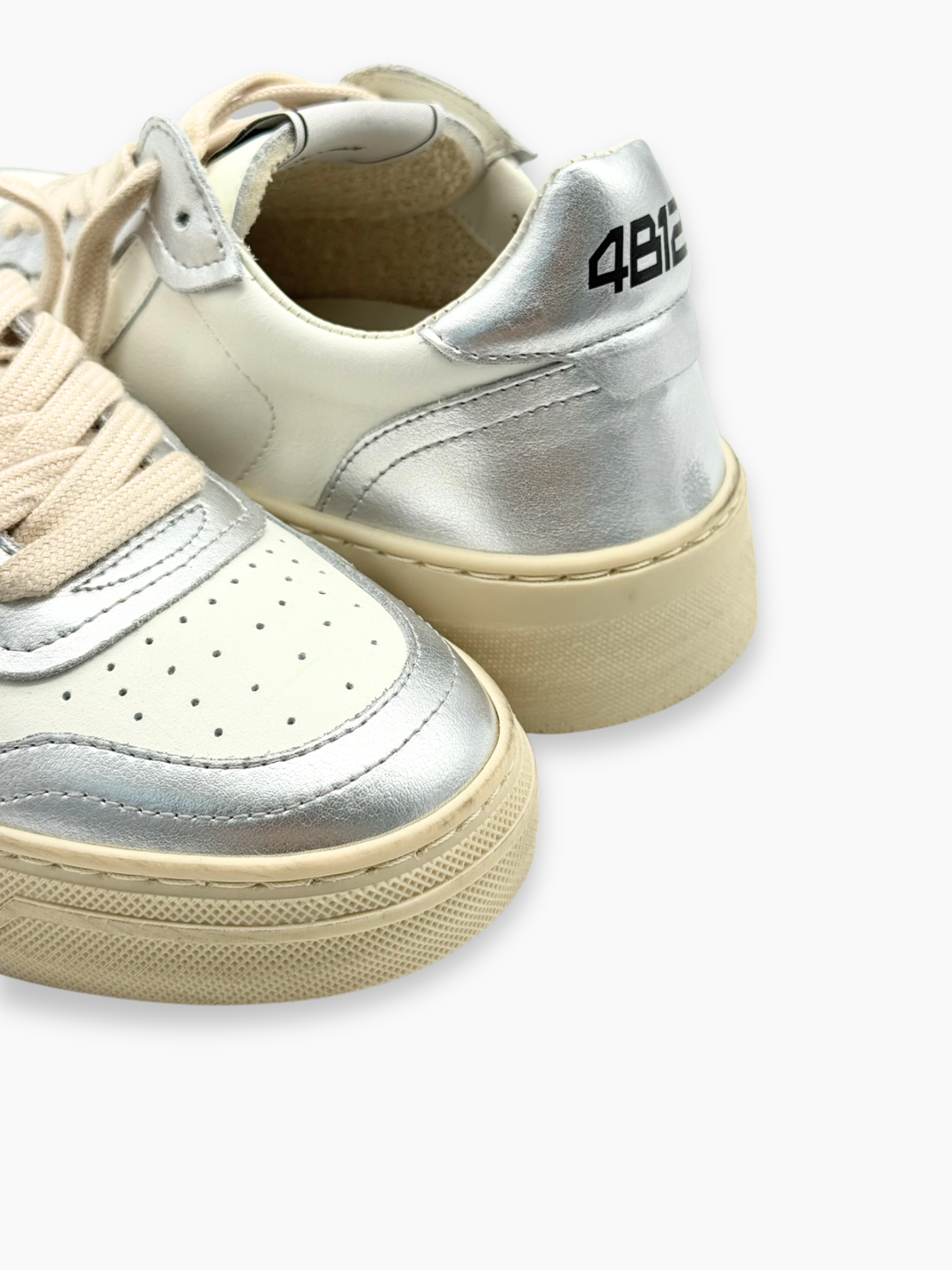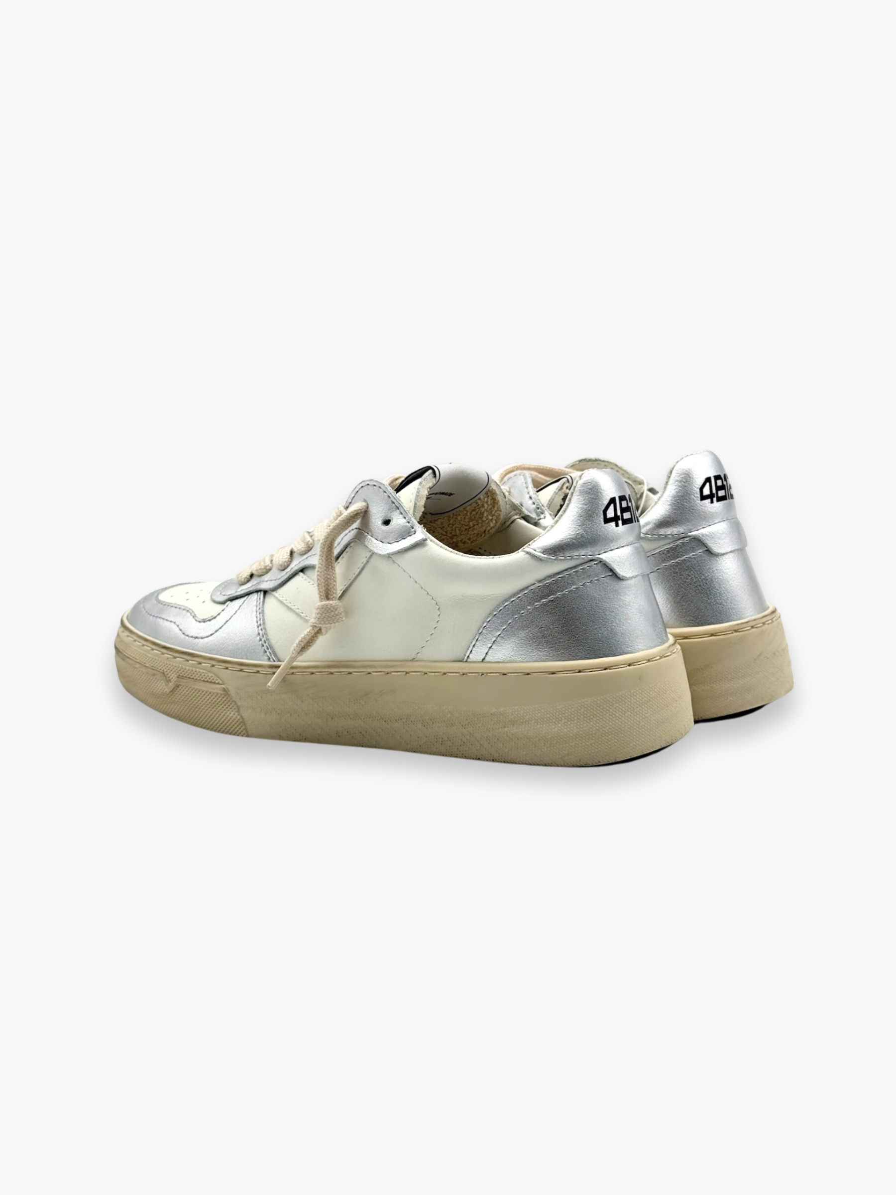 Sneakers 4B12 dal design urban-chic con dettagli metallici. Realizzate in pelle bianca con inserti in pelle laminata argento, combinano stile sportivo e luminosità contemporanea. Ideali per valorizzare look casual o per aggiungere un tocco brillante agli outfit quotidiani.