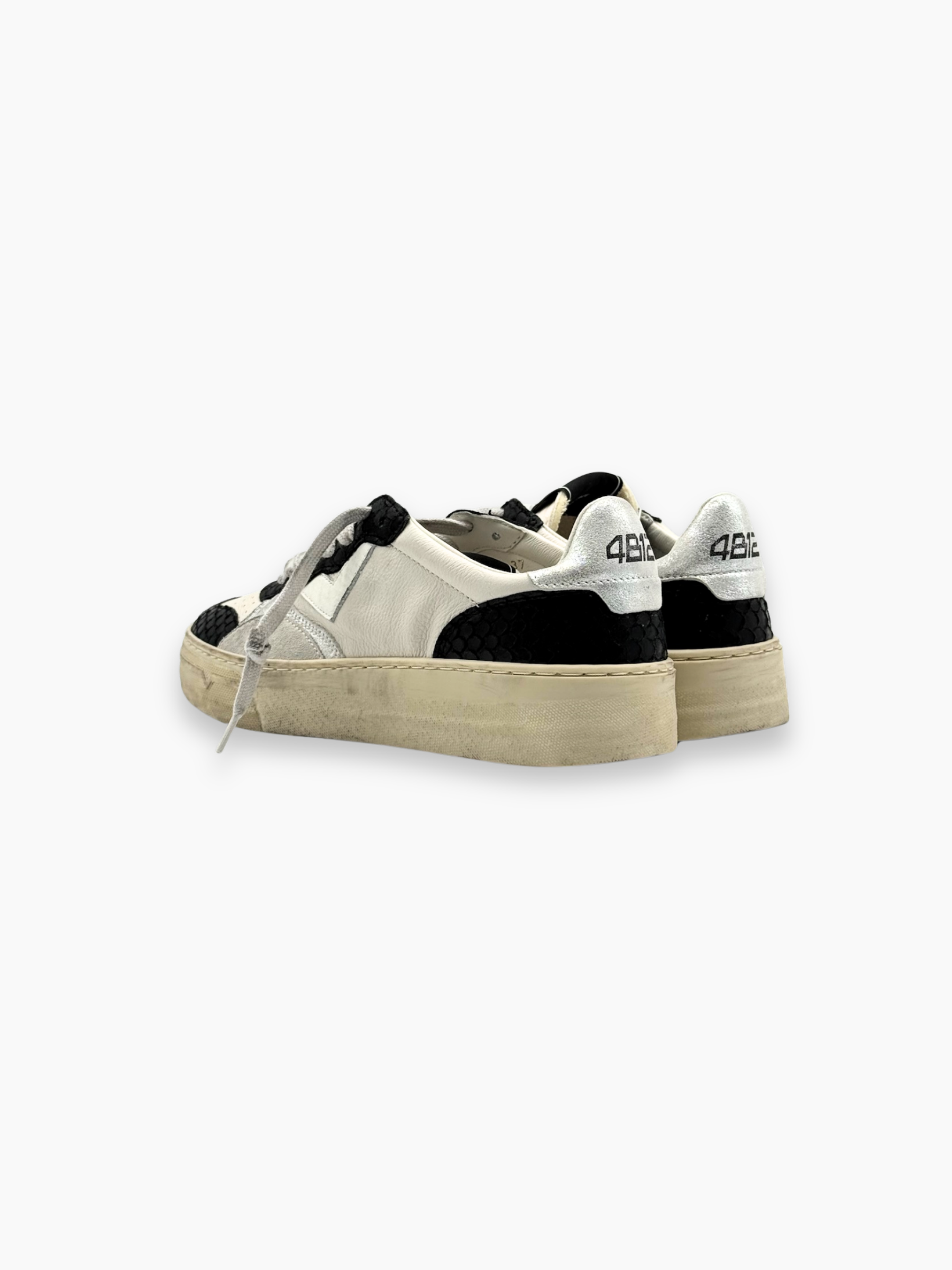 Sneakers 4B12 dal look deciso e contemporaneo. Realizzate in pelle bianca con inserti neri effetto pitonato, uniscono texture e materiali diversi per un’estetica urbana e sofisticata. Ideali per aggiungere un tocco cool e ricercato agli outfit casual di tutti i giorni.