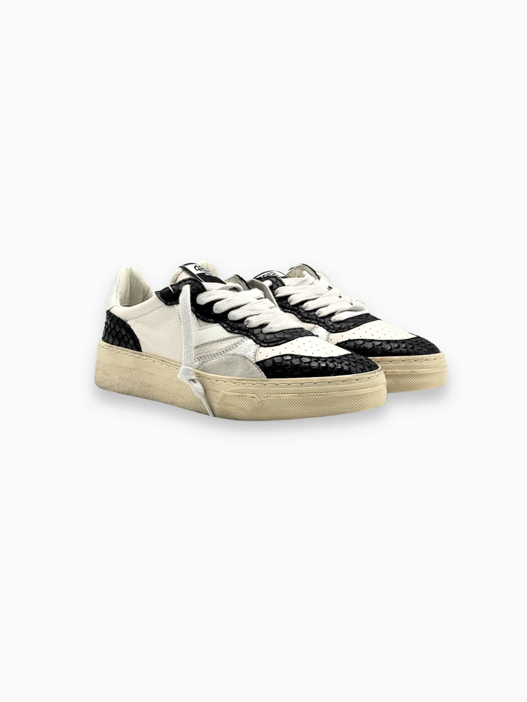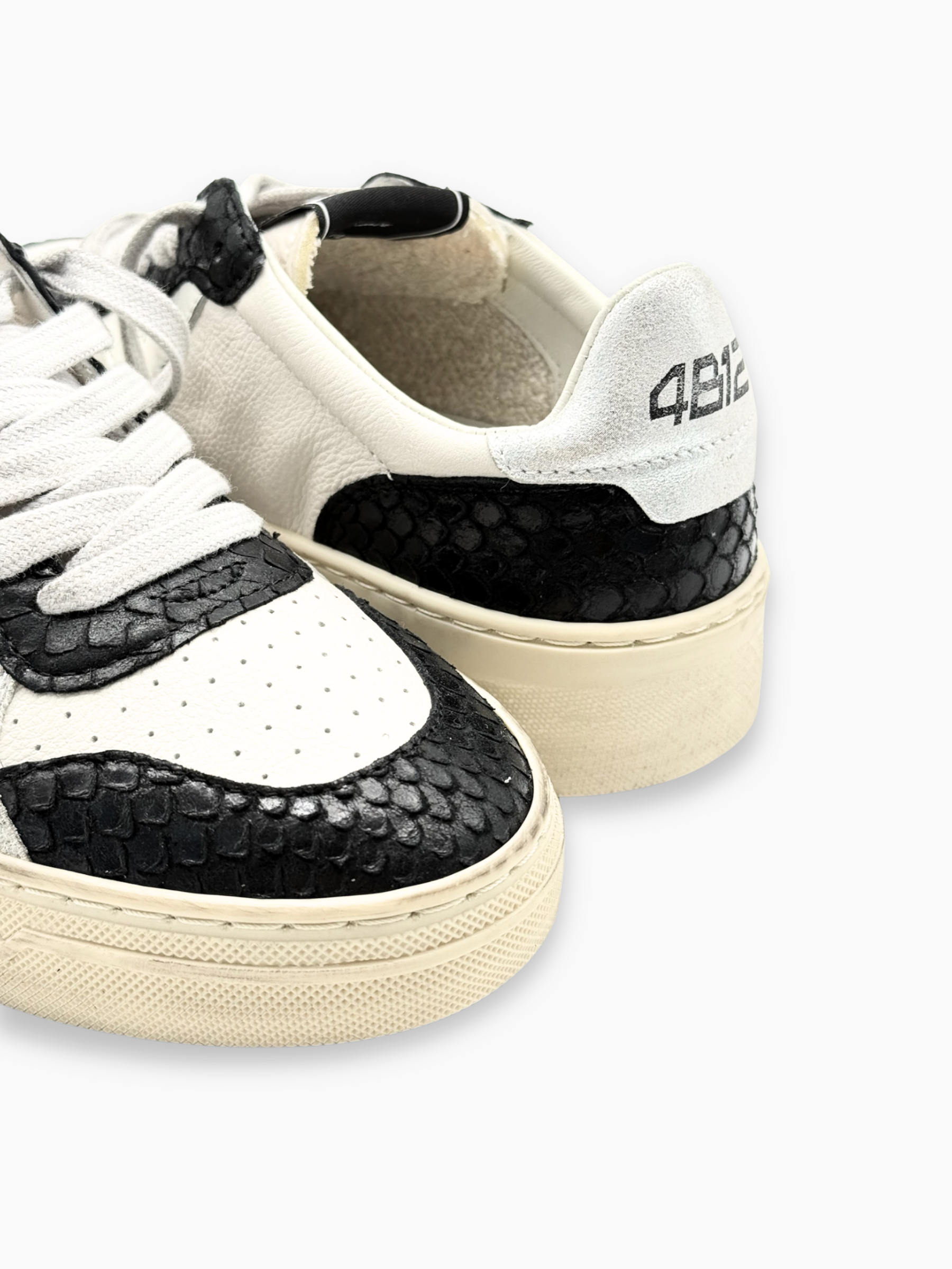 · Tomaia in pelle bianca liscia con inserti effetto pitonato neri
