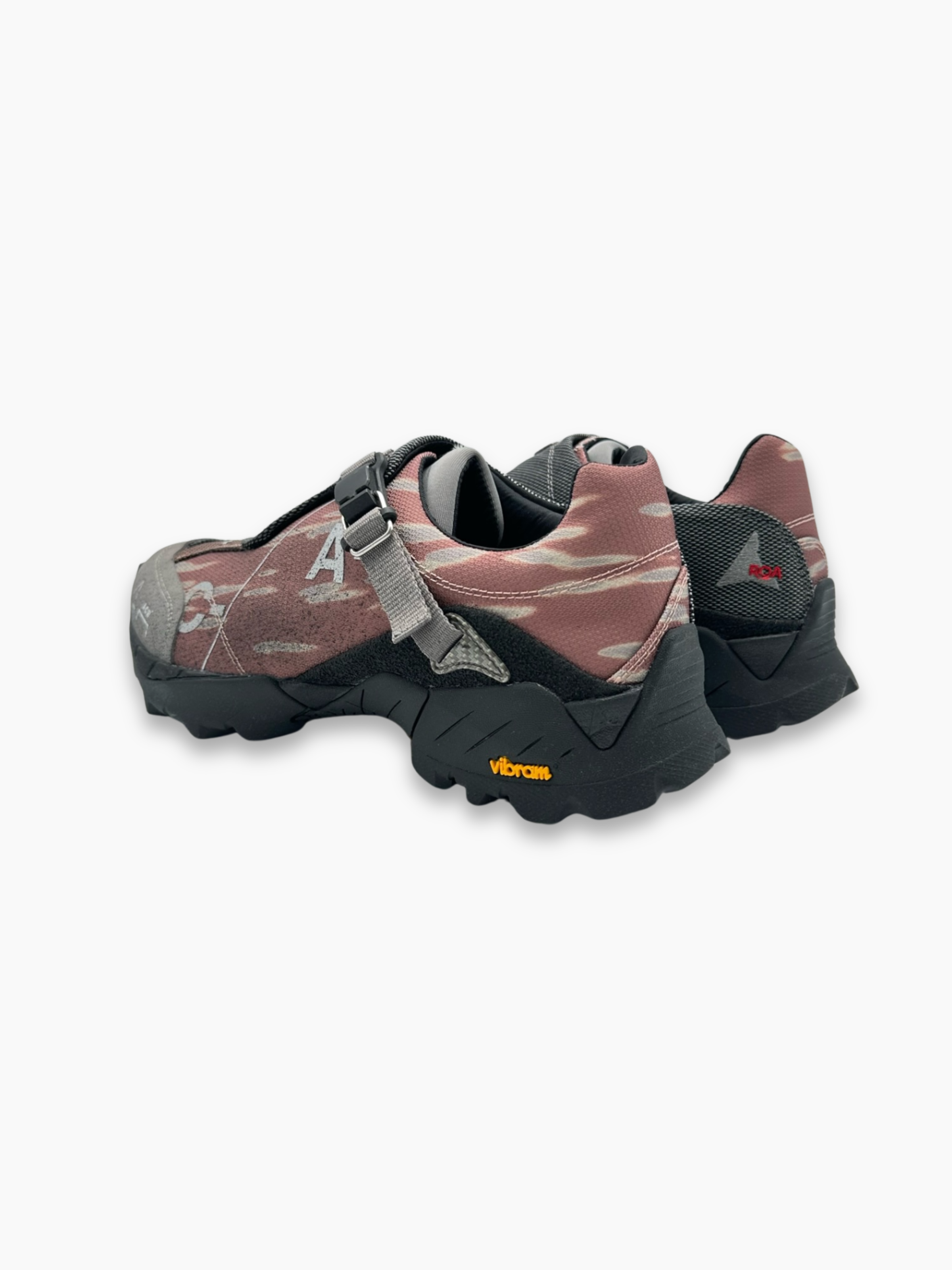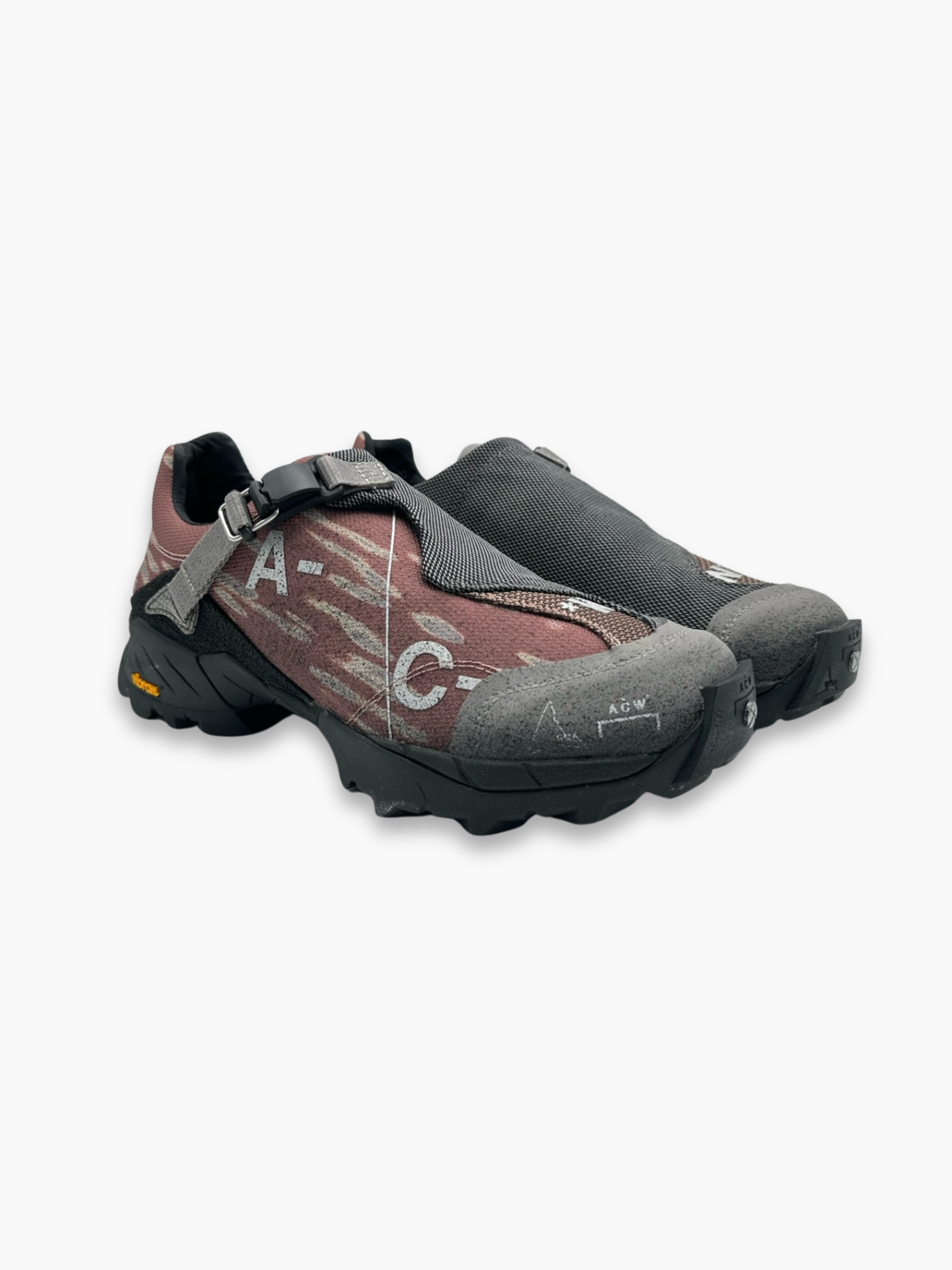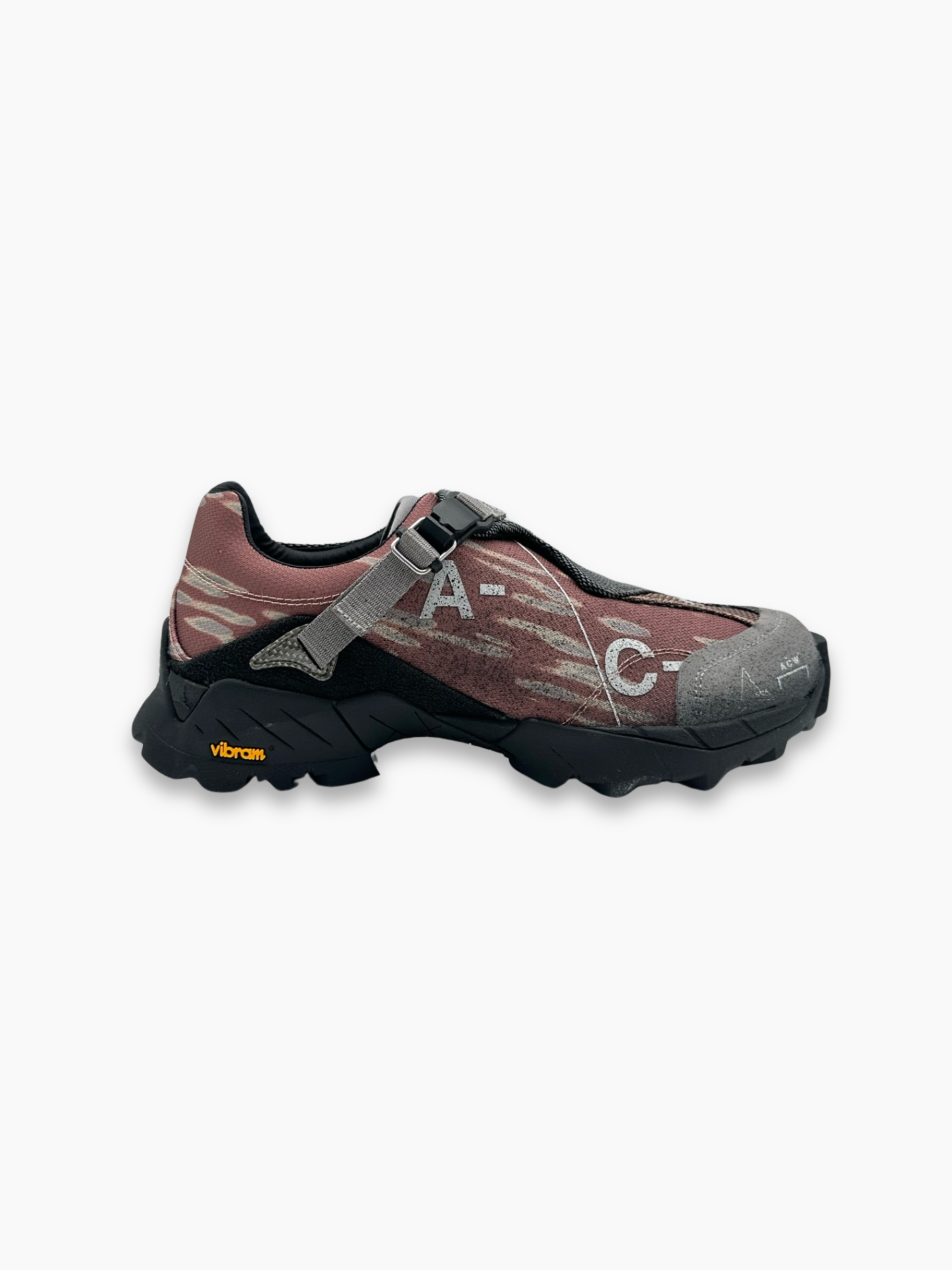 Sneakers A-COLD-WALL* modello Minaar in tonalità rosa con dettagli grigi e neri. La tomaia tecnica in mesh e tessuto è arricchita da una fascia a strappo diagonale con chiusura regolabile e branding ACW stampato in bianco. Il design futuristico si completa con suola Vibram nera, scolpita per la massima aderenza, perfetta per affrontare ogni terreno con stile.