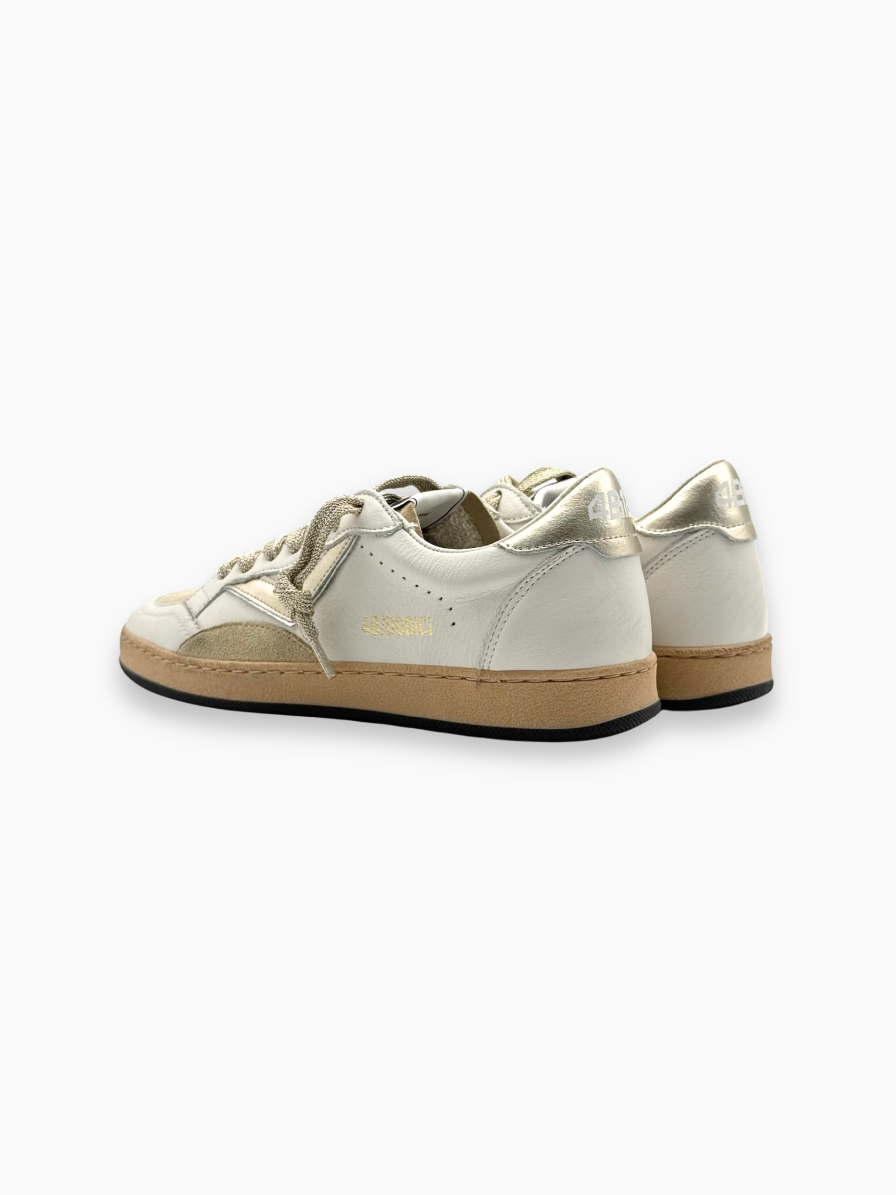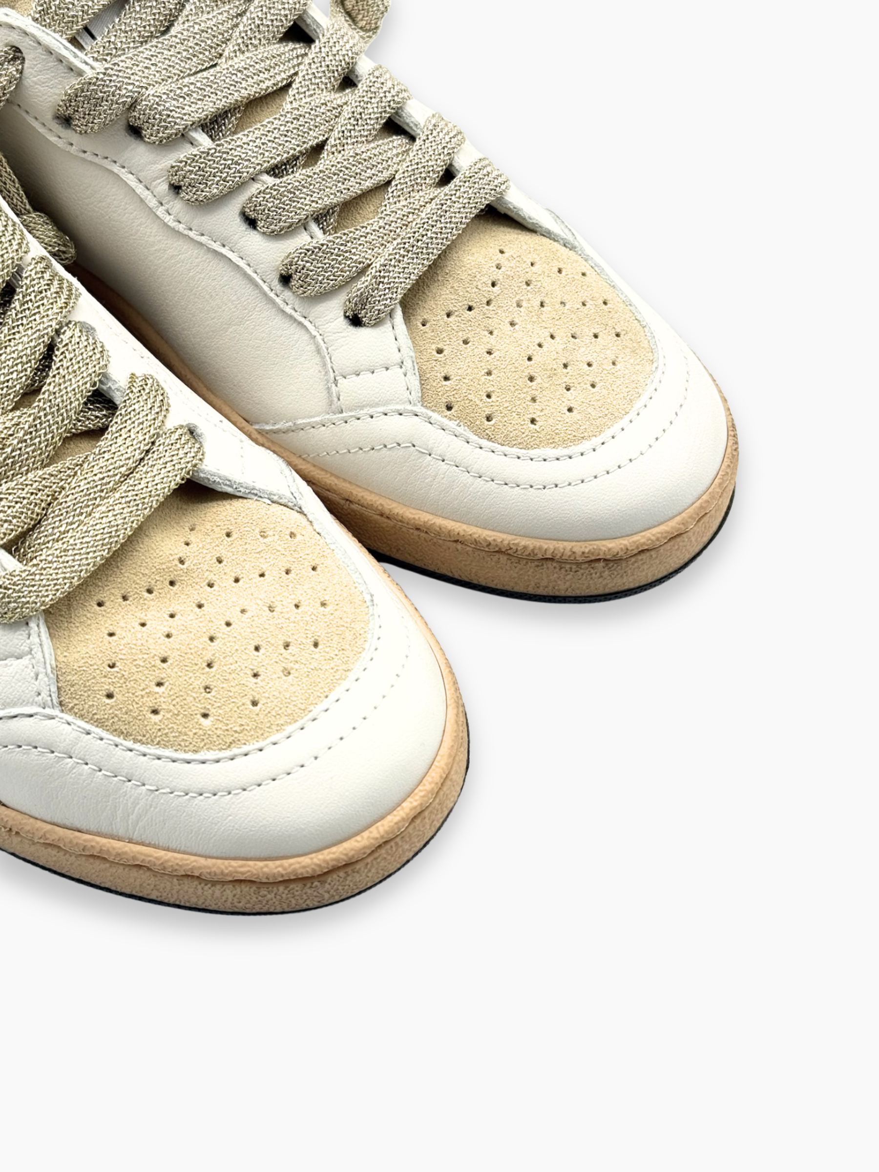 Sneakers 4B12 dal fascino contemporaneo e luminoso. Realizzate in pelle bianca con inserti scamosciati color champagne, presentano lacci metallizzati e una suola effetto vintage che dona un tocco casual chic ad ogni look.