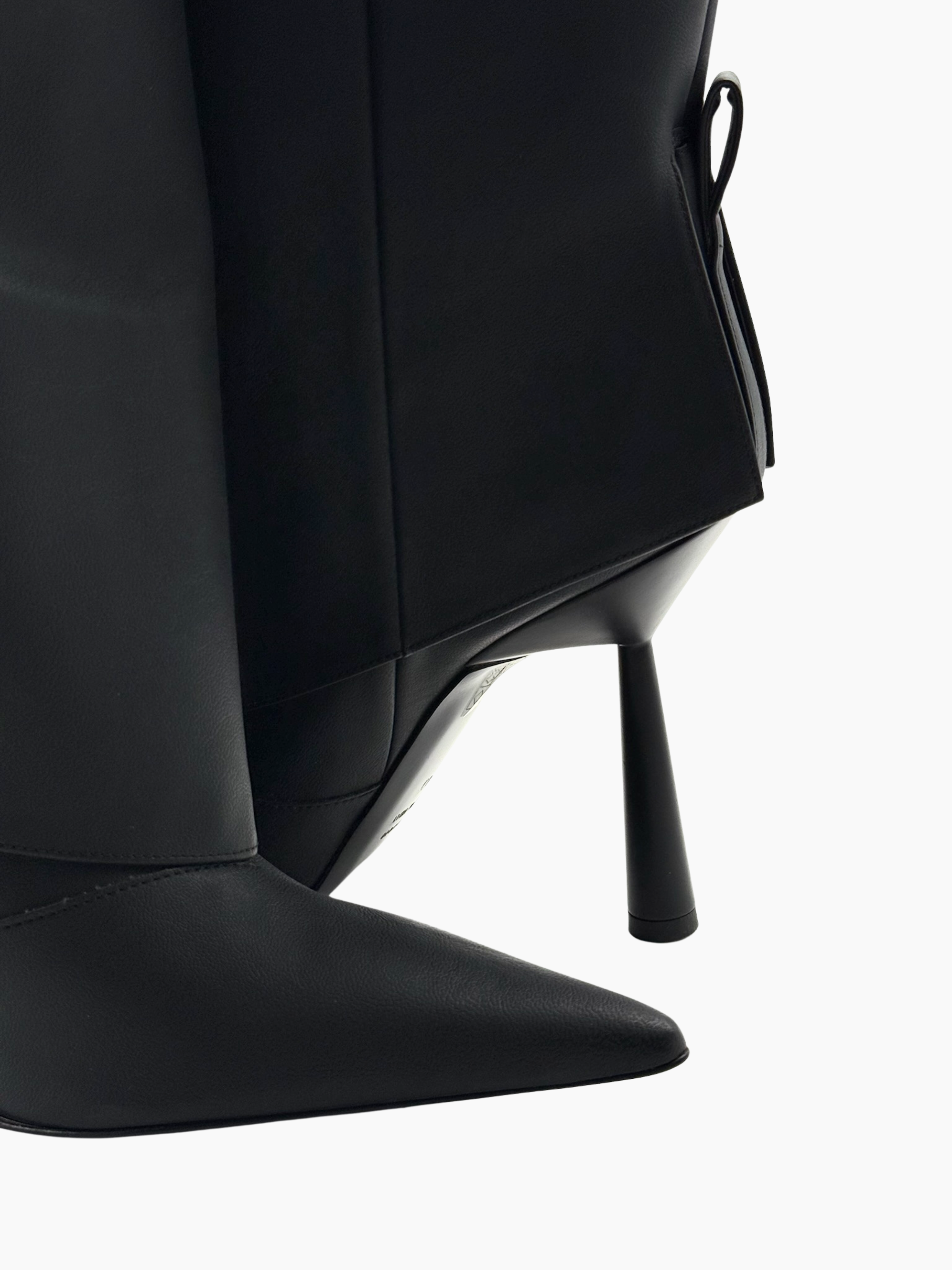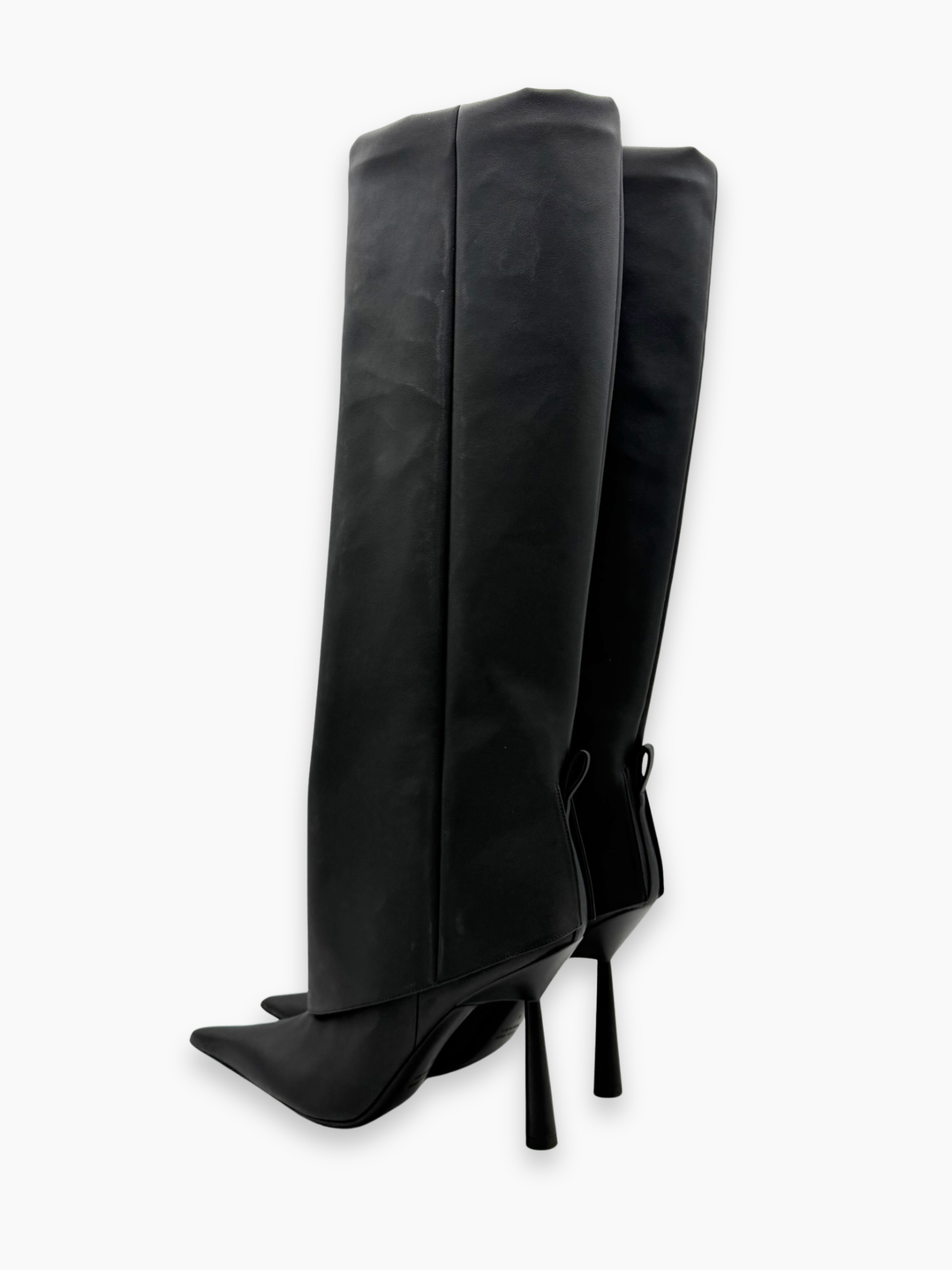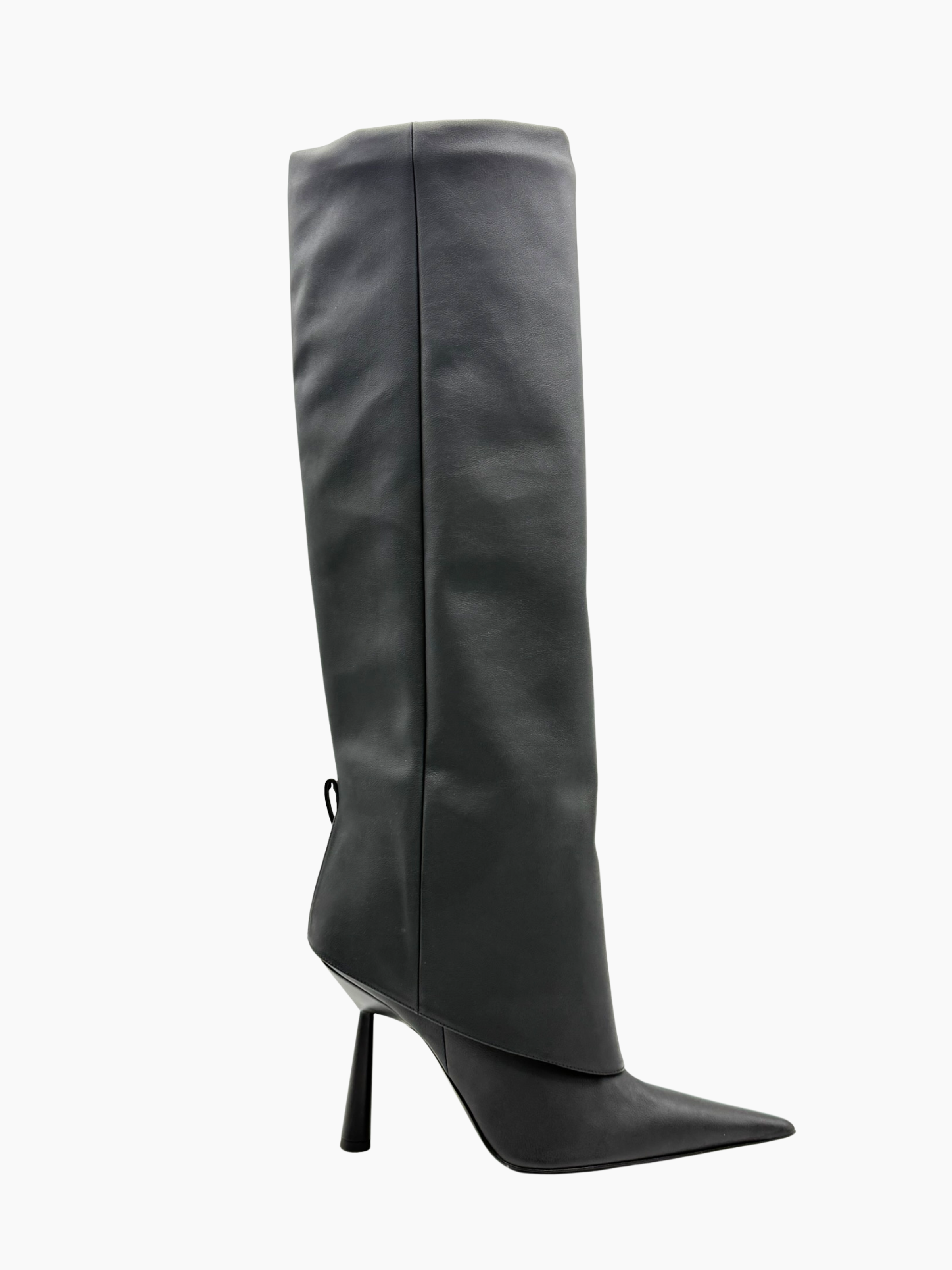 Stivale in pelle nera firmato Gia Borghini, caratterizzato da una silhouette sofisticata e femminile. Il design slanciato con punta affusolata e tacco scultoreo aggiunge eleganza e modernità al look. Un modello dallo stile deciso, ideale per completare outfit da giorno e da sera con un tocco contemporaneo.
