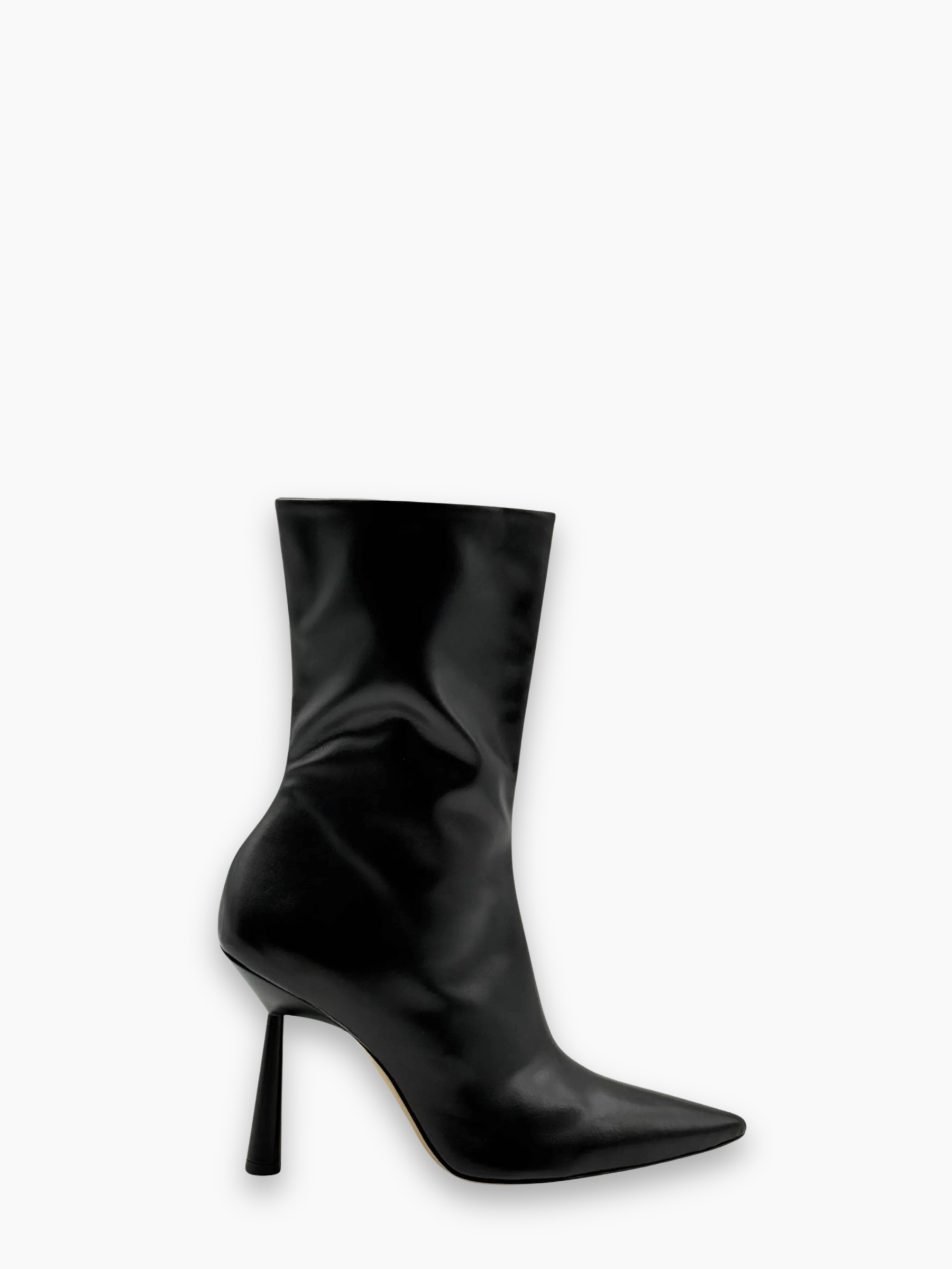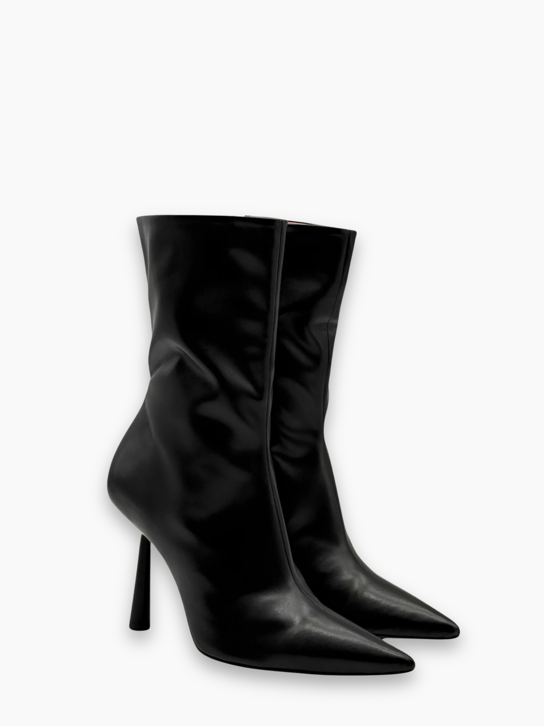Stivaletti alti realizzati in pelle nera liscia, caratterizzati da una silhouette elegante con punta affusolata e tacco a spillo sottile. Un modello versatile e sofisticato, perfetto per aggiungere carattere e femminilità a look sia da giorno che da sera.