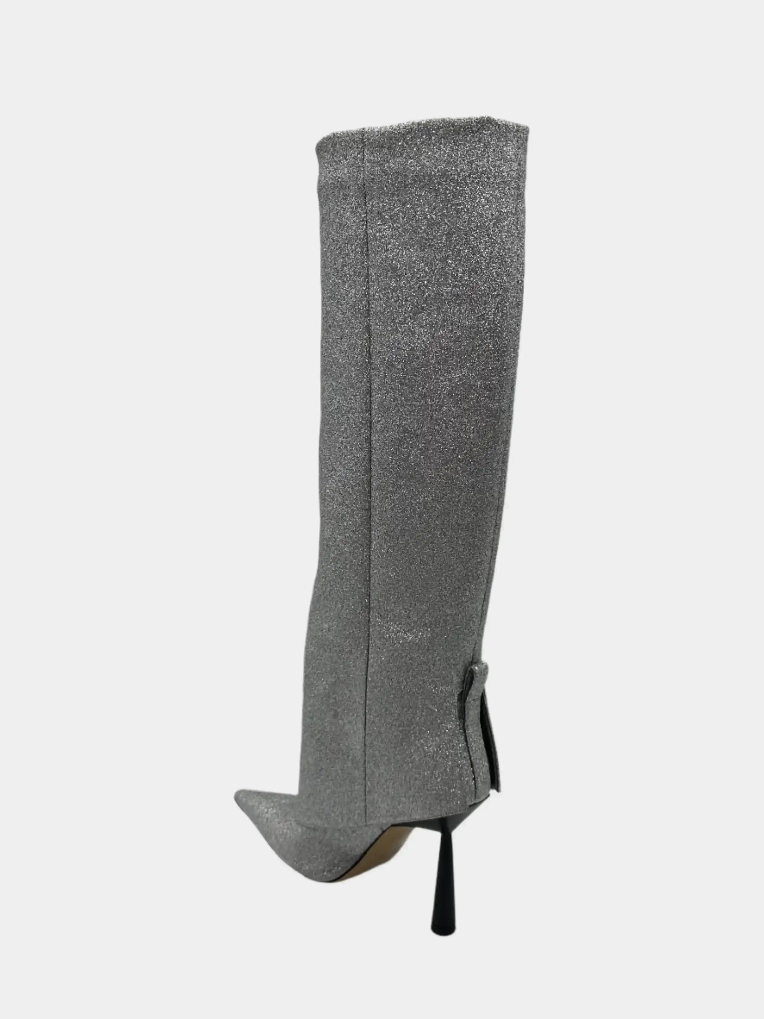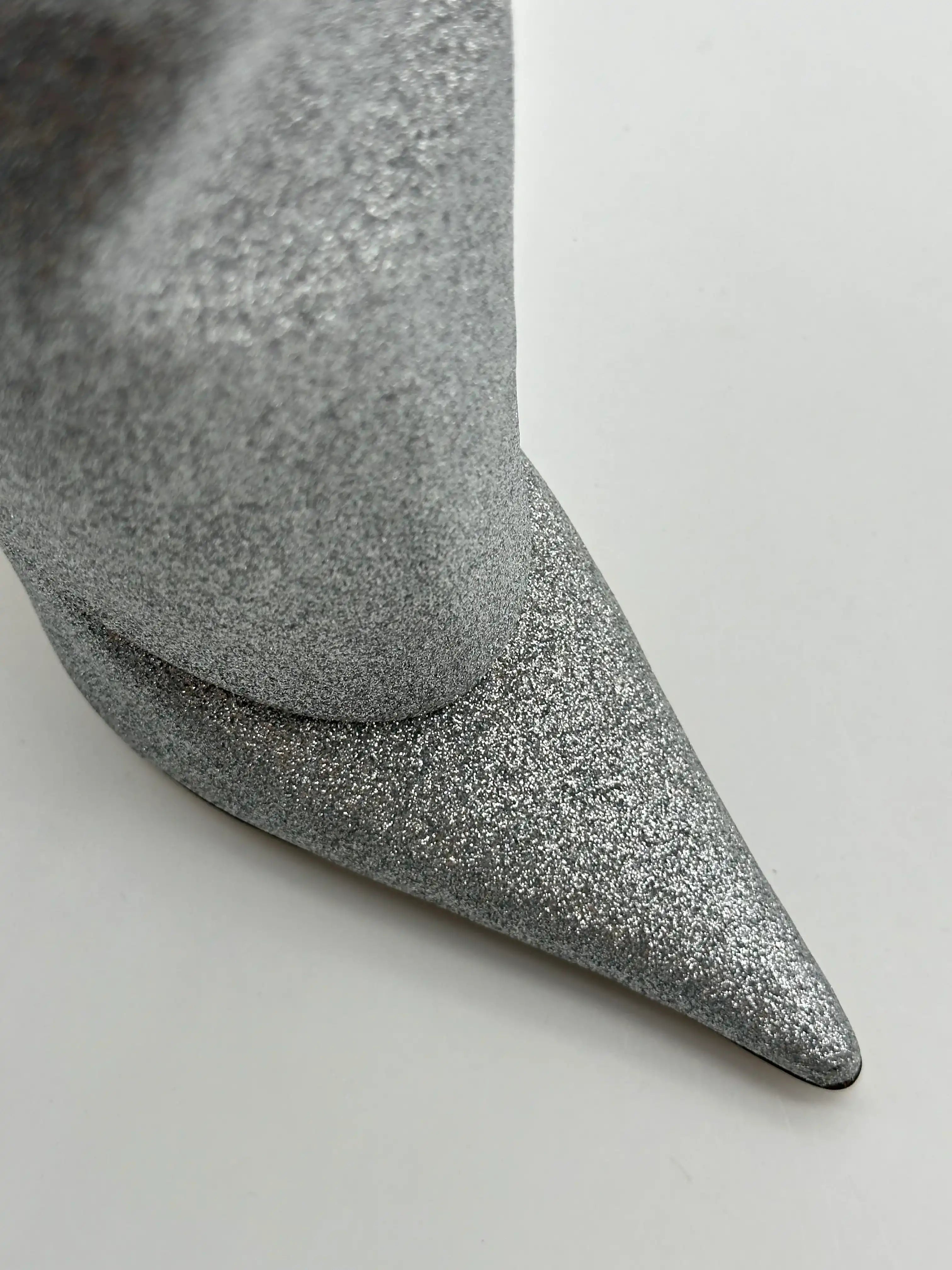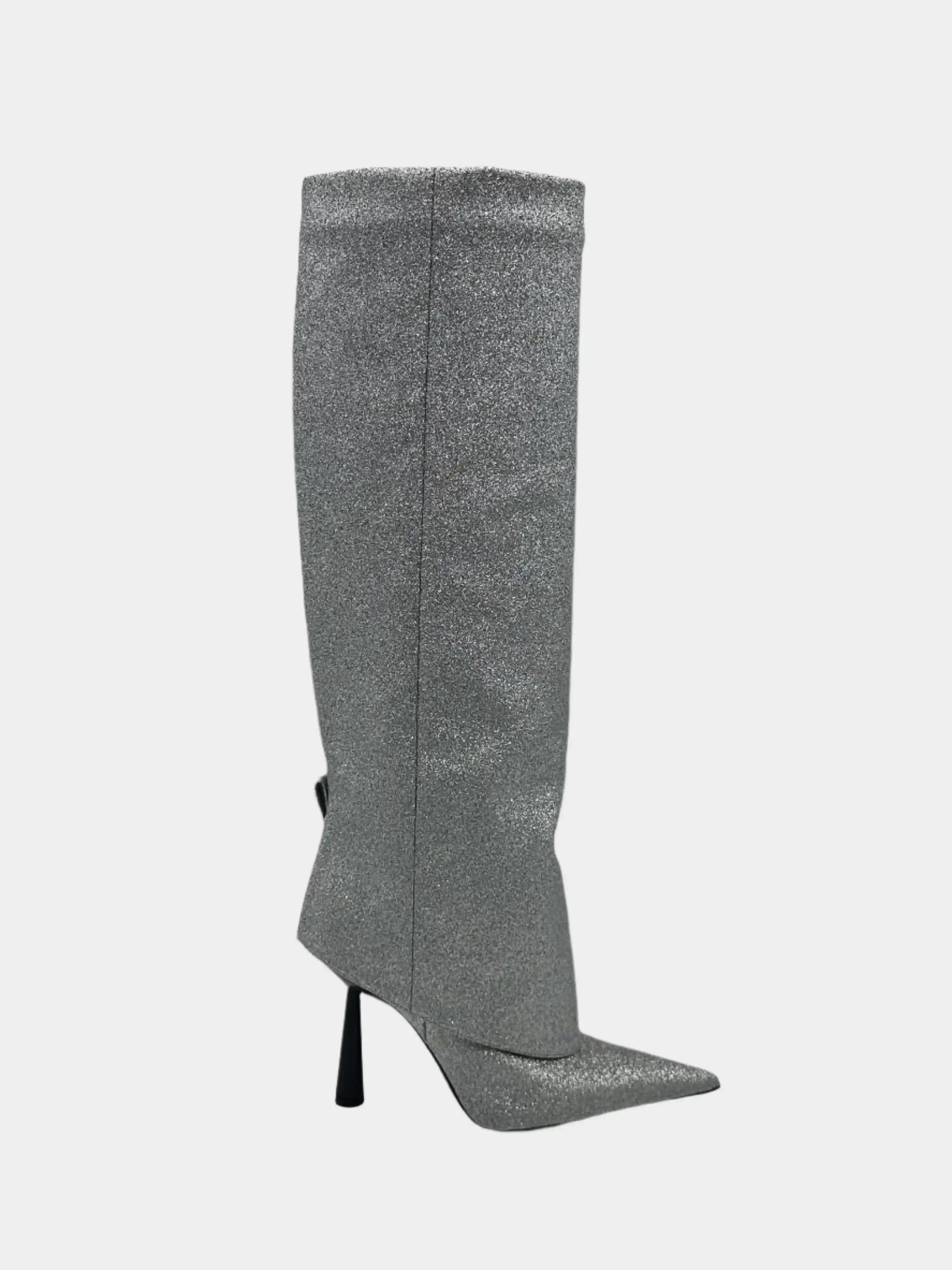 Gli stivali alti ROSIE 31 di Gia Borghini x RHW tornano in una versione scintillante e glamour. Completamente rivestiti in glitter argento, questi stivali catturano la luce ad ogni passo. La silhouette slanciata con punta a lancia, il tacco a stiletto cilindrico e l’interno rosa a contrasto rendono il modello una dichiarazione di stile perfetta per occasioni speciali e look d'effetto.