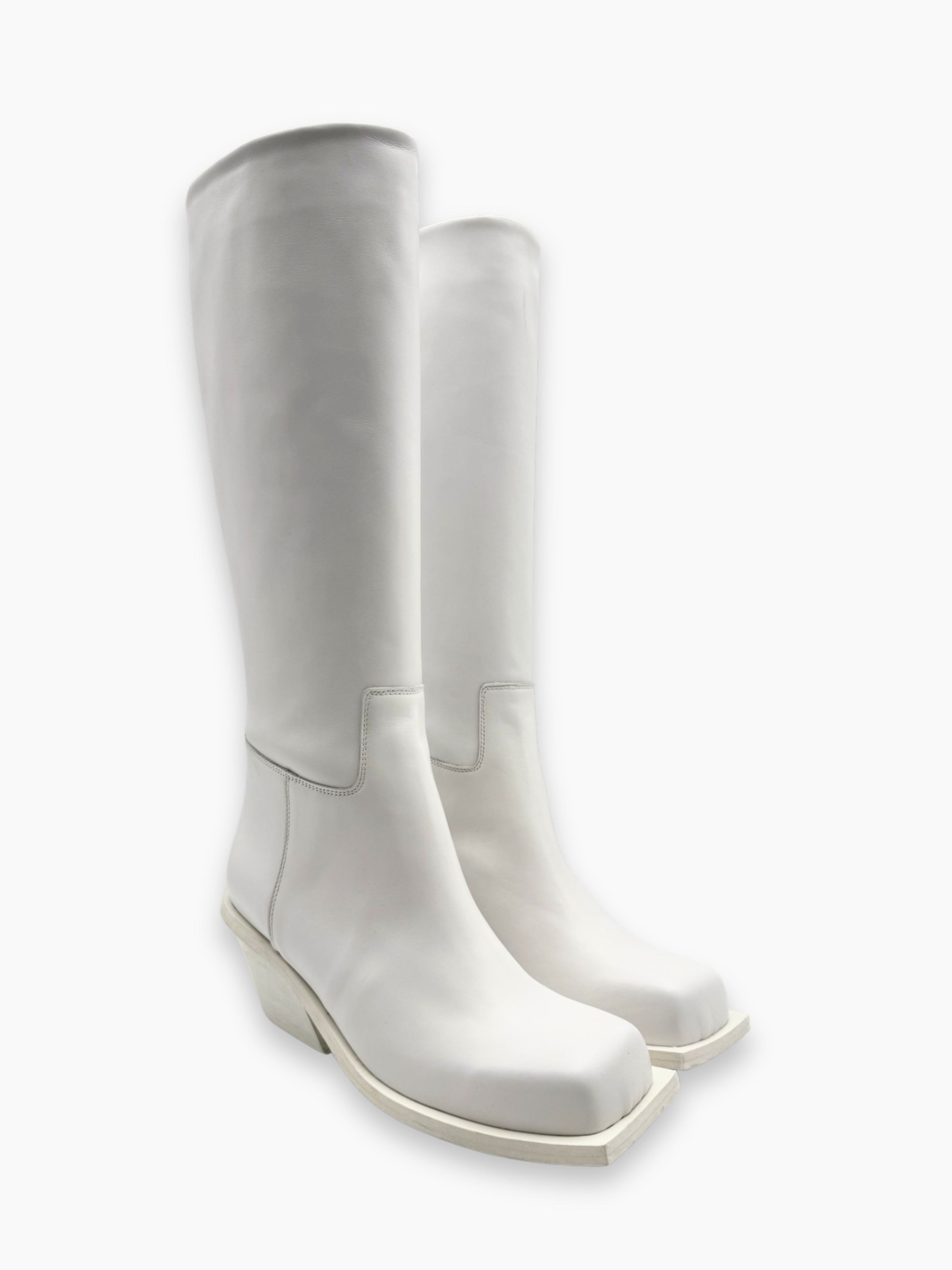 Stivali firmati Gia Borghini dal design moderno e sofisticato. Realizzati in morbida pelle bianca, si distinguono per la punta squadrata e il tacco scultoreo che aggiunge un tocco architettonico e contemporaneo. Un modello elegante e deciso, perfetto per completare look minimal o outfit più audaci.