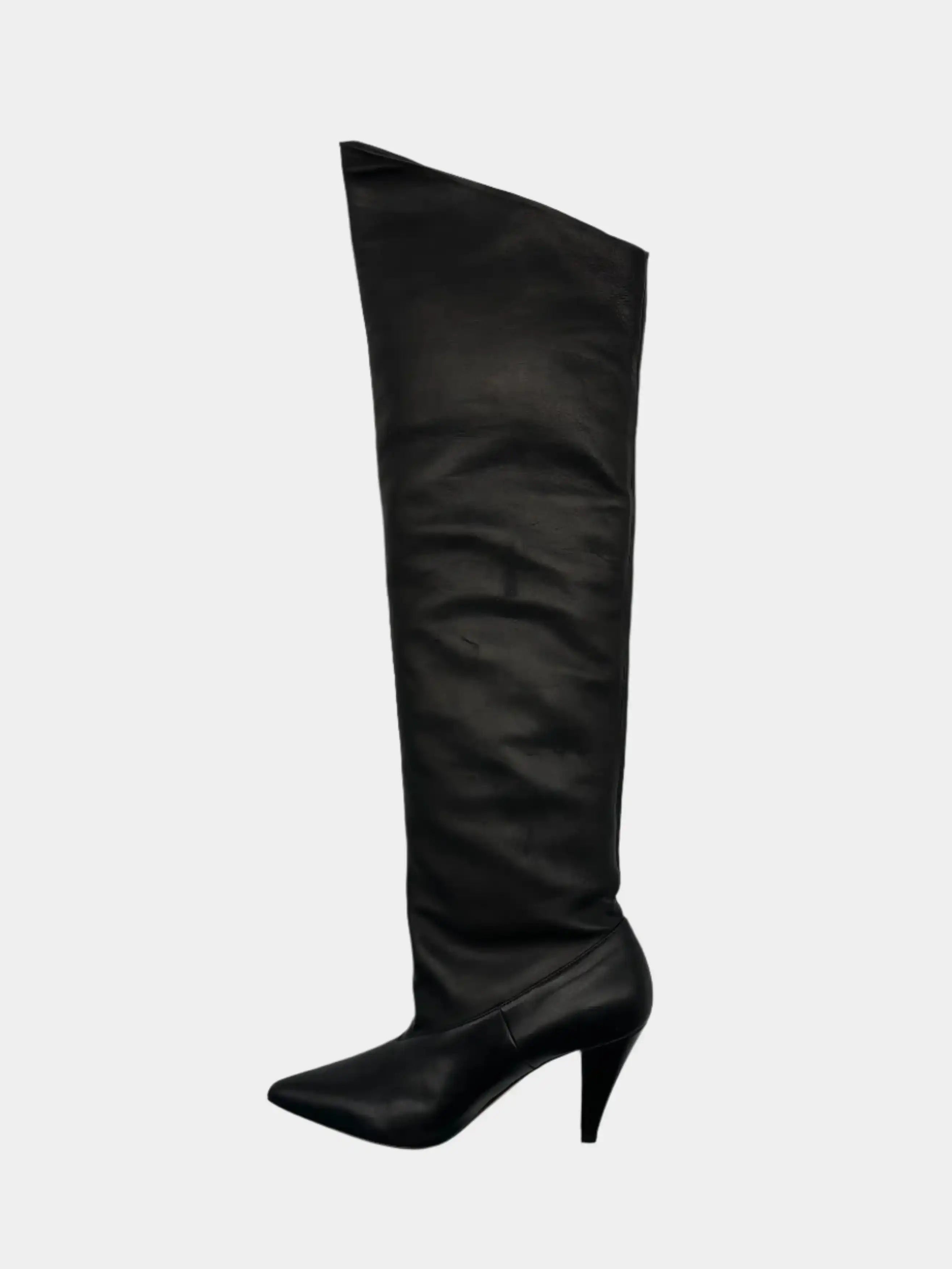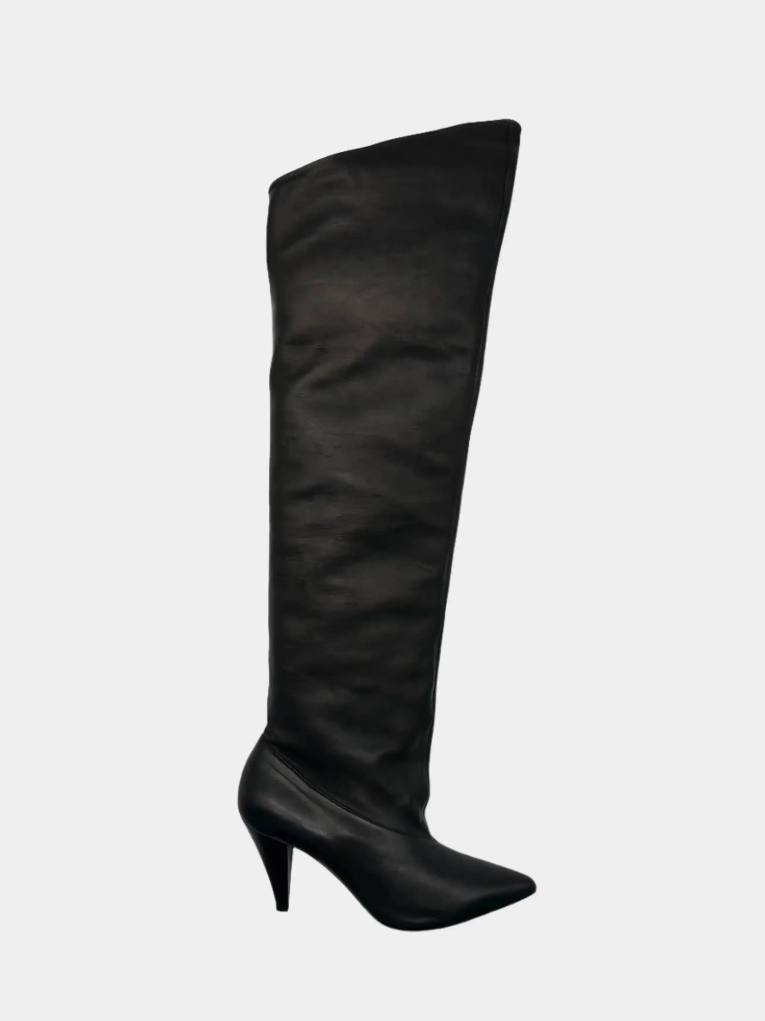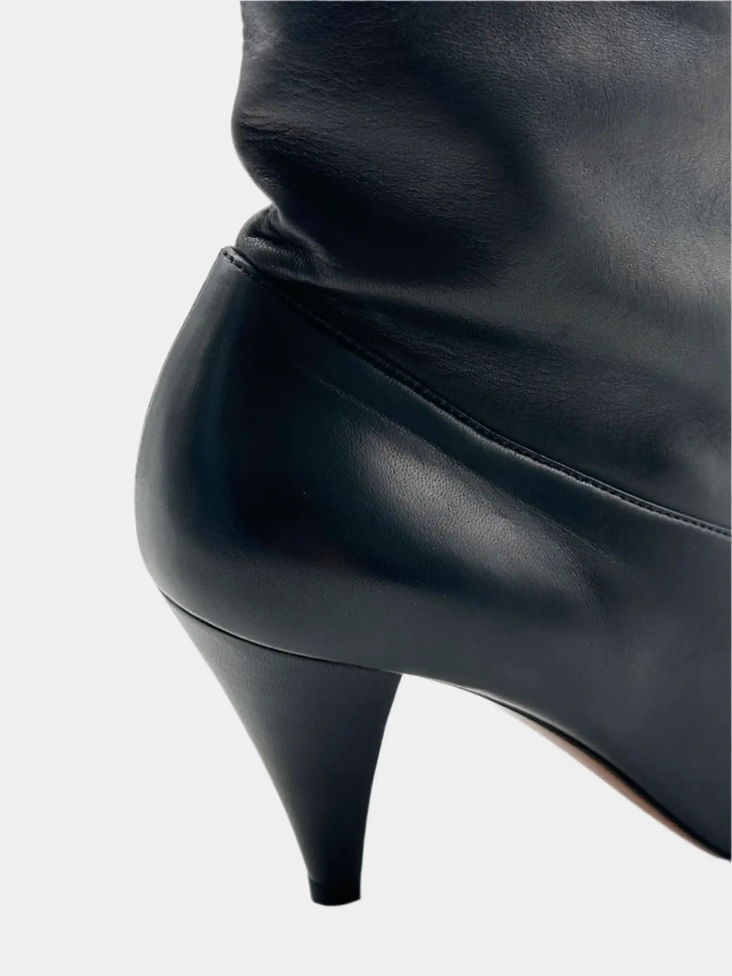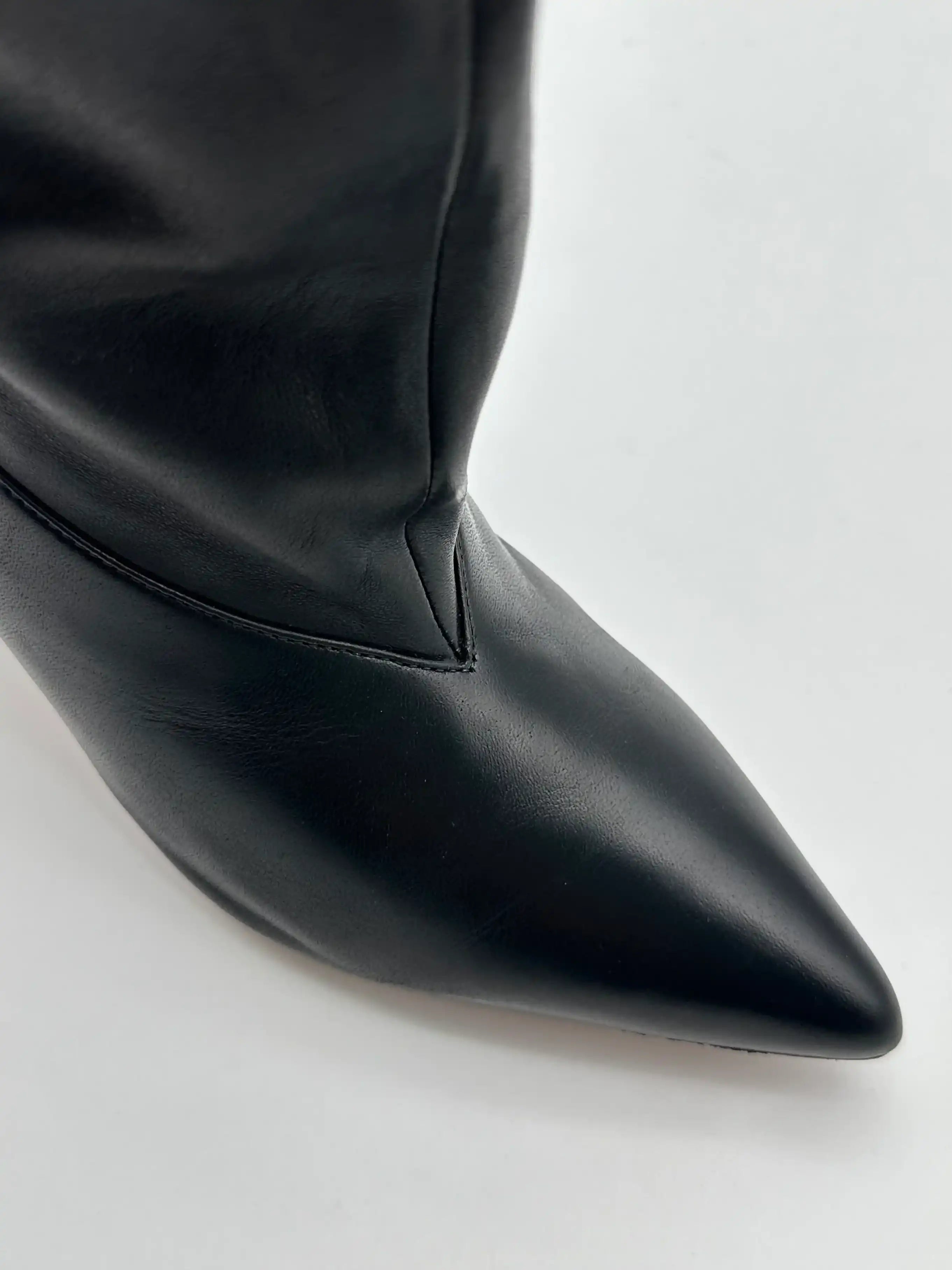 Questi stivali cuissardes in morbida nappa nera sono un'elegante dichiarazione di stile. La silhouette allungata avvolge la gamba fino alla coscia, mentre il tacco alto da 8 cm dona slancio e femminilità. La pelle liscia e flessibile esalta ogni movimento, rendendo il modello ideale per completare look sofisticati e audaci.