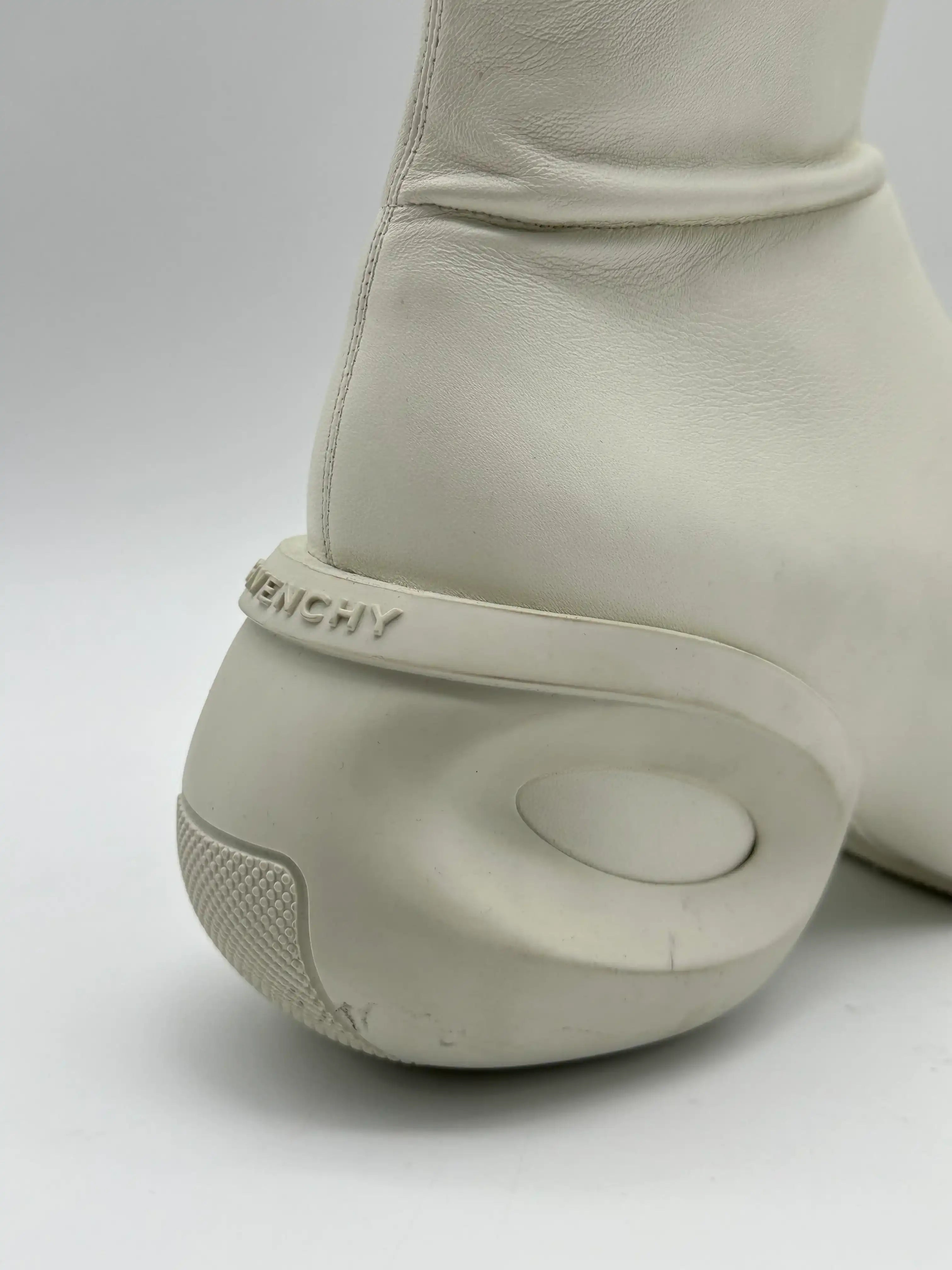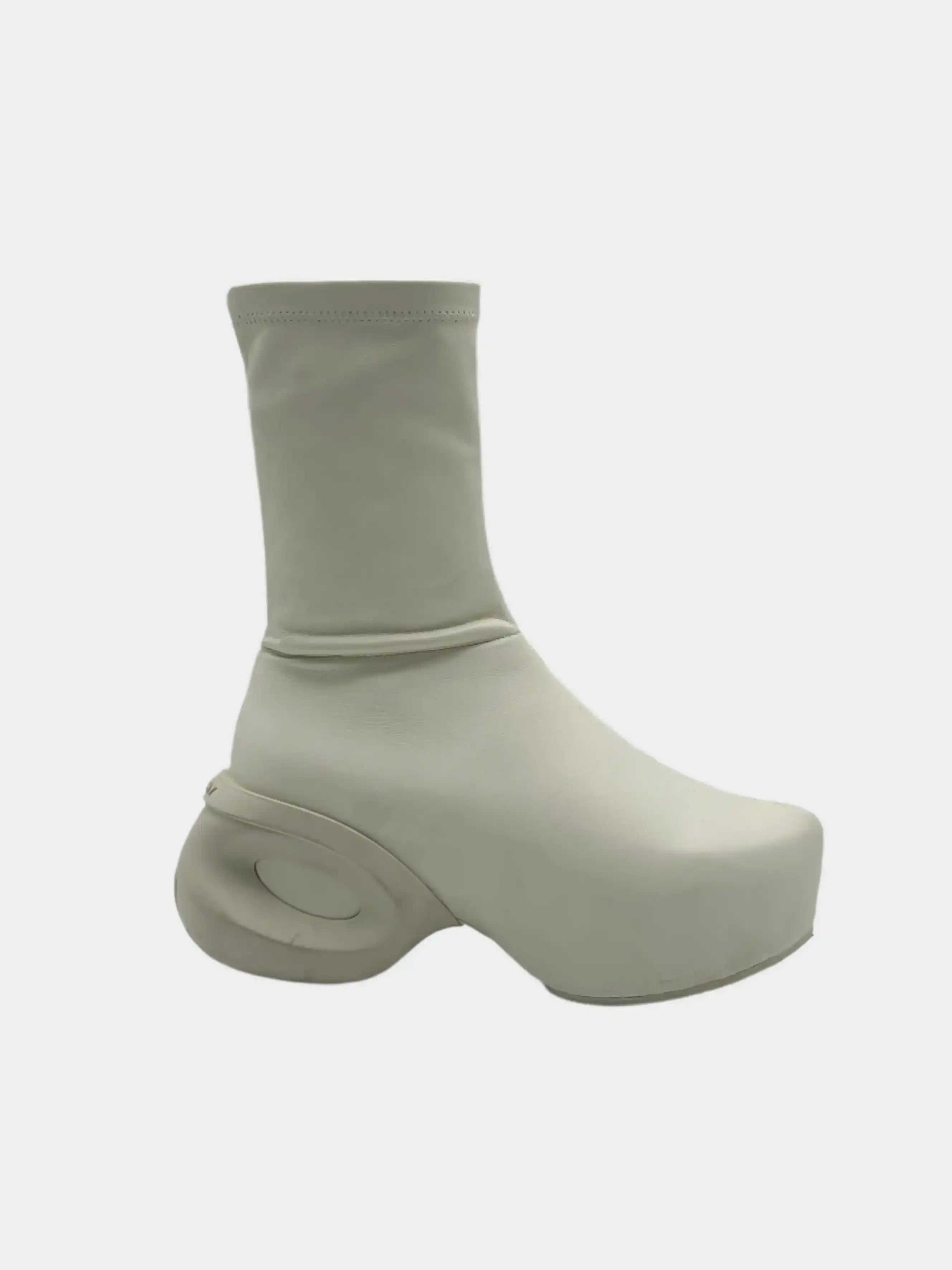 Questi clog ankle boots in pelle color avorio rappresentano una visione audace e contemporanea del design. La silhouette compatta è enfatizzata dalla suola scultorea con inserto ovale e dalla linea affusolata del gambale. Realizzati in morbida pelle di agnello, offrono un equilibrio perfetto tra avanguardia estetica e comfort urbano.