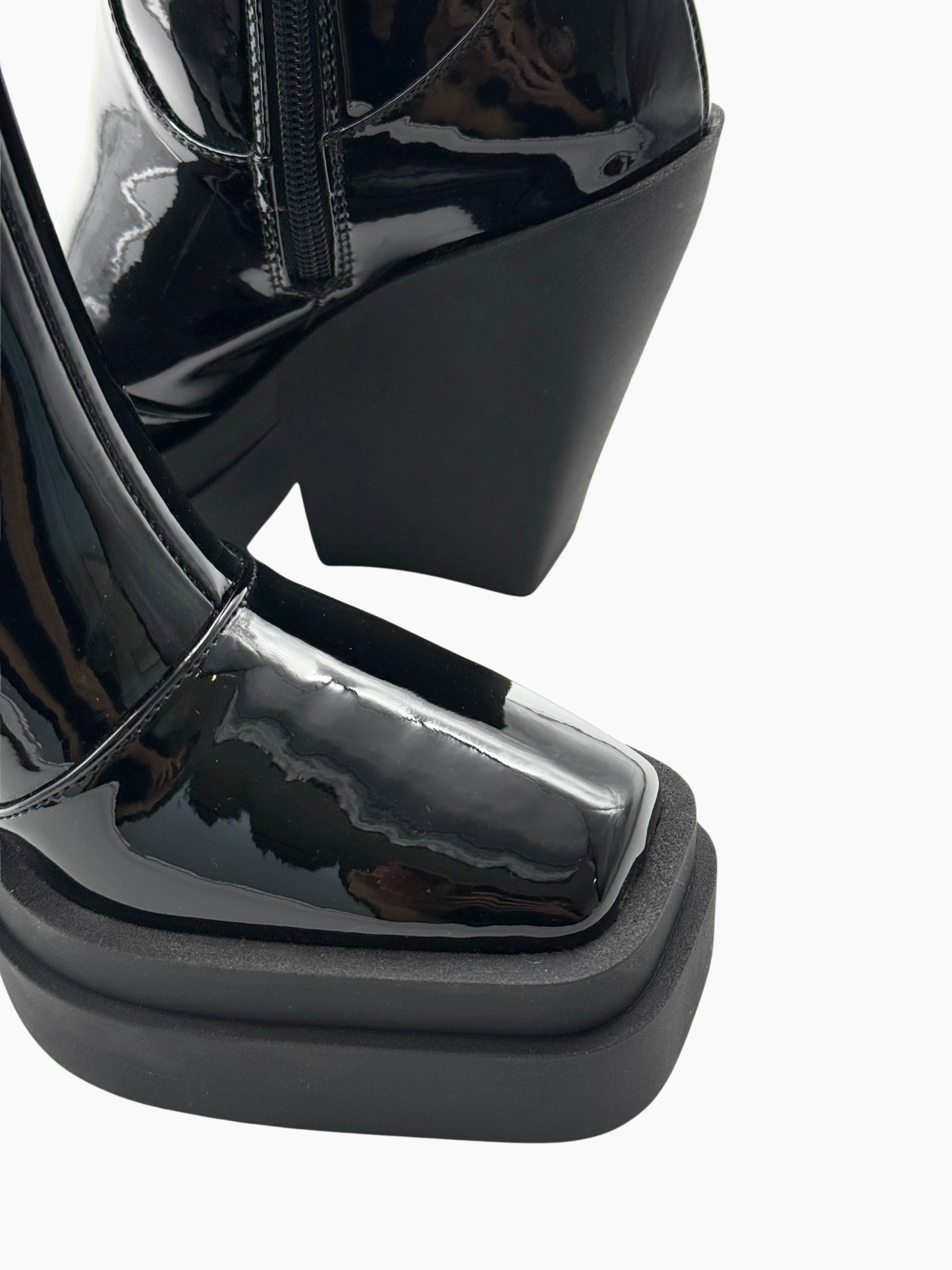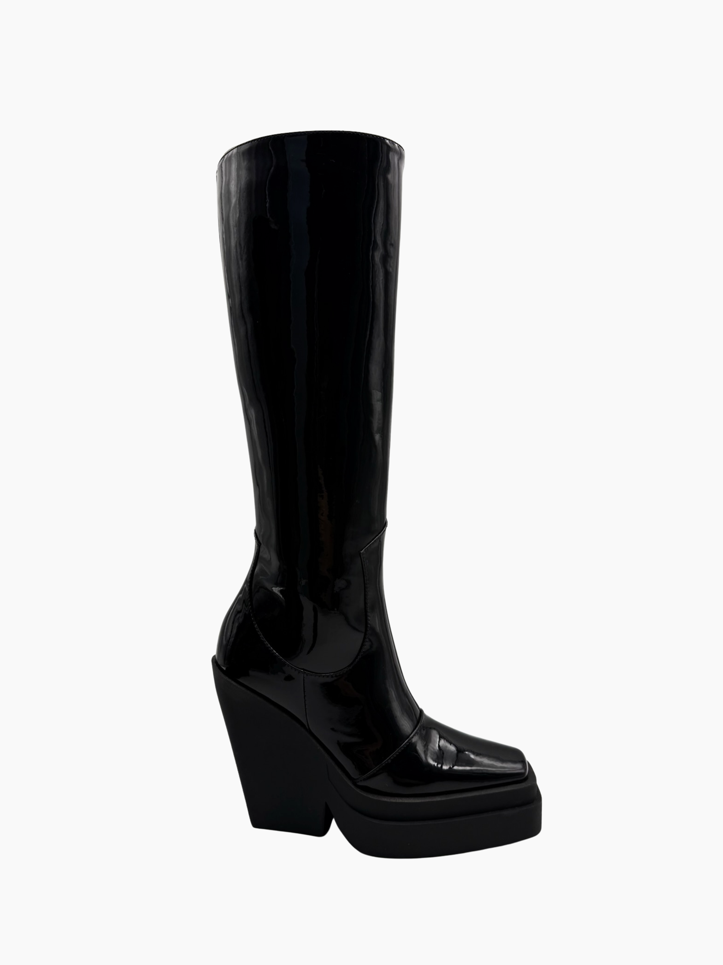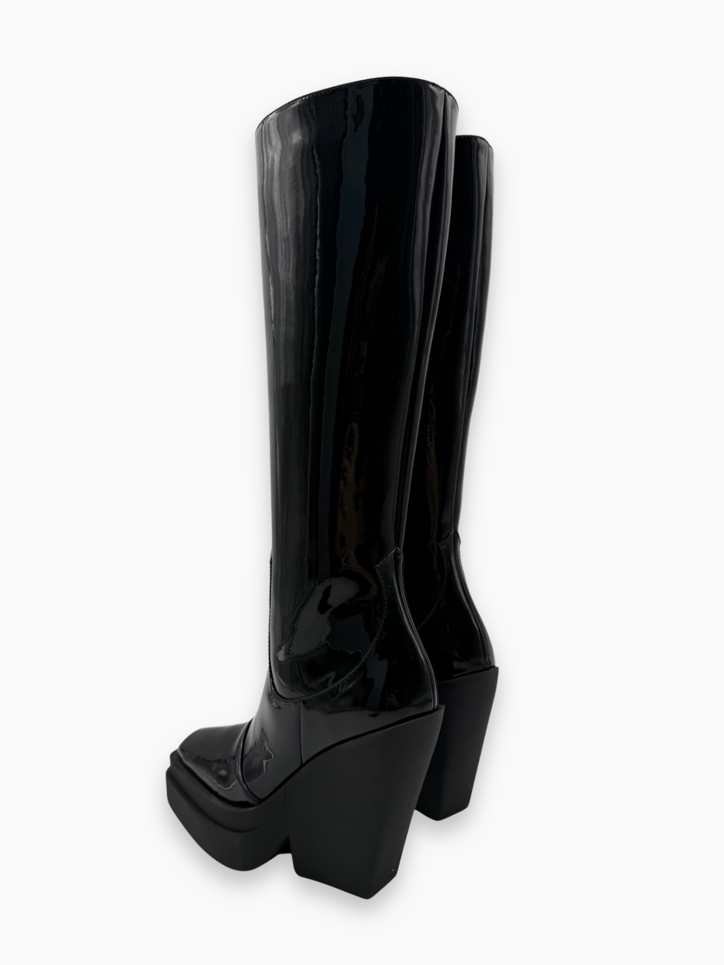 Stivali firmati Gia Borghini dal design audace e futurista. Realizzati in pelle verniciata nera, presentano una silhouette slanciata con punta squadrata e suola con maxi zeppa geometrica che regala altezza e carattere. L’effetto glossy e la linea decisa li rendono un accessorio di stile perfetto per look dal forte impatto visivo.