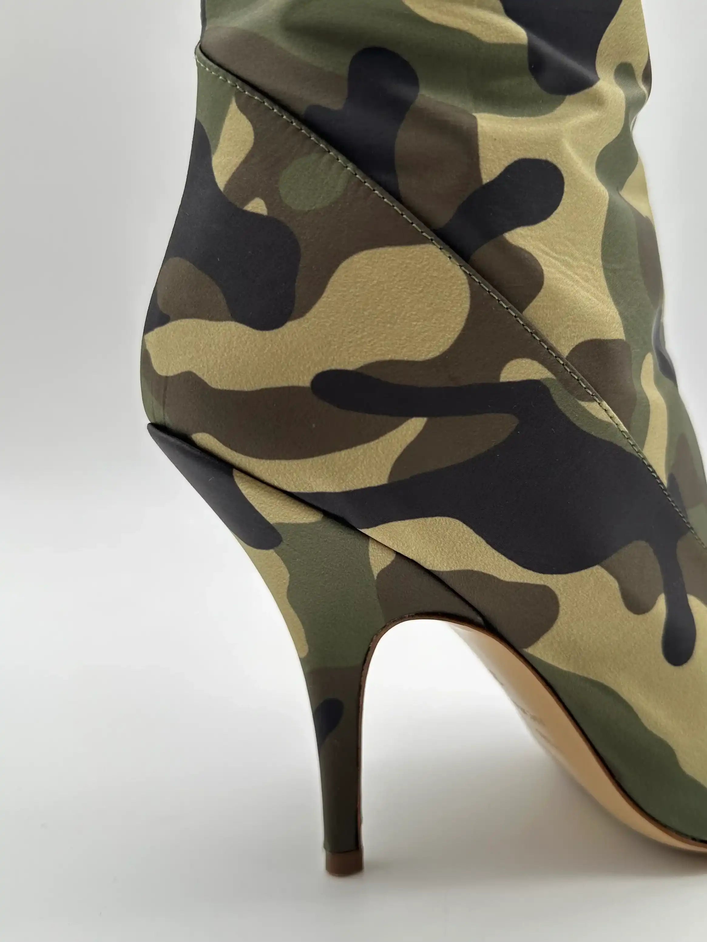 Stivali overknee a punta con stampa camouflage, realizzato in materiale tecnico. Il gambale alto sopra il ginocchio dona un'allure decisa e slanciata, perfetto per outfit grintosi. Il tacco a spillo aggiunge un tocco di femminilità a un design contemporaneo senza risvolto.