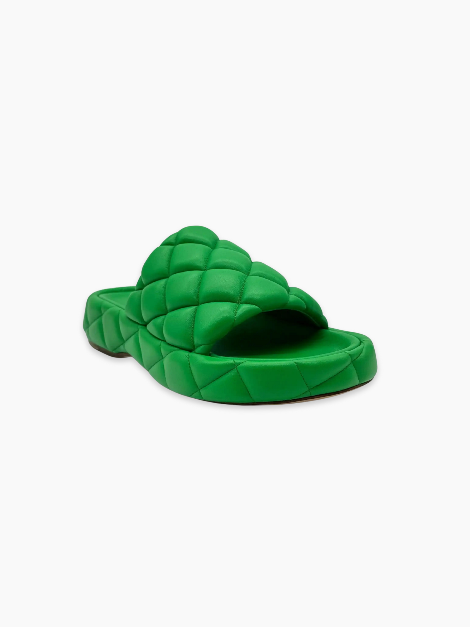 Sandali Bottega Veneta in pelle verde, caratterizzati dal design trapuntato iconico della maison. Presentano fascia imbottita sul davanti e suola piatta, per un look moderno e confortevole. Un modello essenziale ma d’impatto, perfetto per aggiungere un tocco di colore sofisticato ai look estivi.