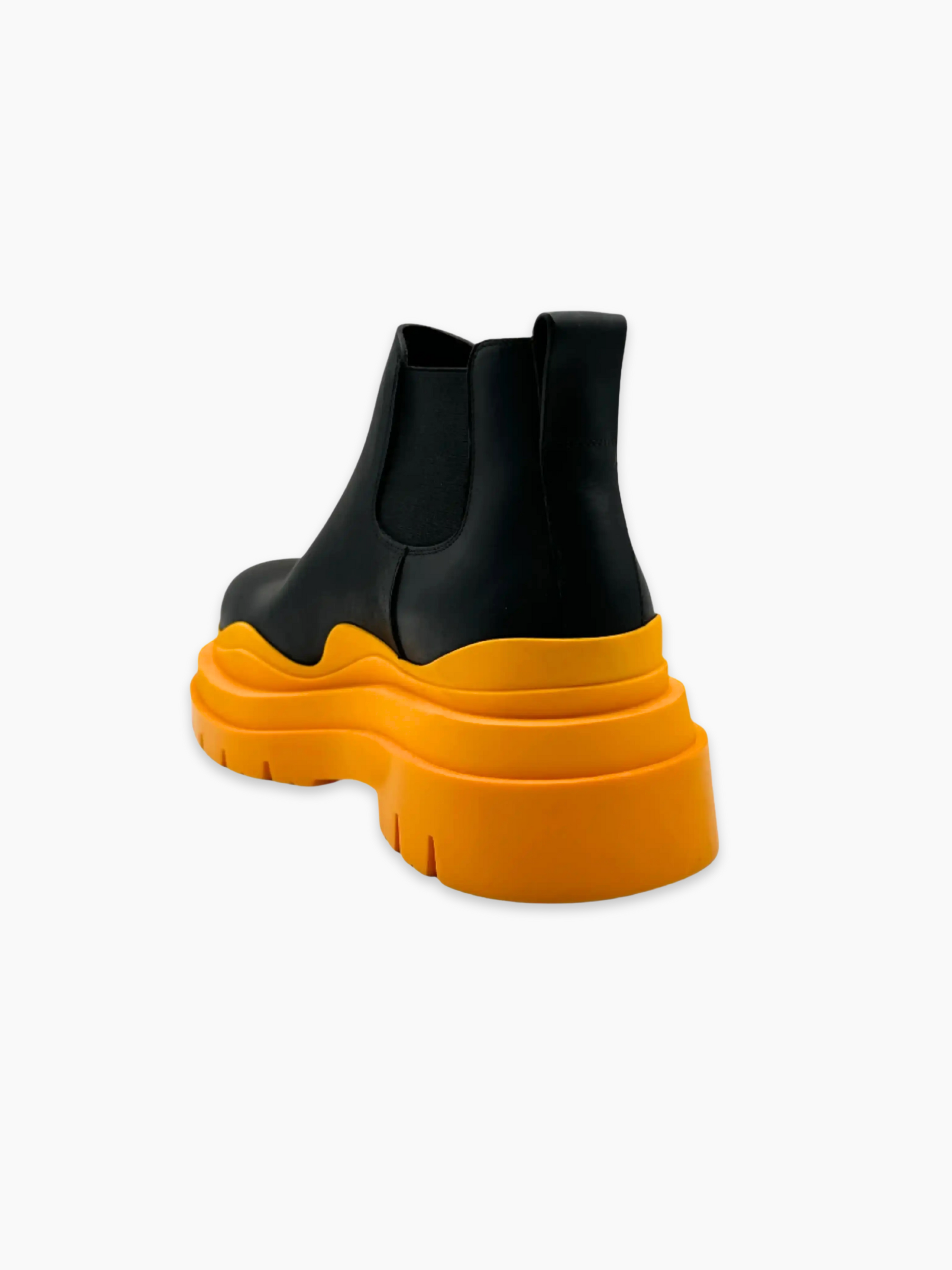 Stivaletti Bottega Veneta in gomma nera con suola chunky arancione a contrasto. Caratterizzati da un design contemporaneo e dalla silhouette essenziale, sono dotati di inserti elastici laterali e linguetta posteriore per una calzata pratica e confortevole. Perfetti per look street e audaci, con un tocco di stile iconico.