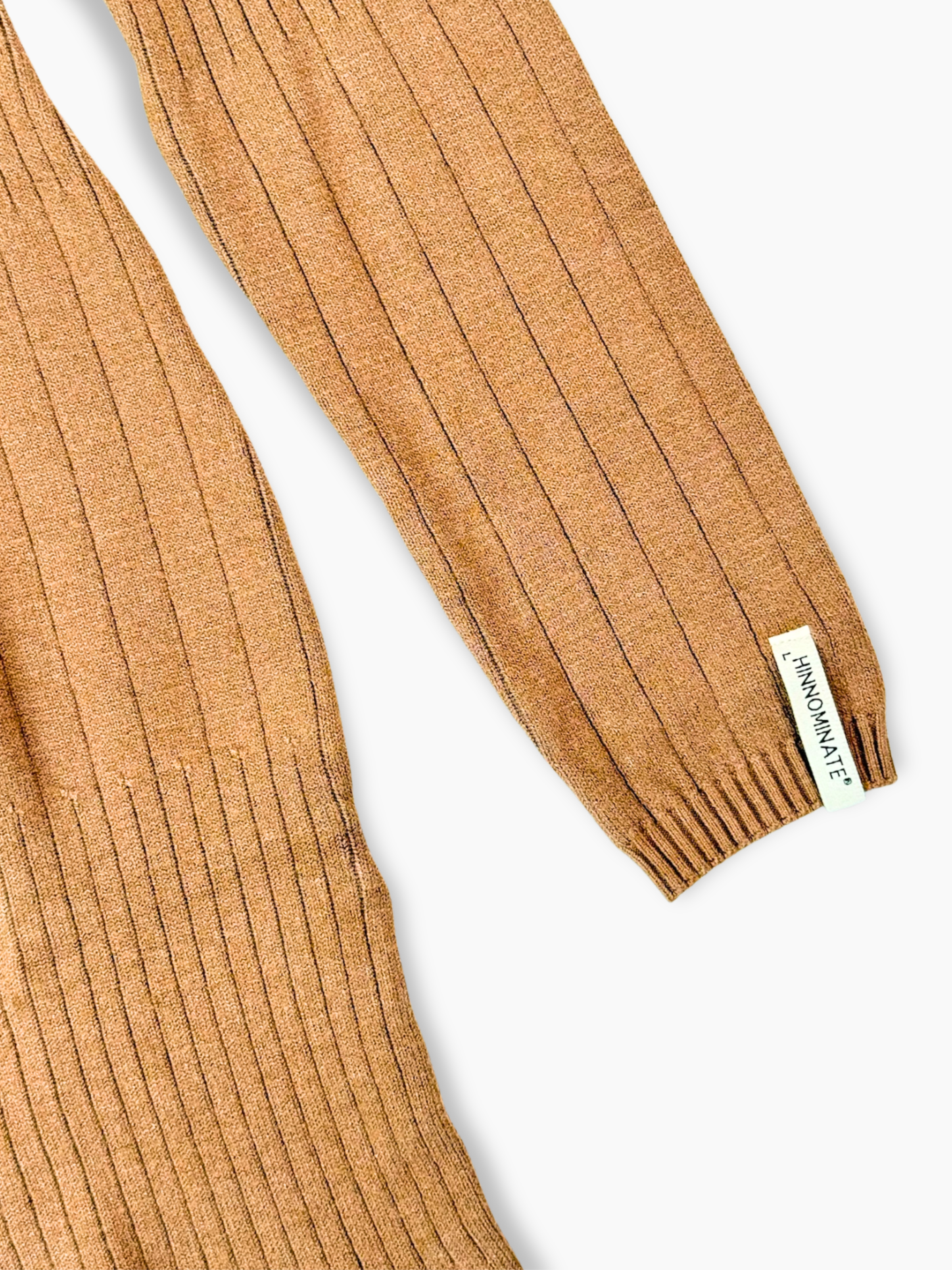 Un capo essenziale e sofisticato, il vestito dolcevita Hinnominate in maglia a costine color beige caramello è perfetto per la stagione fredda. Il design aderente valorizza la silhouette, mentre il piccolo spacco sul fondo dona un tocco contemporaneo.