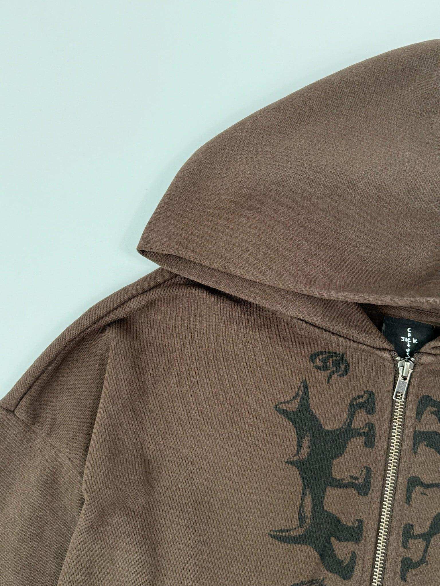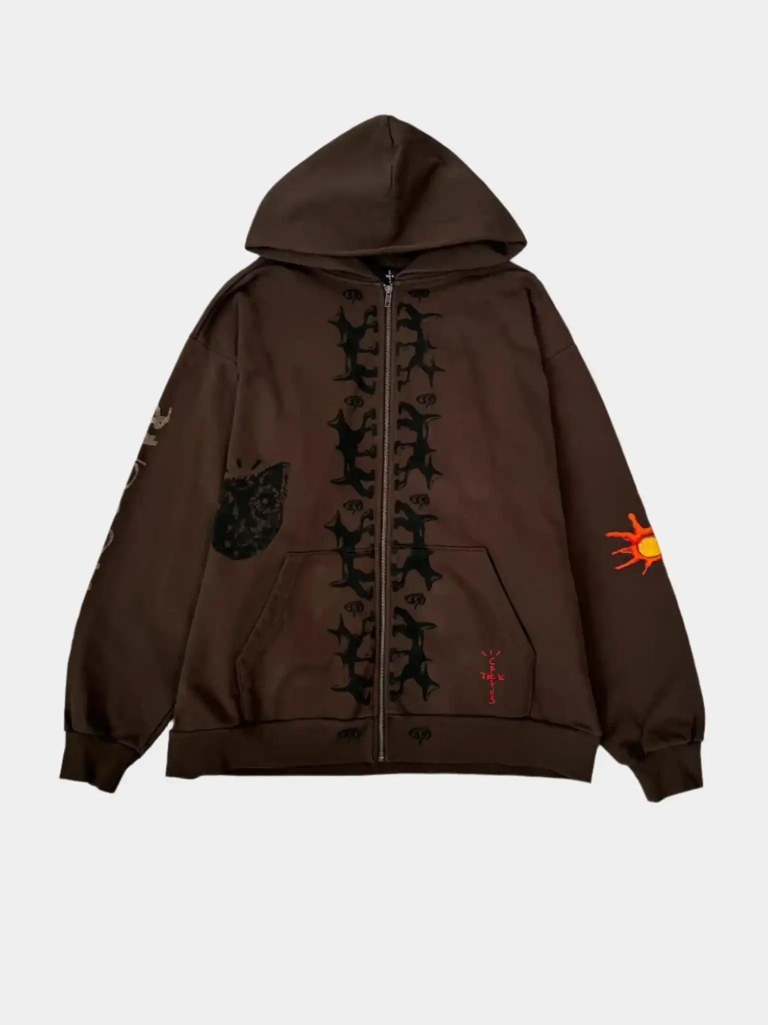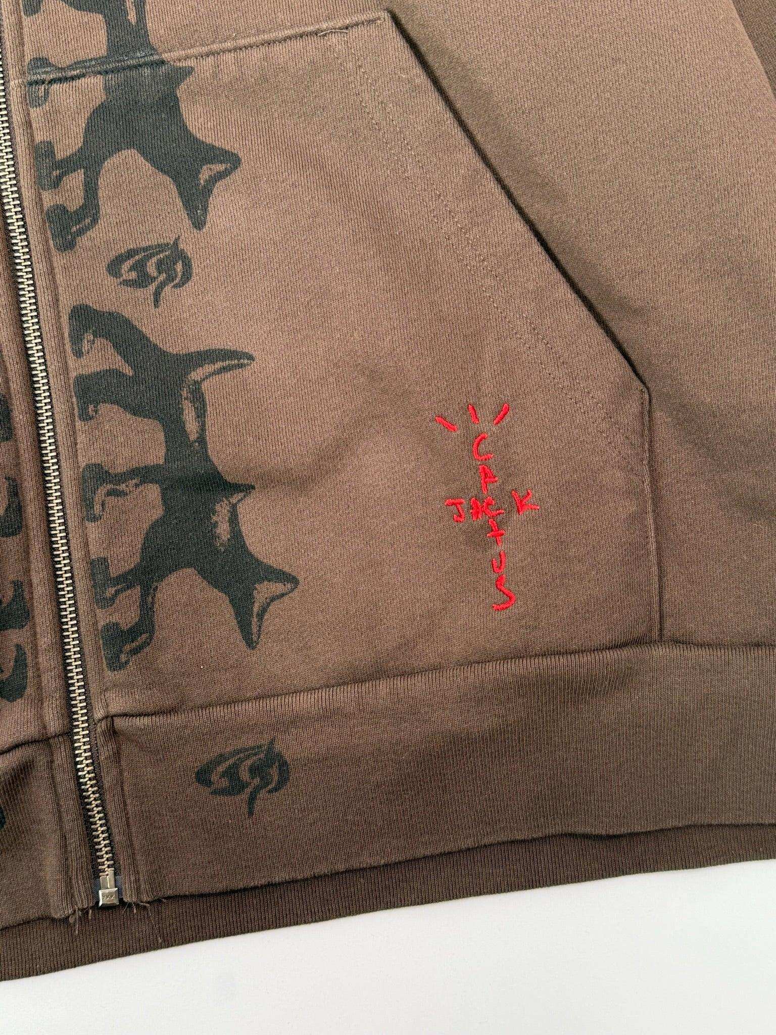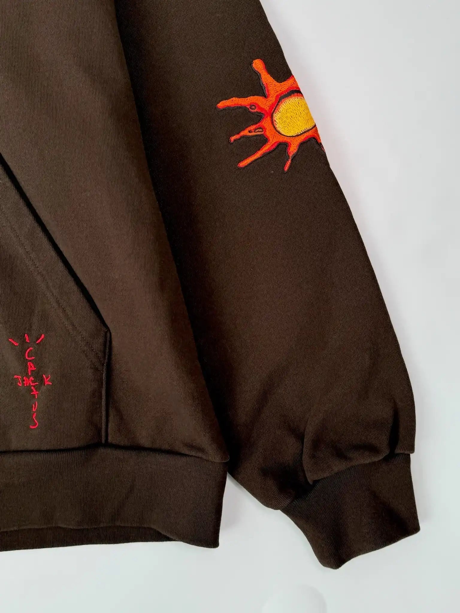 Questa felpa con cappuccio firmata Travis Scott unisce stile streetwear e dettagli artistici in un capo distintivo. Realizzata in cotone marrone, presenta una chiusura a zip frontale e una stampa nera con sagome di cani stilizzati lungo il centro. Il dettaglio “Cactus Jack” ricamato in rosso sul lato e il sole arancione ricamato sulla manica donano un tocco iconico e riconoscibile. Un capo pensato per chi vuole distinguersi con personalità.