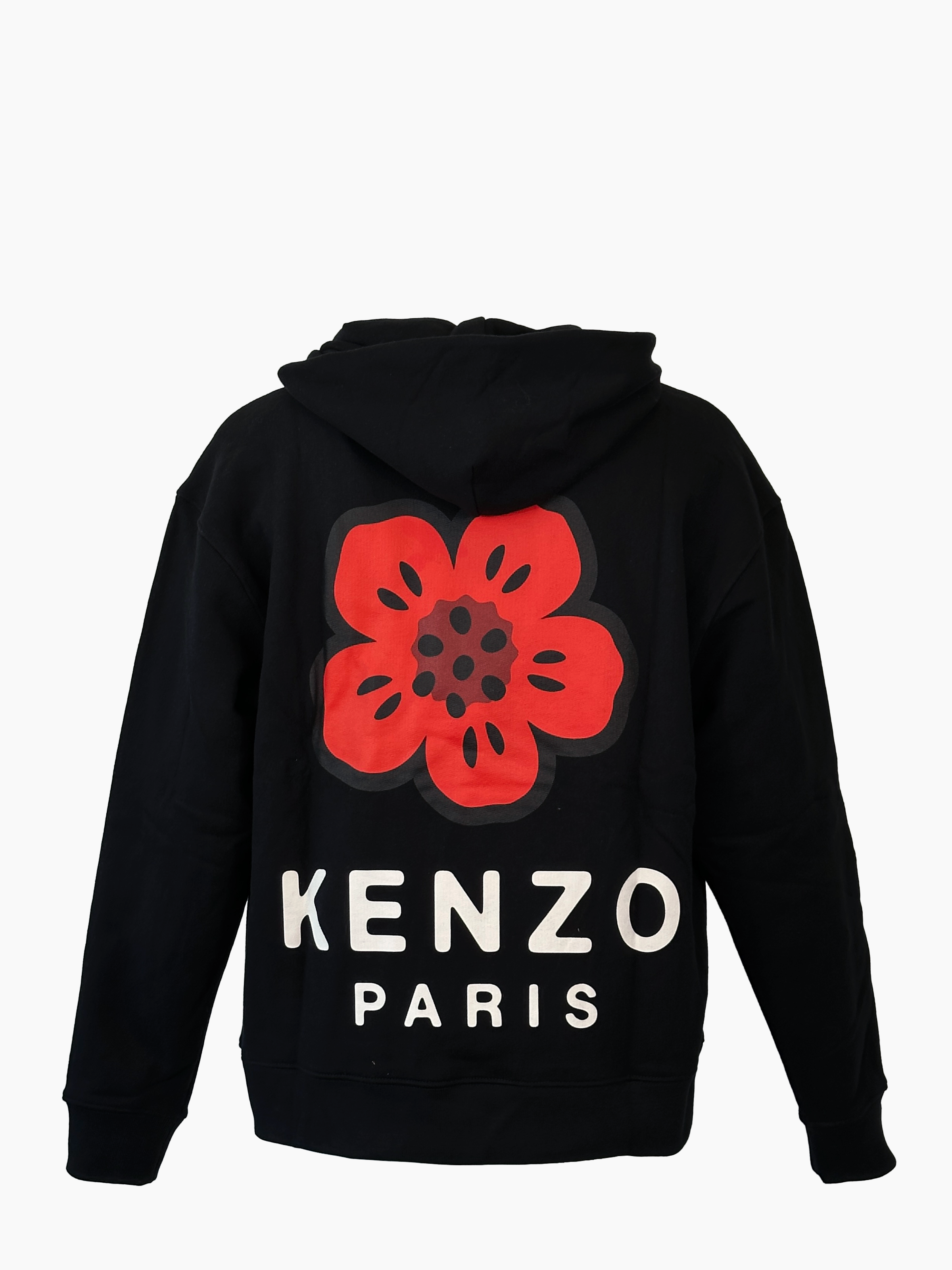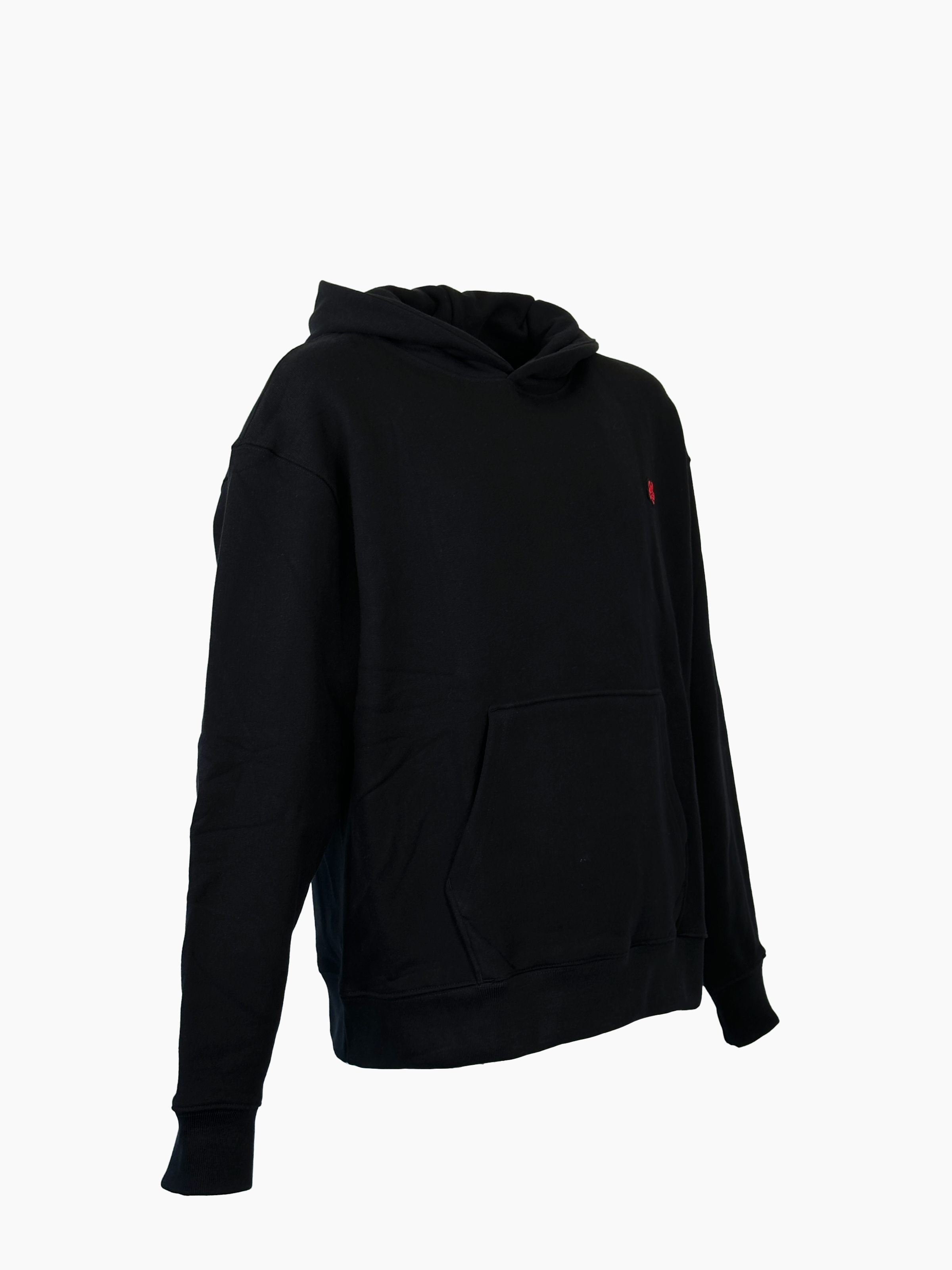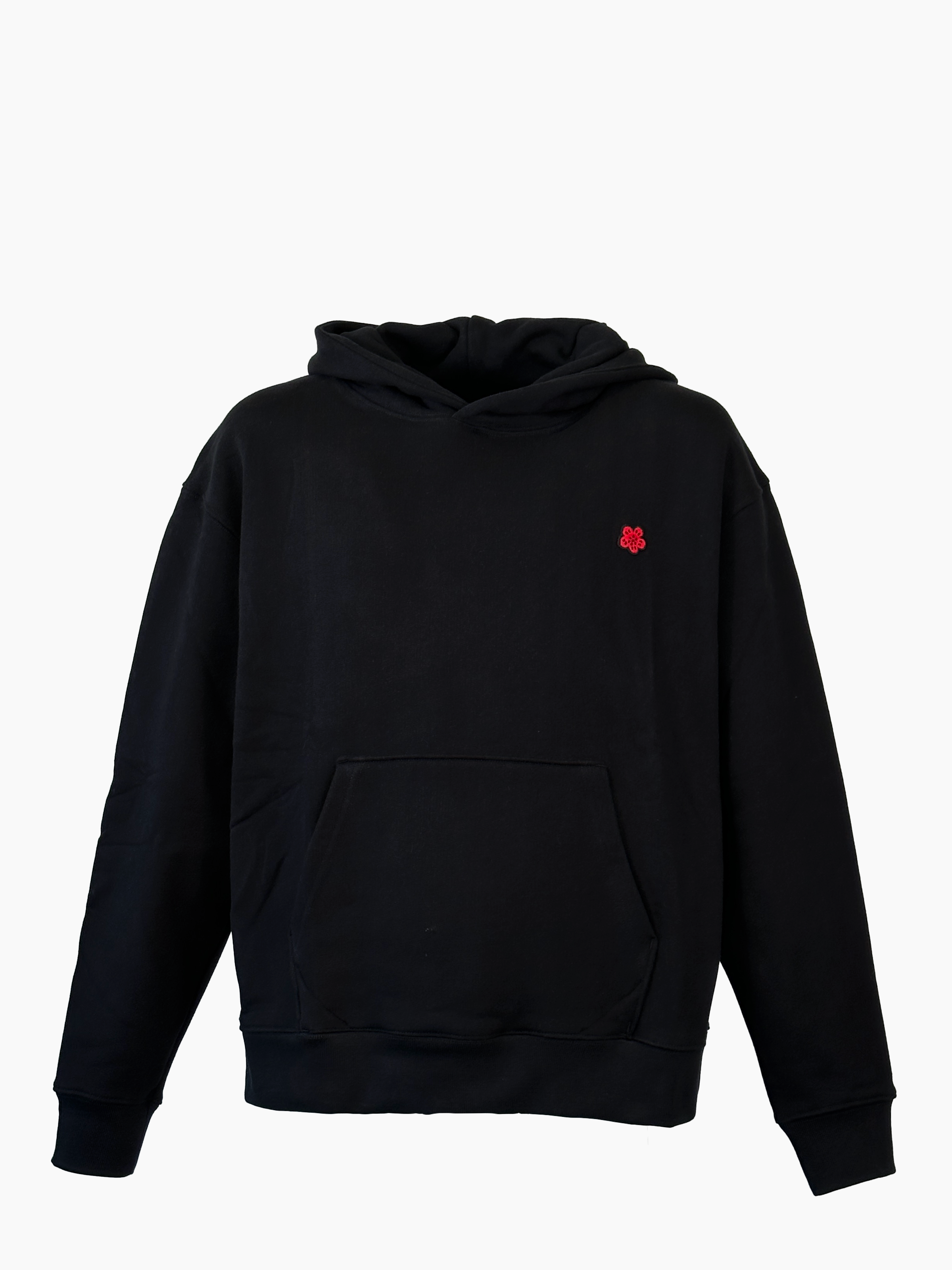 Felpa nera con cappuccio realizzata in cotone, caratterizzata da una linea essenziale e confortevole perfetta per l’uso quotidiano. Il cappuccio avvolgente e la tasca a marsupio frontale offrono praticità e funzionalità, mentre la vestibilità regolare assicura comfort e libertà di movimento. Il patch a fiore rosso applicato sul petto aggiunge un dettaglio distintivo che valorizza il design minimal e rende il capo riconoscibile. Un must-have versatile, ideale per completare outfit casual e streetwear.