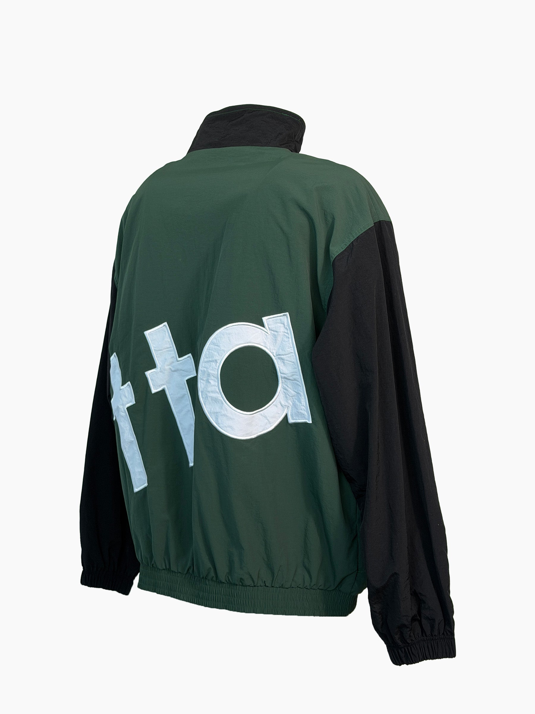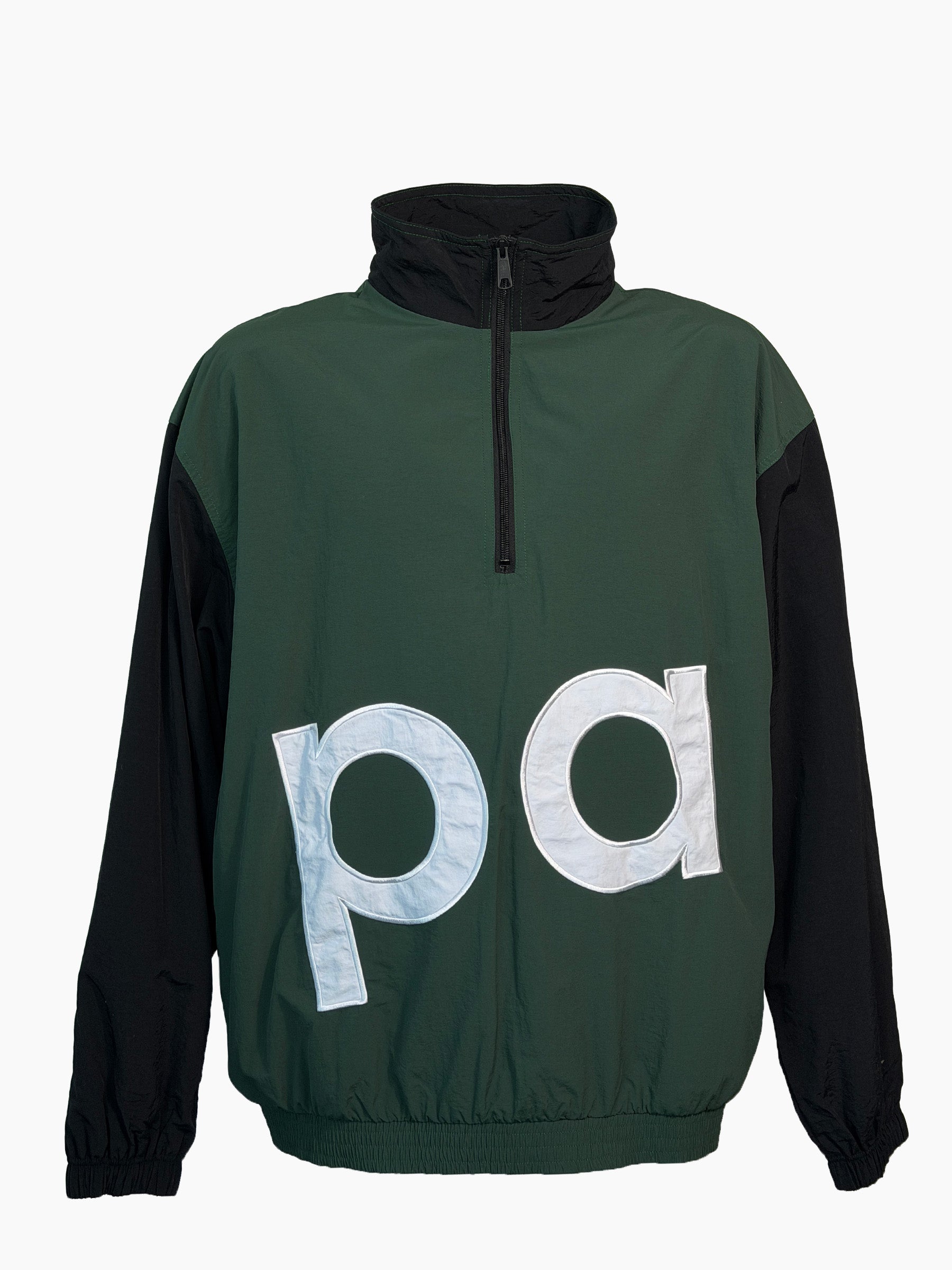 Giacca leggera in tessuto tecnico verde con mezzo zip frontale e maxi applicazione bianca “pd” effetto patch sul davanti. Il design è caratterizzato da un colletto alto in contrasto nero, fondo e polsini elasticizzati e una struttura confortevole ideale per look casual e streetwear.