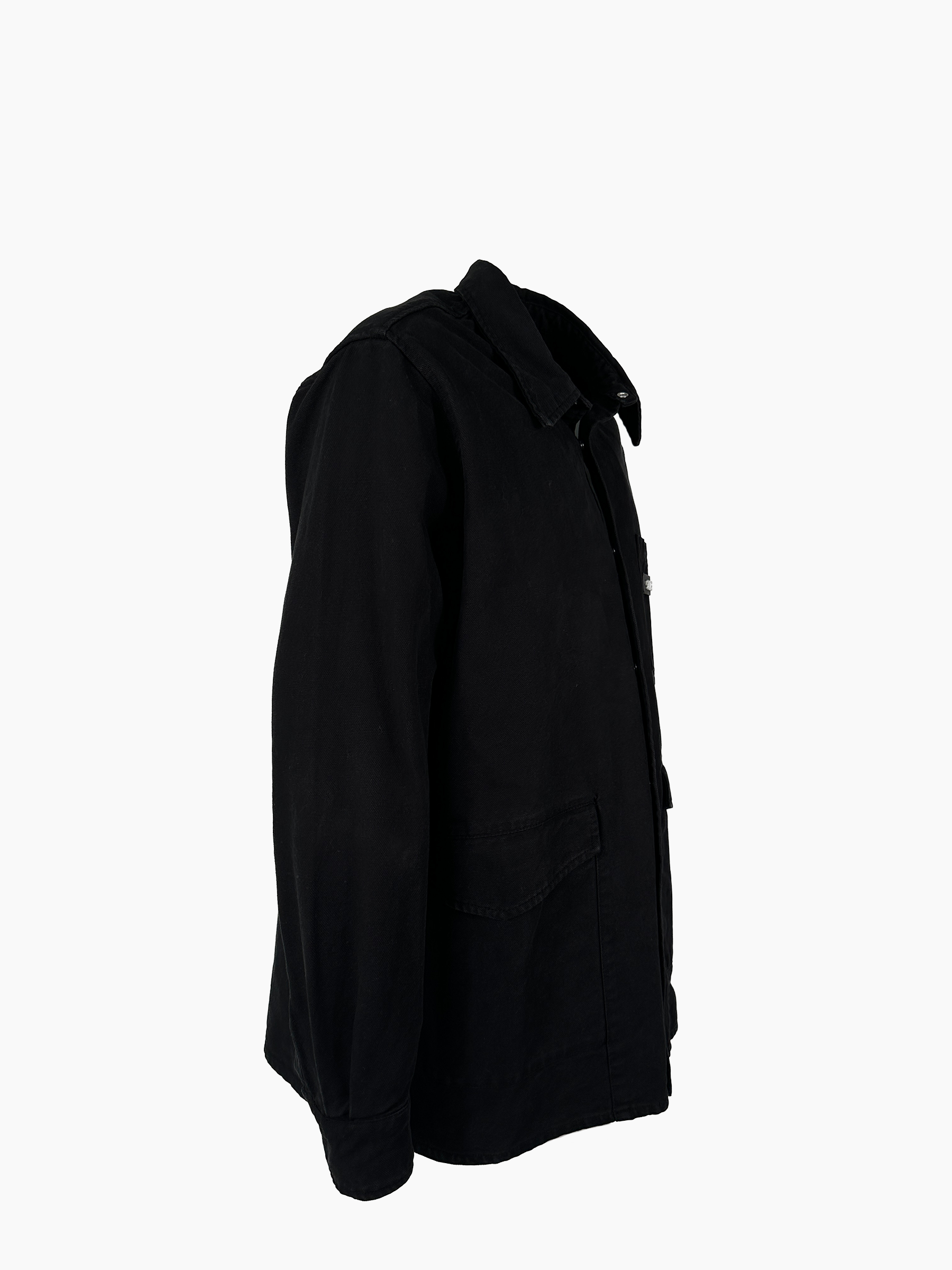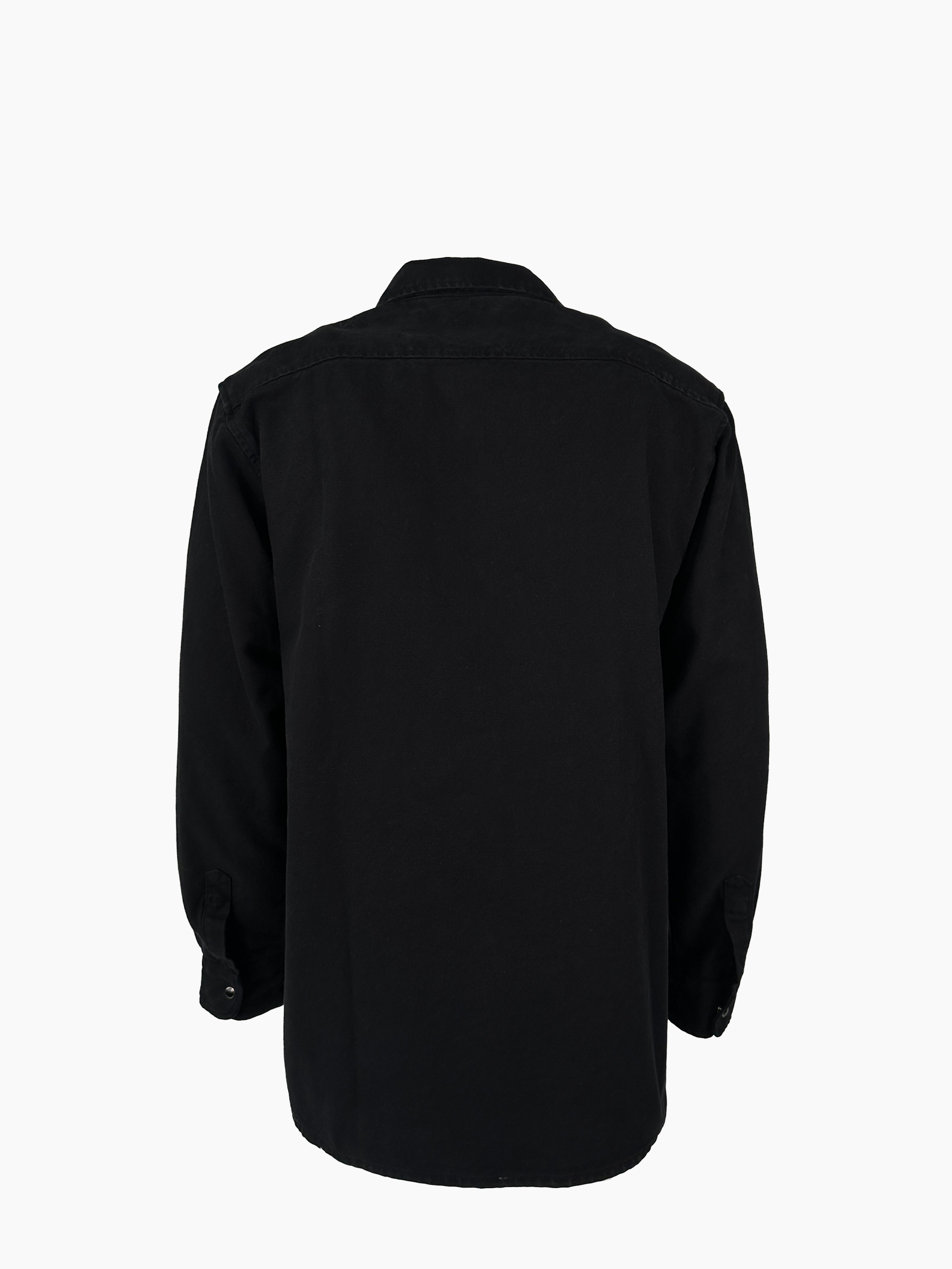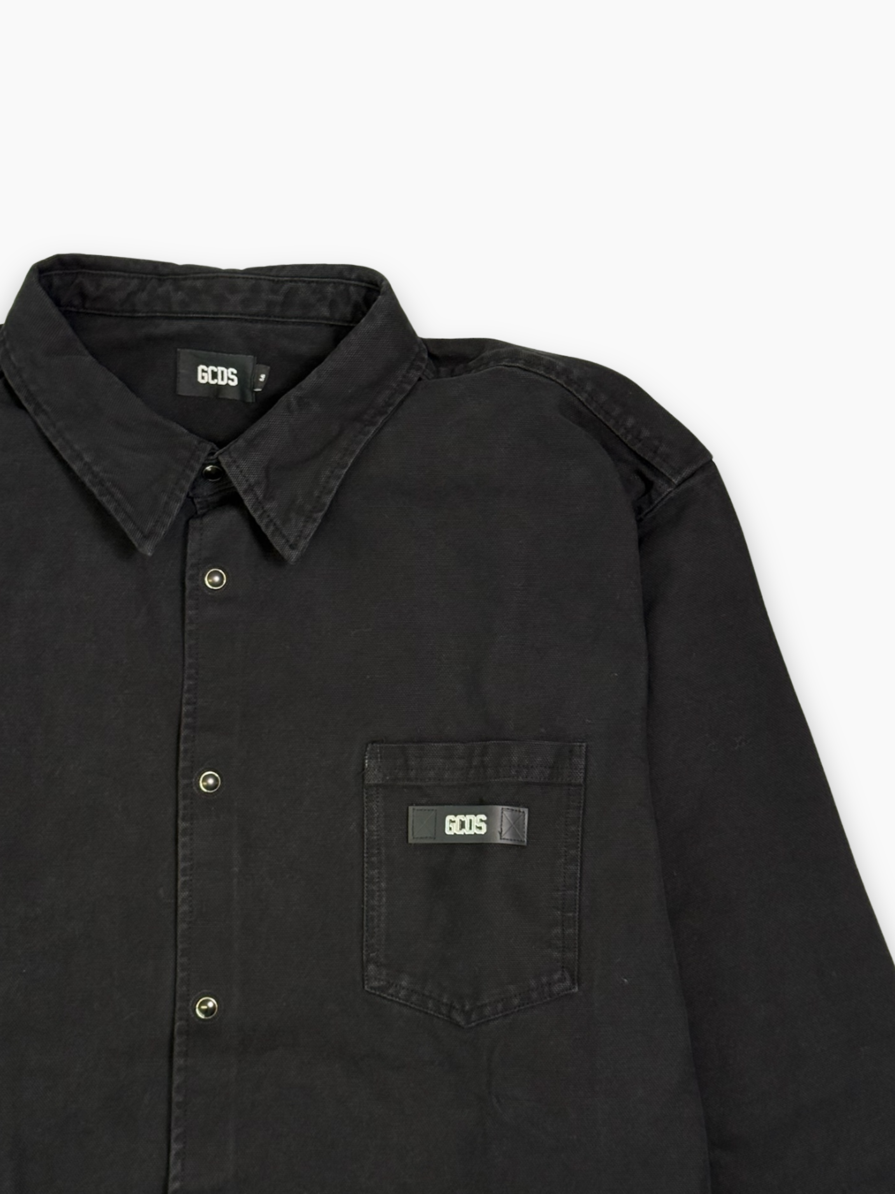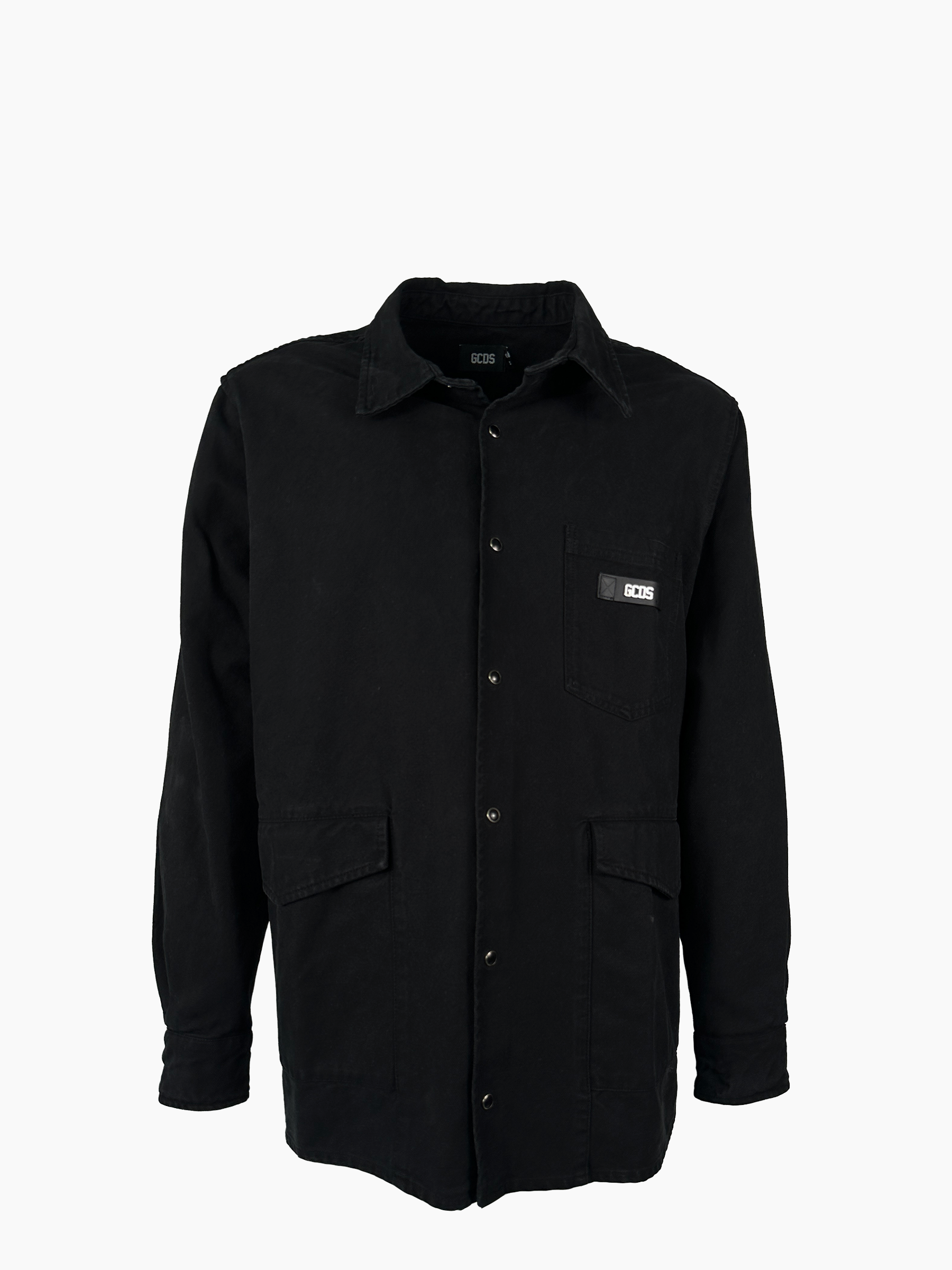 Camicia jacket nera in cotone dallo stile utility, caratterizzata da tasche applicate e bottoni a pressione frontali. Il design leggermente oversize la rende versatile e ideale come strato leggero per look casual e contemporanei. Il logo GCDS applicato sulla tasca aggiunge un dettaglio distintivo e moderno.