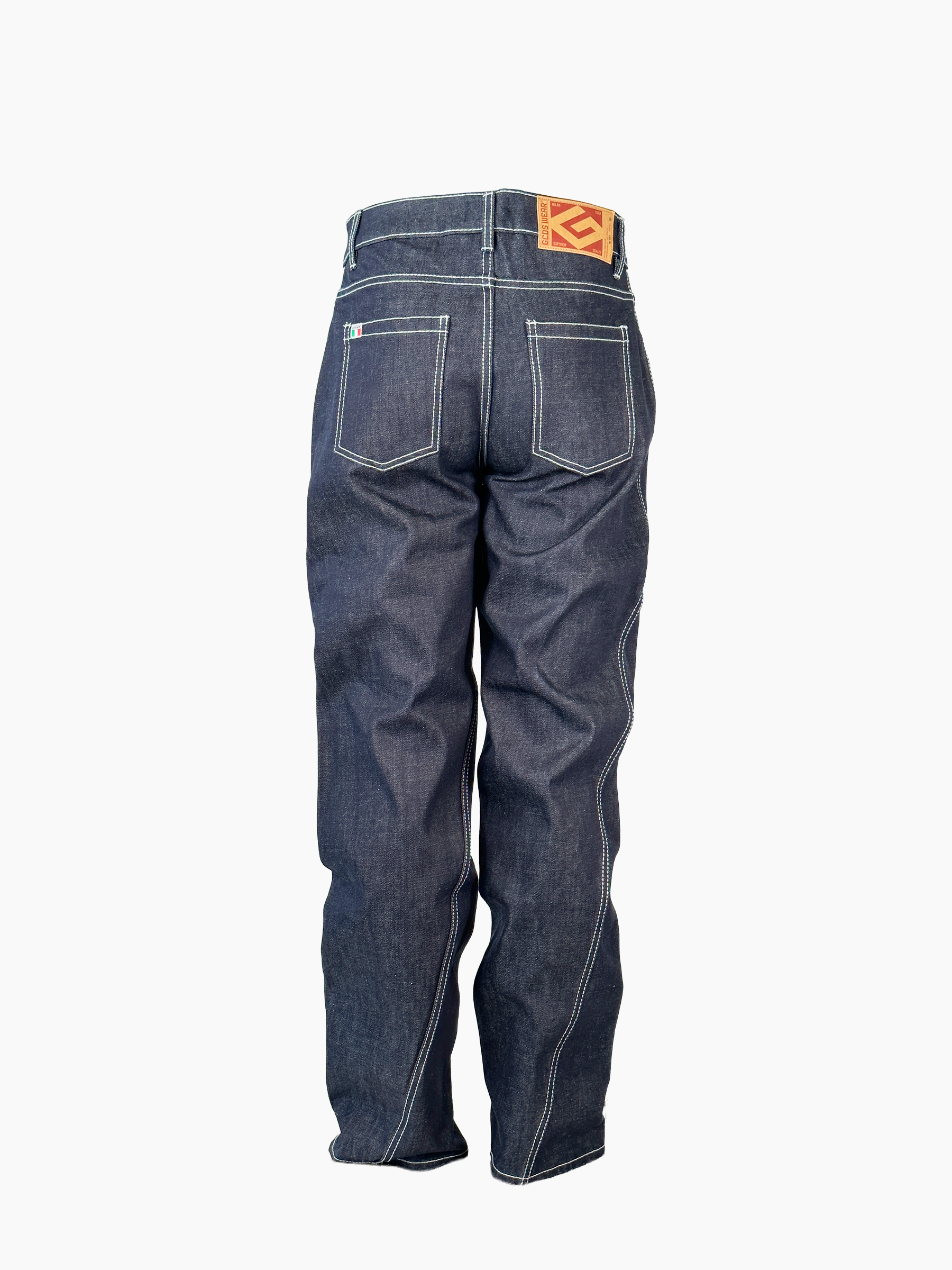 Pantaloni in denim blu scuro con cuciture a contrasto e linea dritta. Il modello presenta vita regular, cinque tasche e ricamo “GCDS Wear Milano Italy” sulla parte frontale, che aggiunge un dettaglio distintivo e contemporaneo. La struttura in denim rigido garantisce tenuta e stile, ideale per look casual dal tocco urbano.