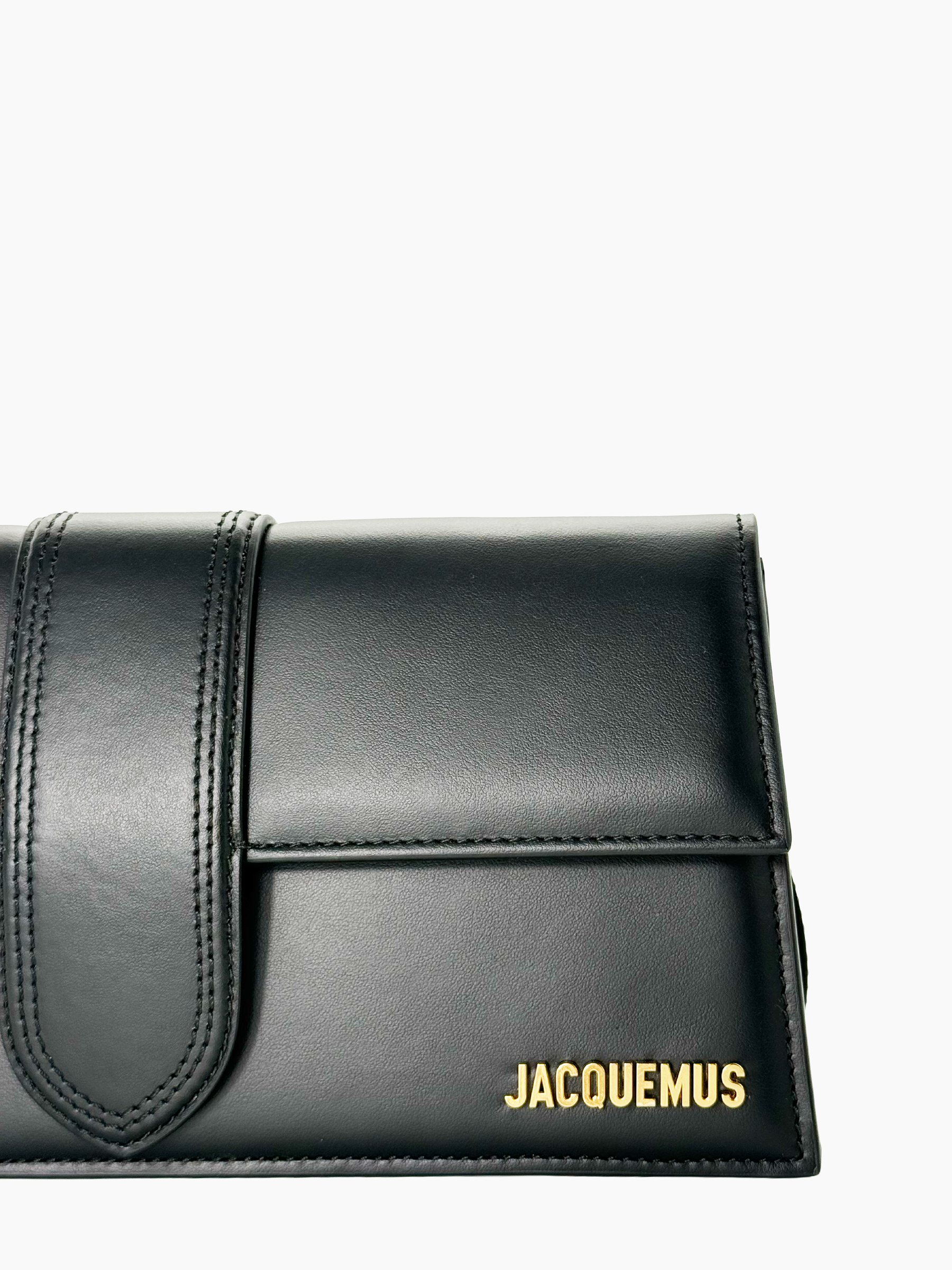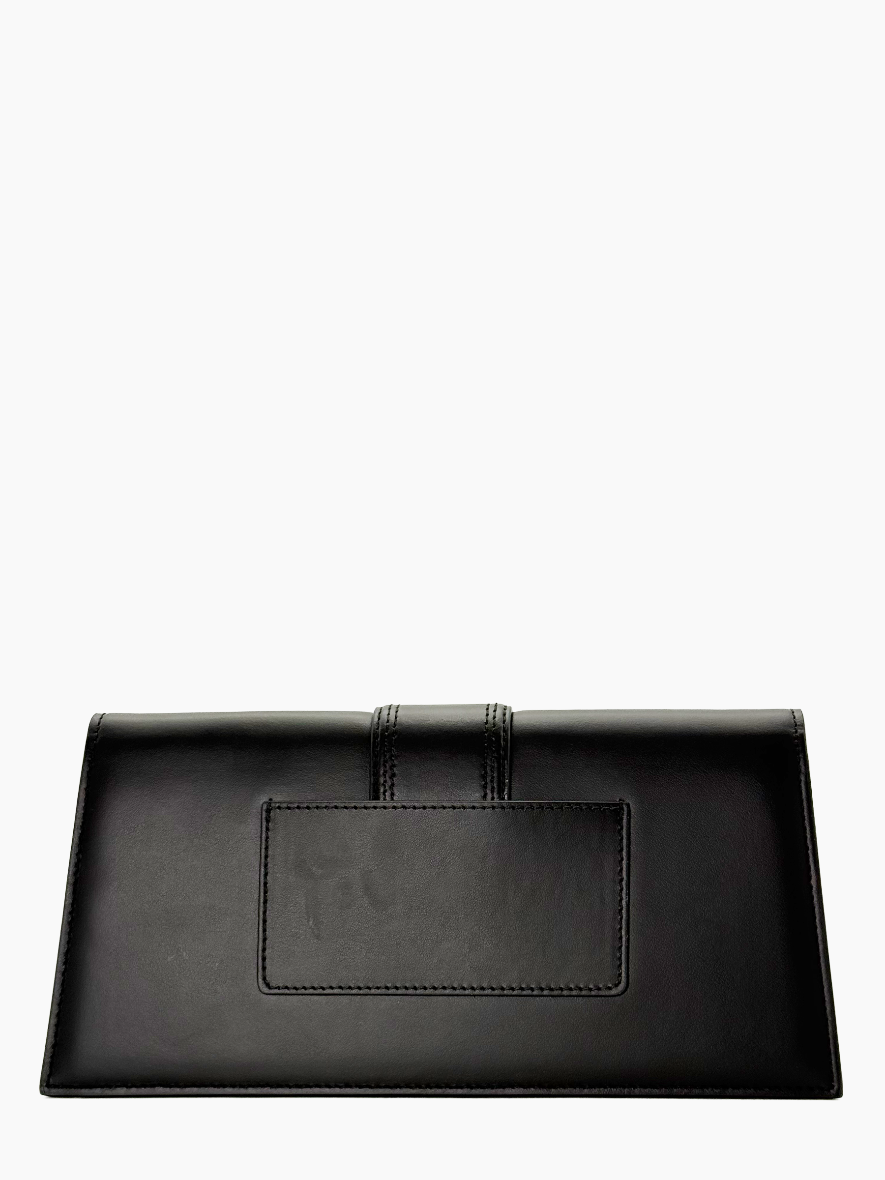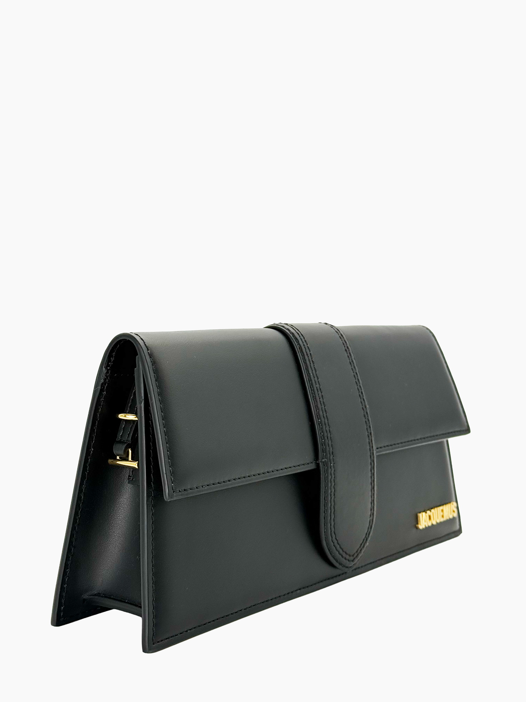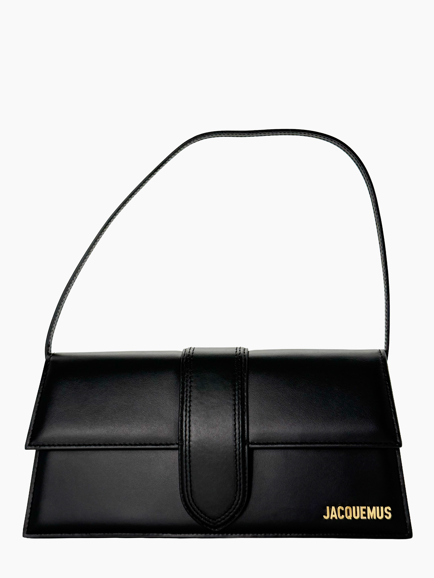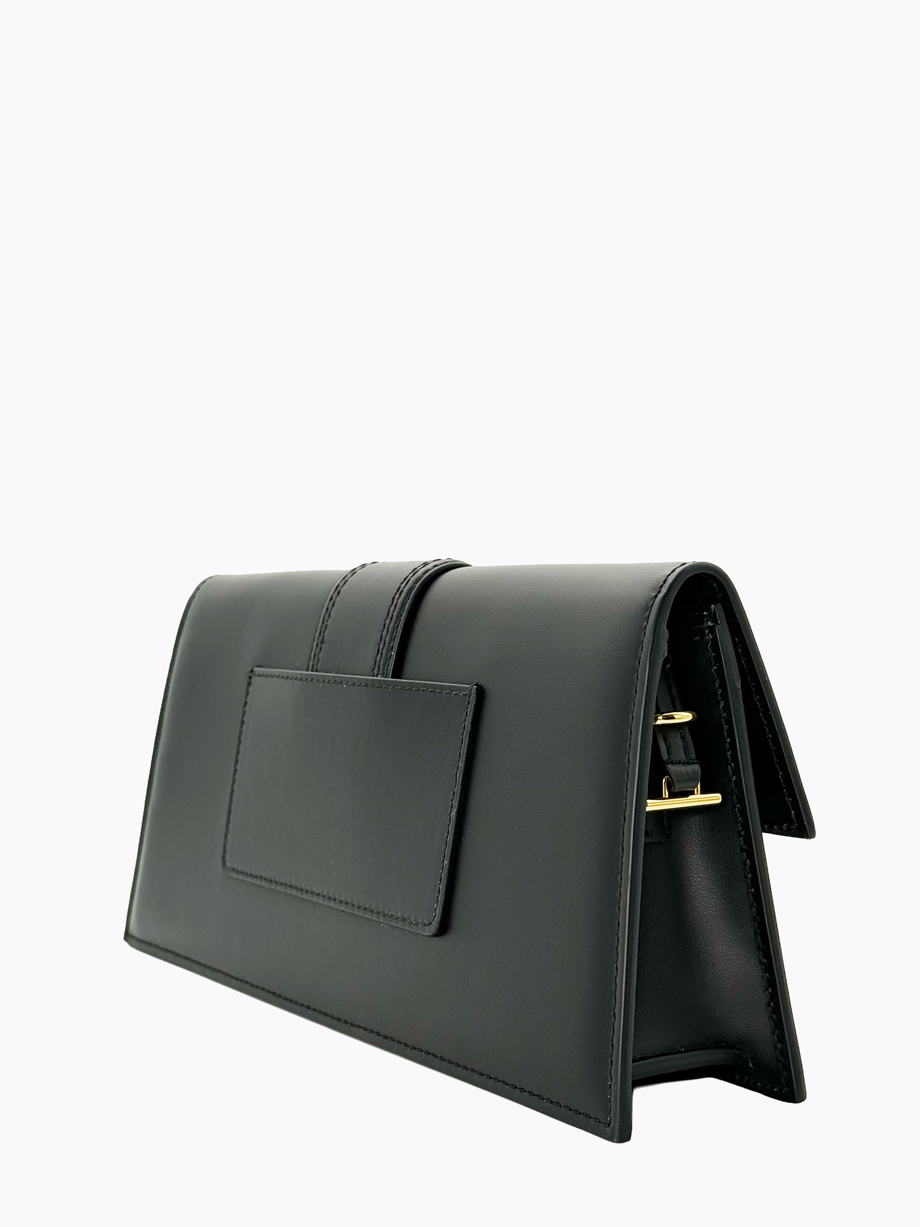 Borsa Bambino Lungo nera dal design allungato e minimalista, ispirata all’estetica elegante e contemporanea di Jacquemus. Realizzata in pelle liscia dalla texture raffinata, presenta una patta frontale strutturata con logo dorato e tracolla regolabile per un utilizzo versatile a spalla o crossbody. La silhouette pulita e compatta la rende un accessorio perfetto per look chic, urbani e serali.
