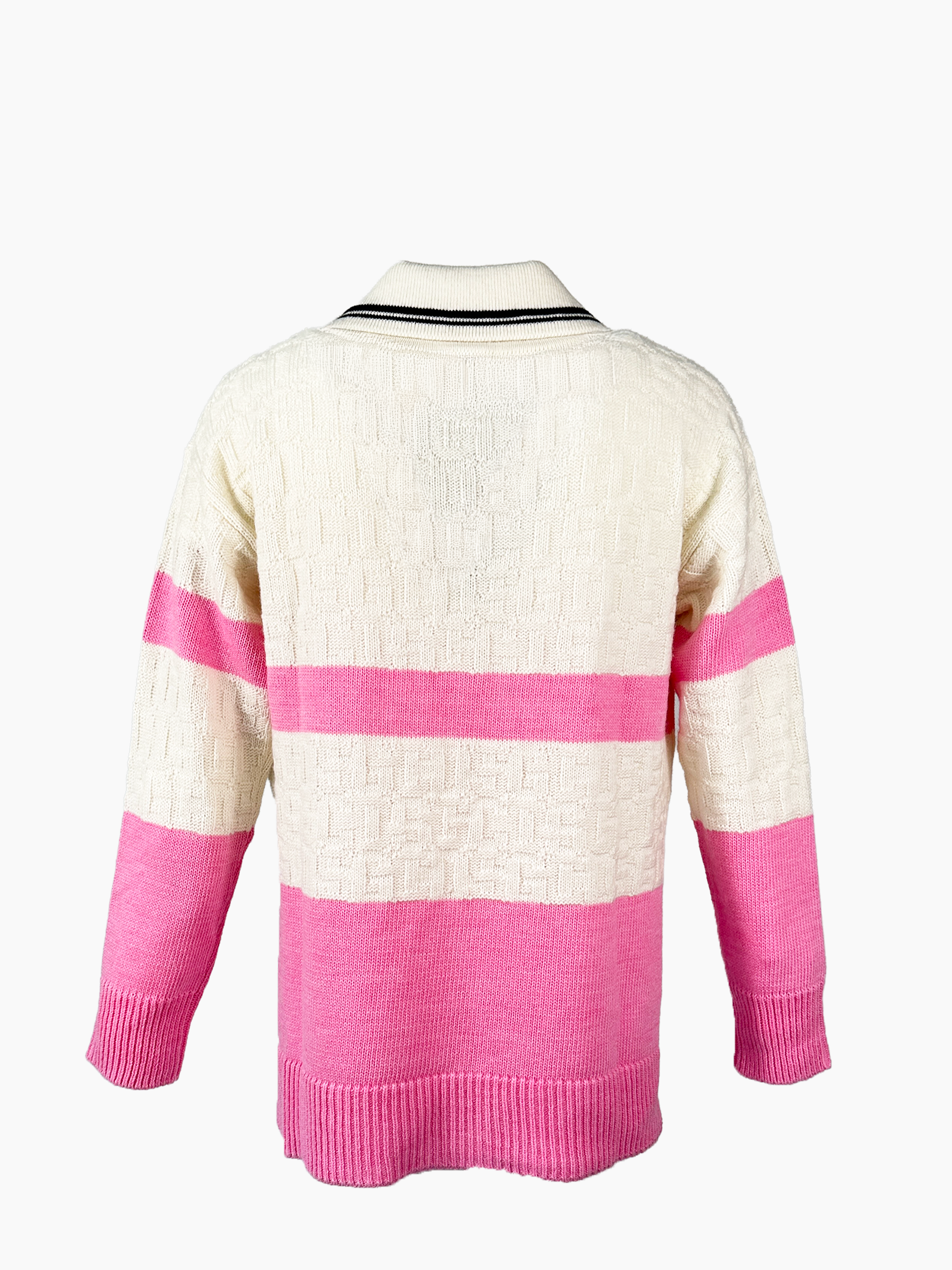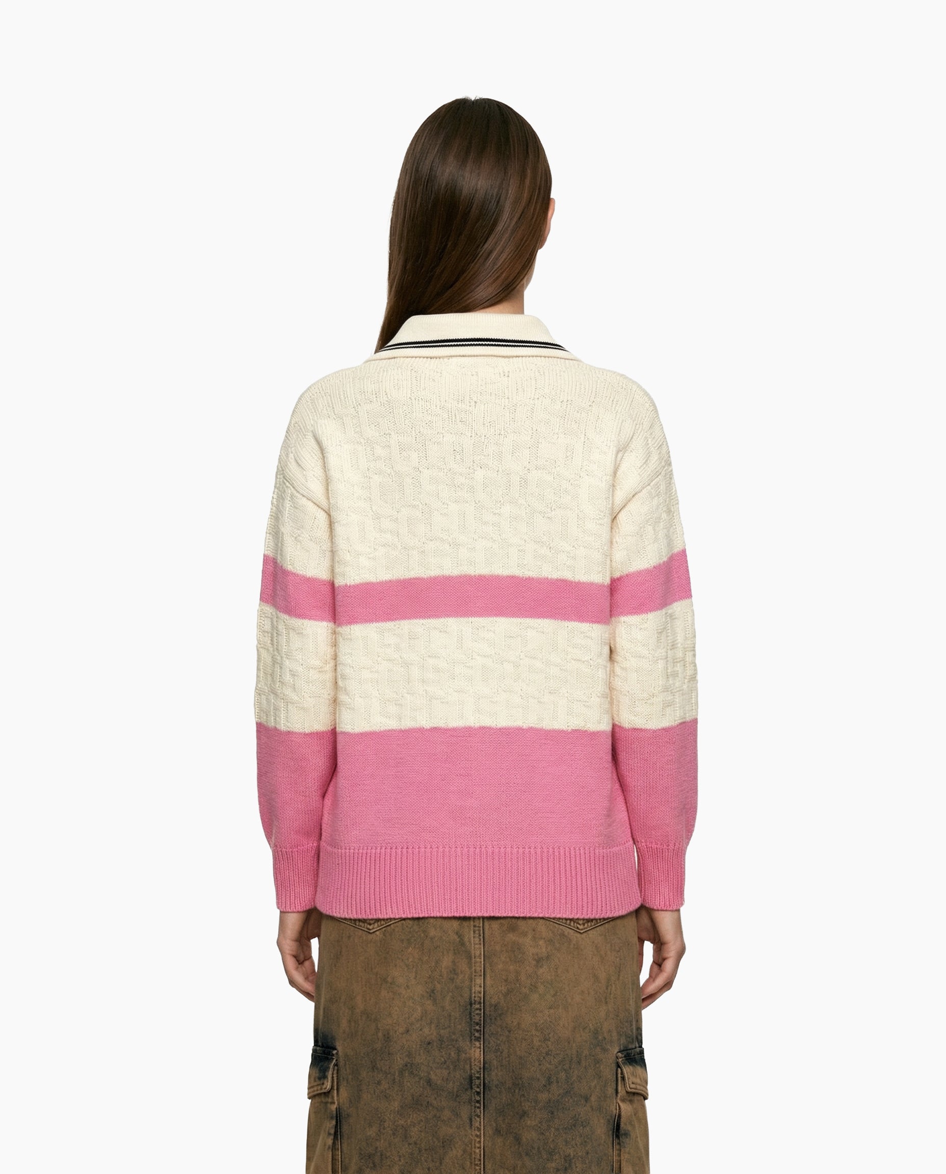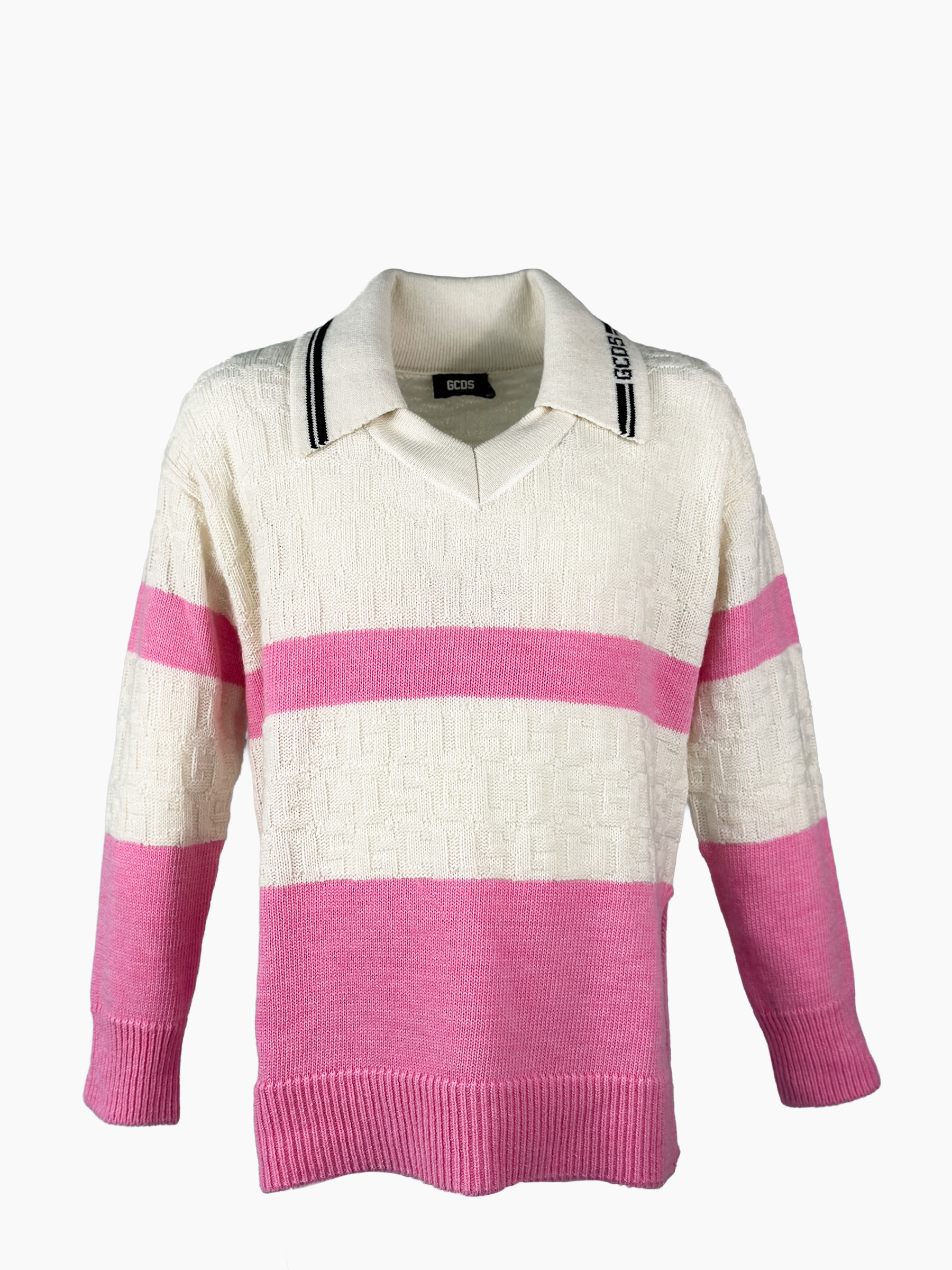 Maglione GCDS a righe bianche e rosa con lavorazione in maglia strutturata e colletto polo con logo ricamato. Il fit morbido e le linee pulite lo rendono un capo versatile, perfetto per look casual dal tocco raffinato e contemporaneo.