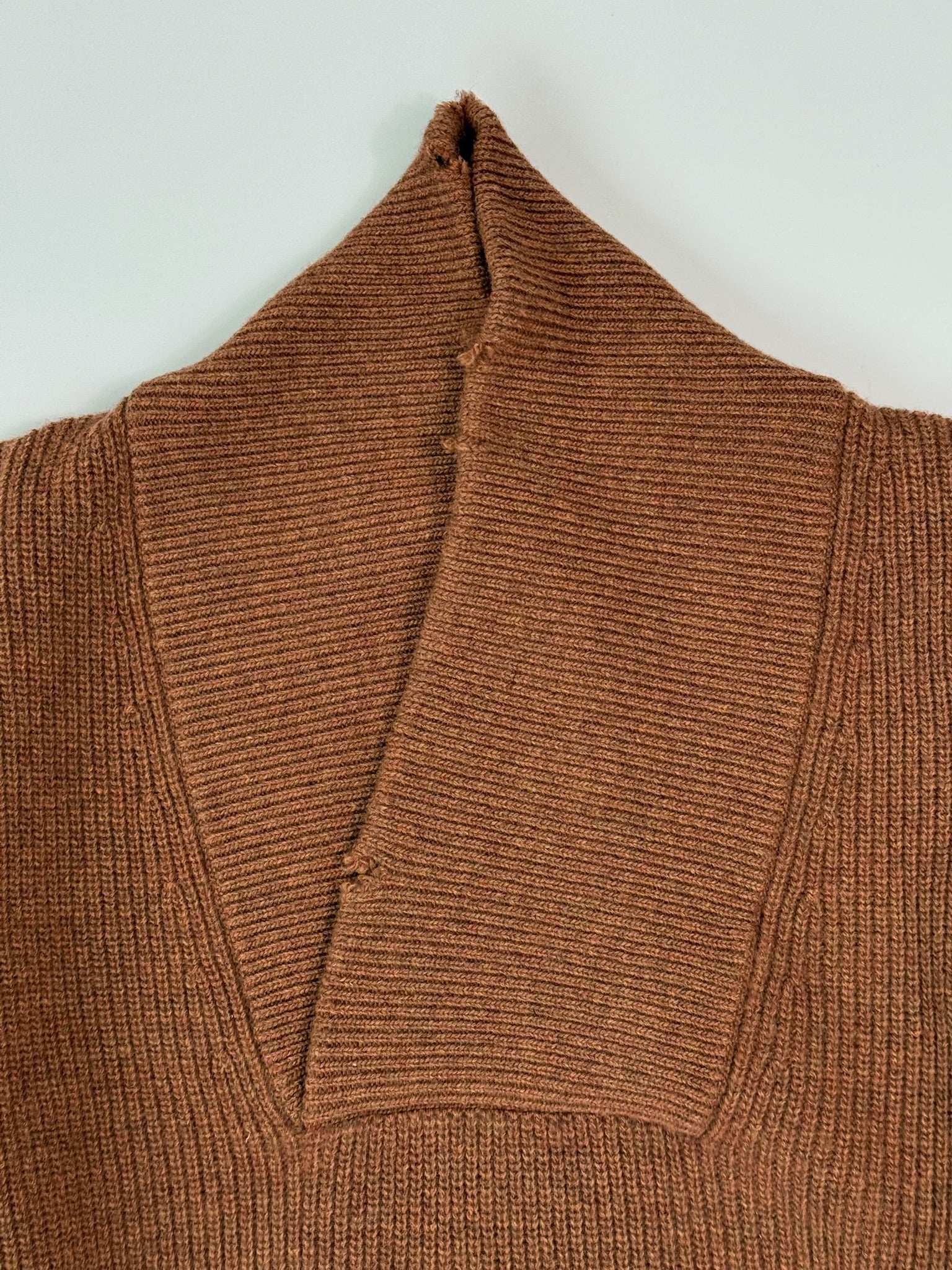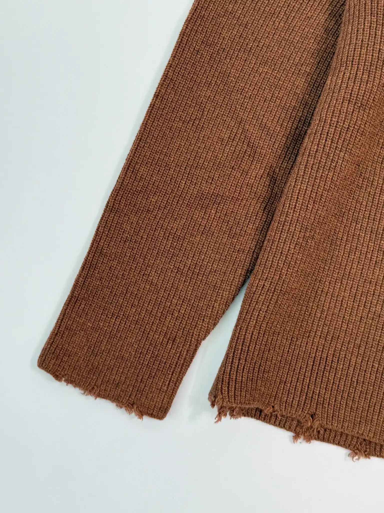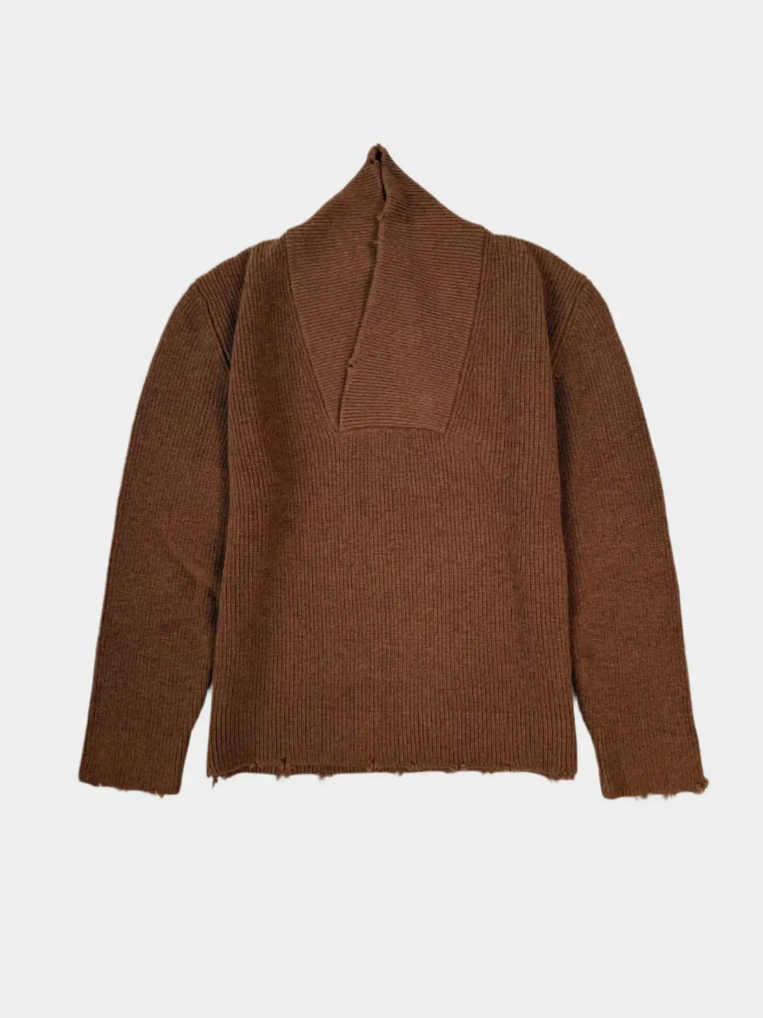 Con un design destrutturato e un fascino grezzo, questo maglione marrone firmato Laneus si distingue per il suo scollo squadrato e il bordo sfrangiato. Realizzato in maglia a costine, presenta una silhouette rilassata con polsini lunghi e finiture tagliate a vivo. Perfetto per look contemporanei e layering creativi, è il capo ideale per chi ama uno stile non convenzionale.