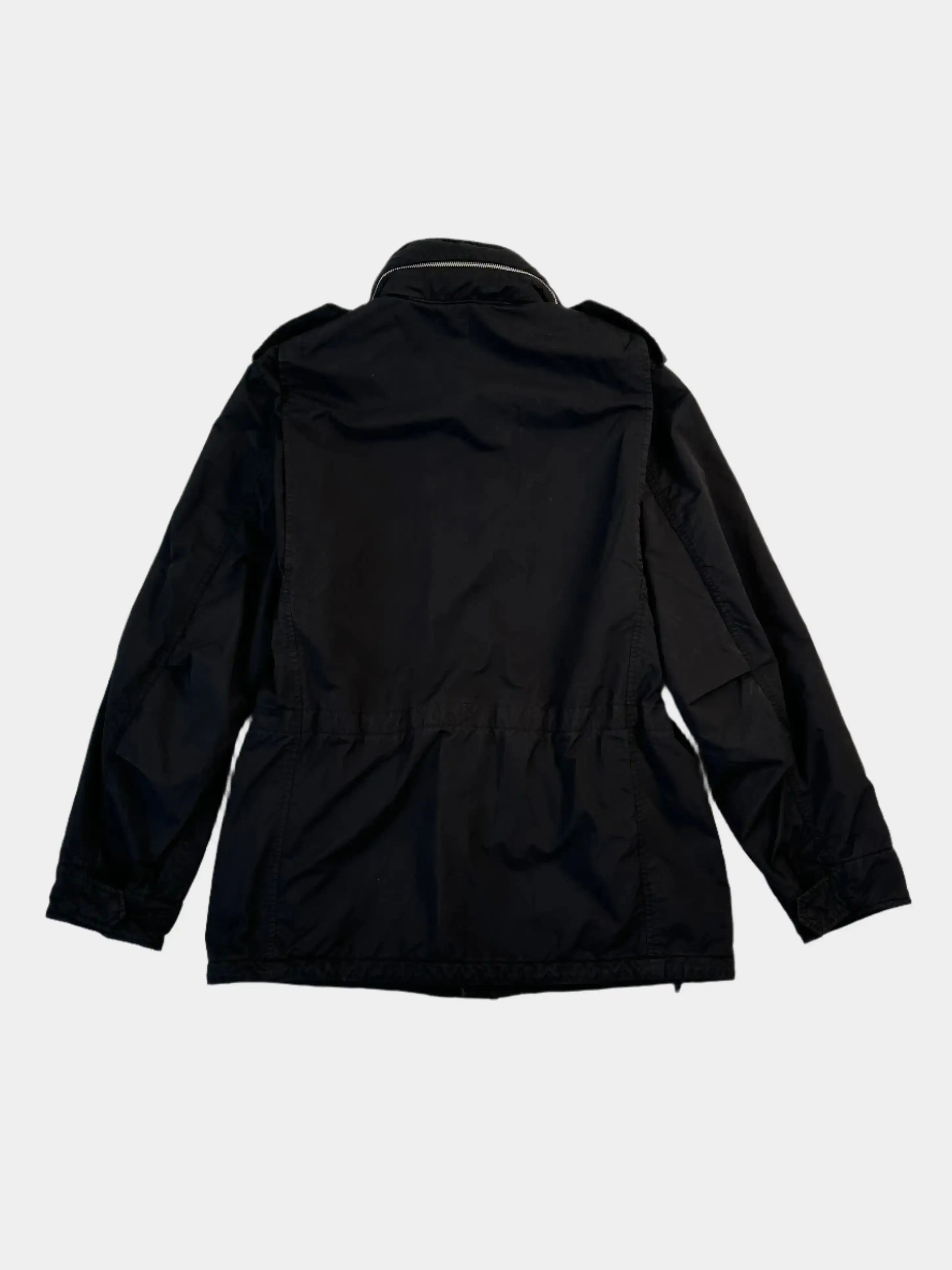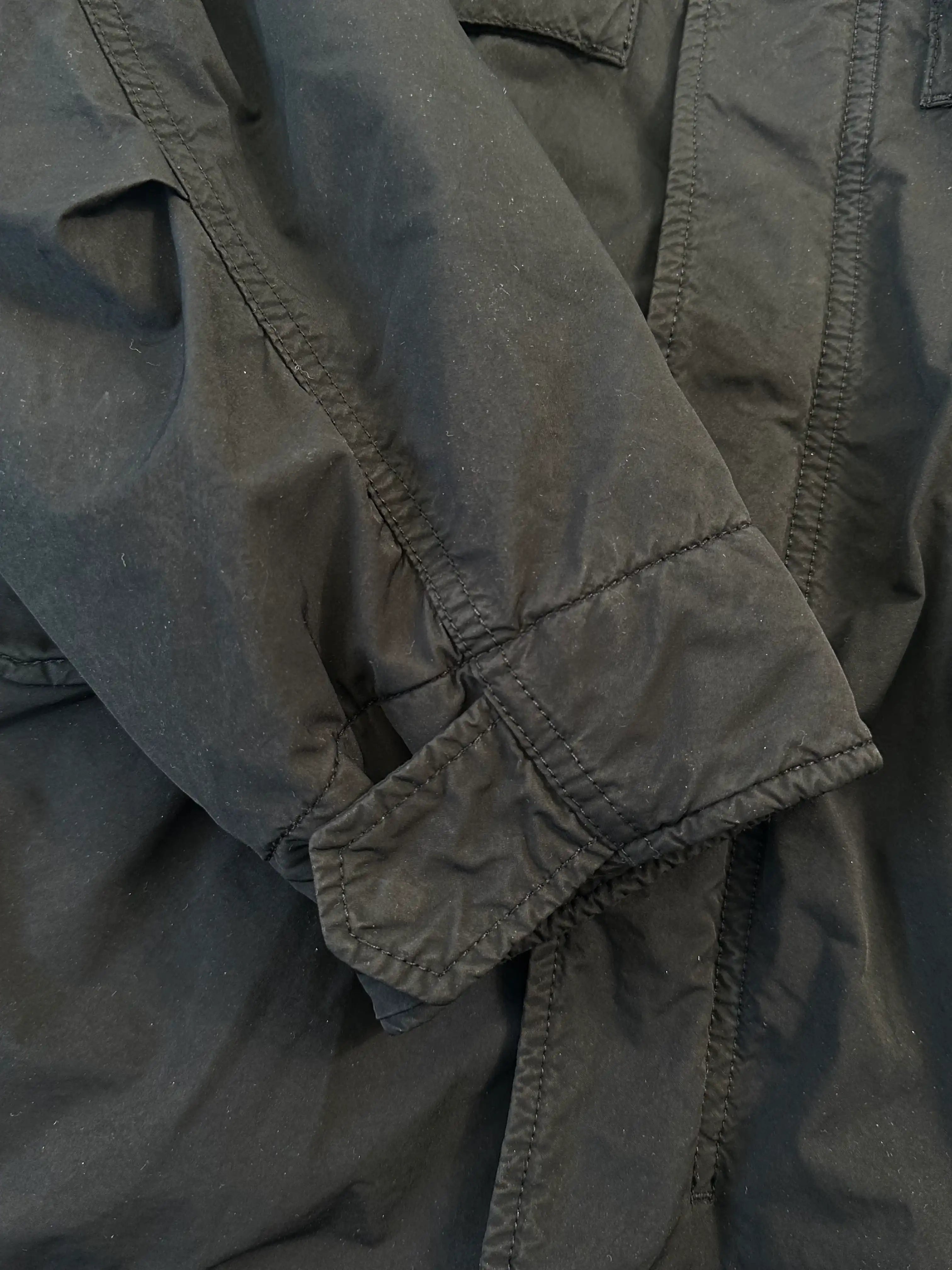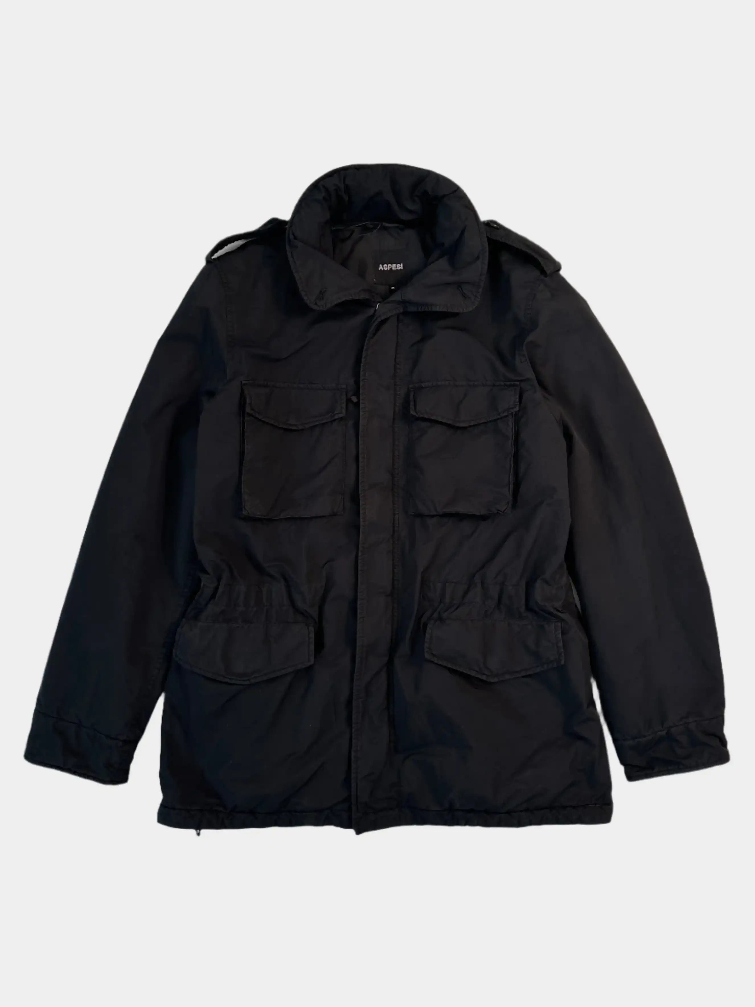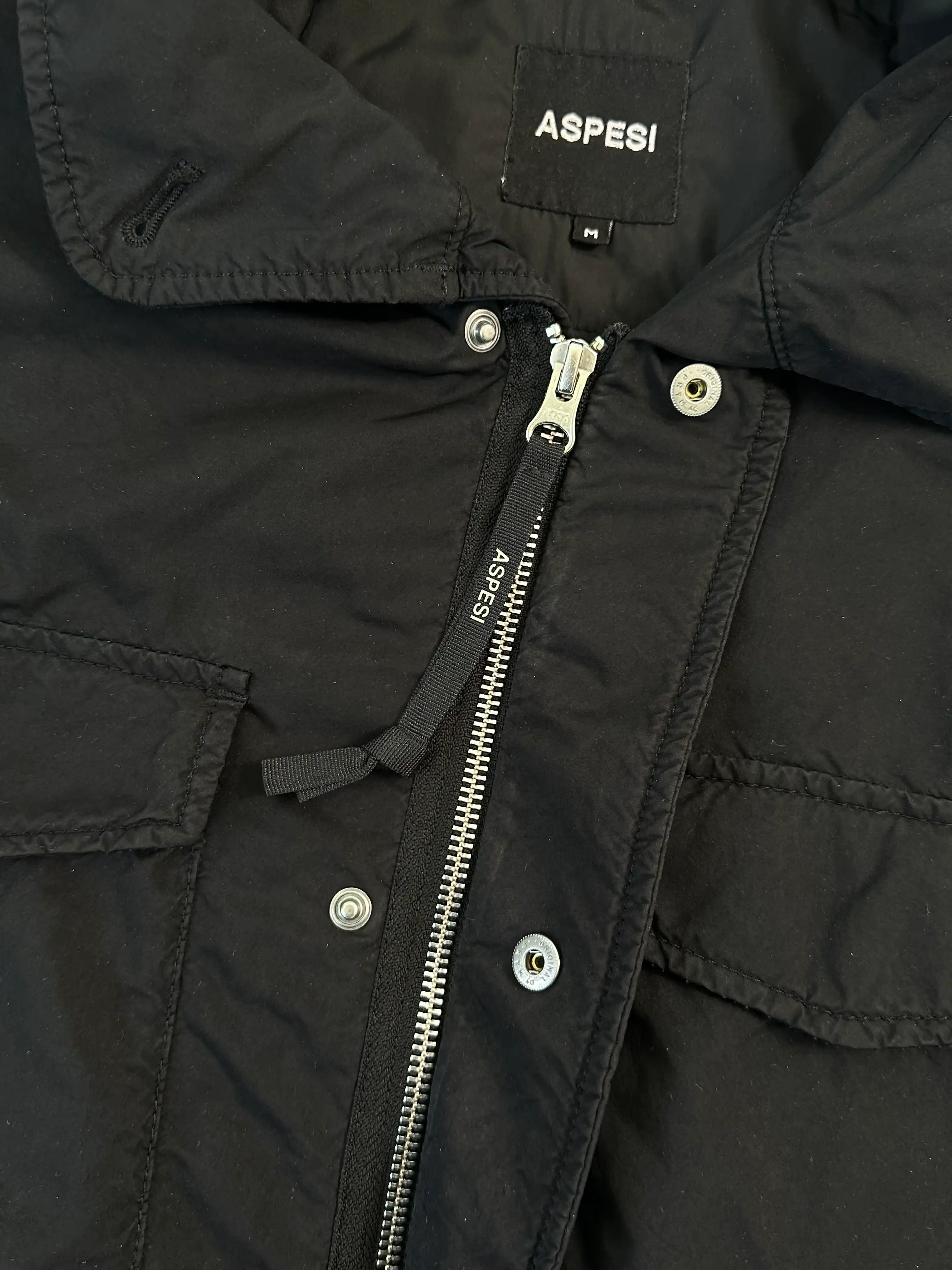 Giacca tecnica leggera firmata Aspesi, perfetta per la mezza stagione. Realizzata in tessuto idrorepellente con imbottitura sottile, presenta quattro tasche frontali con patta, zip centrale coperta da patta con bottoni e cappuccio regolabile integrato nel collo alto. Design essenziale e funzionale, ideale per un uso quotidiano urbano.