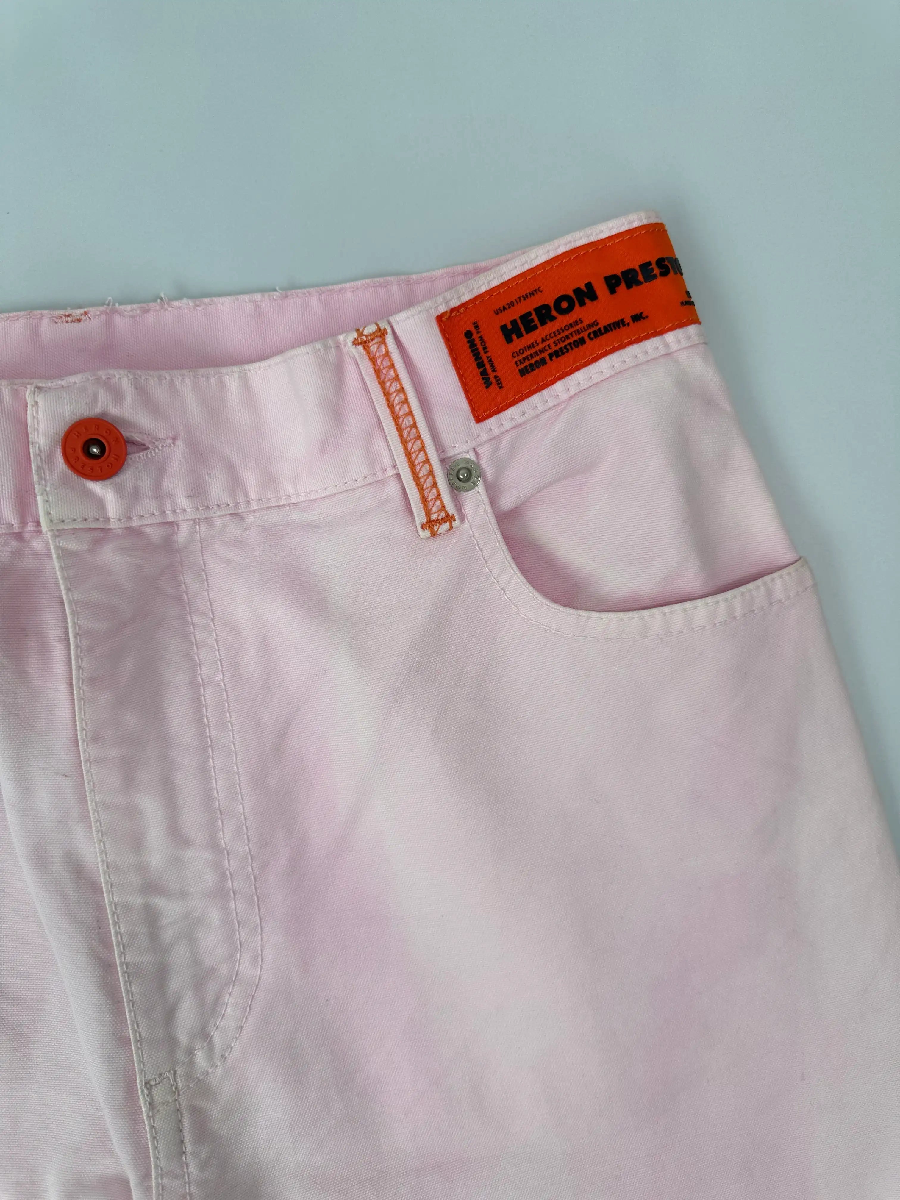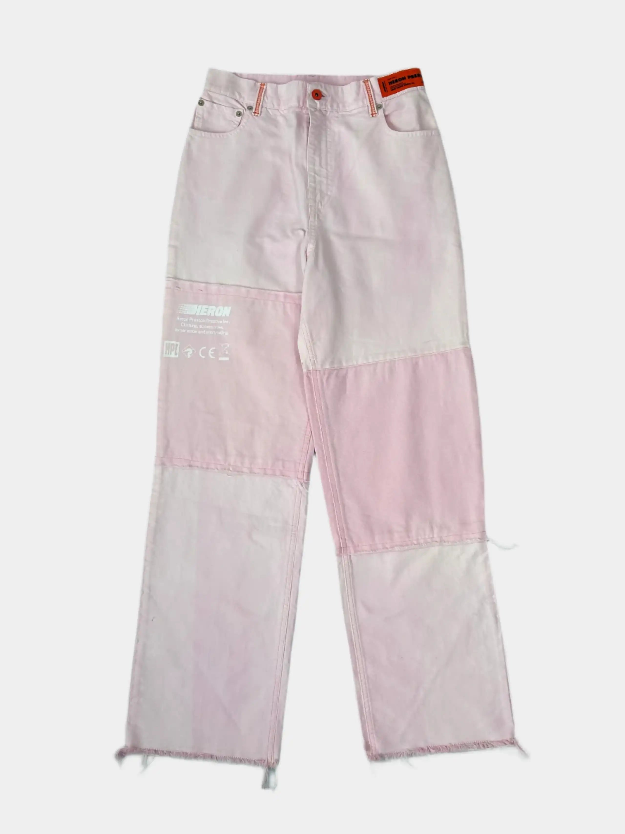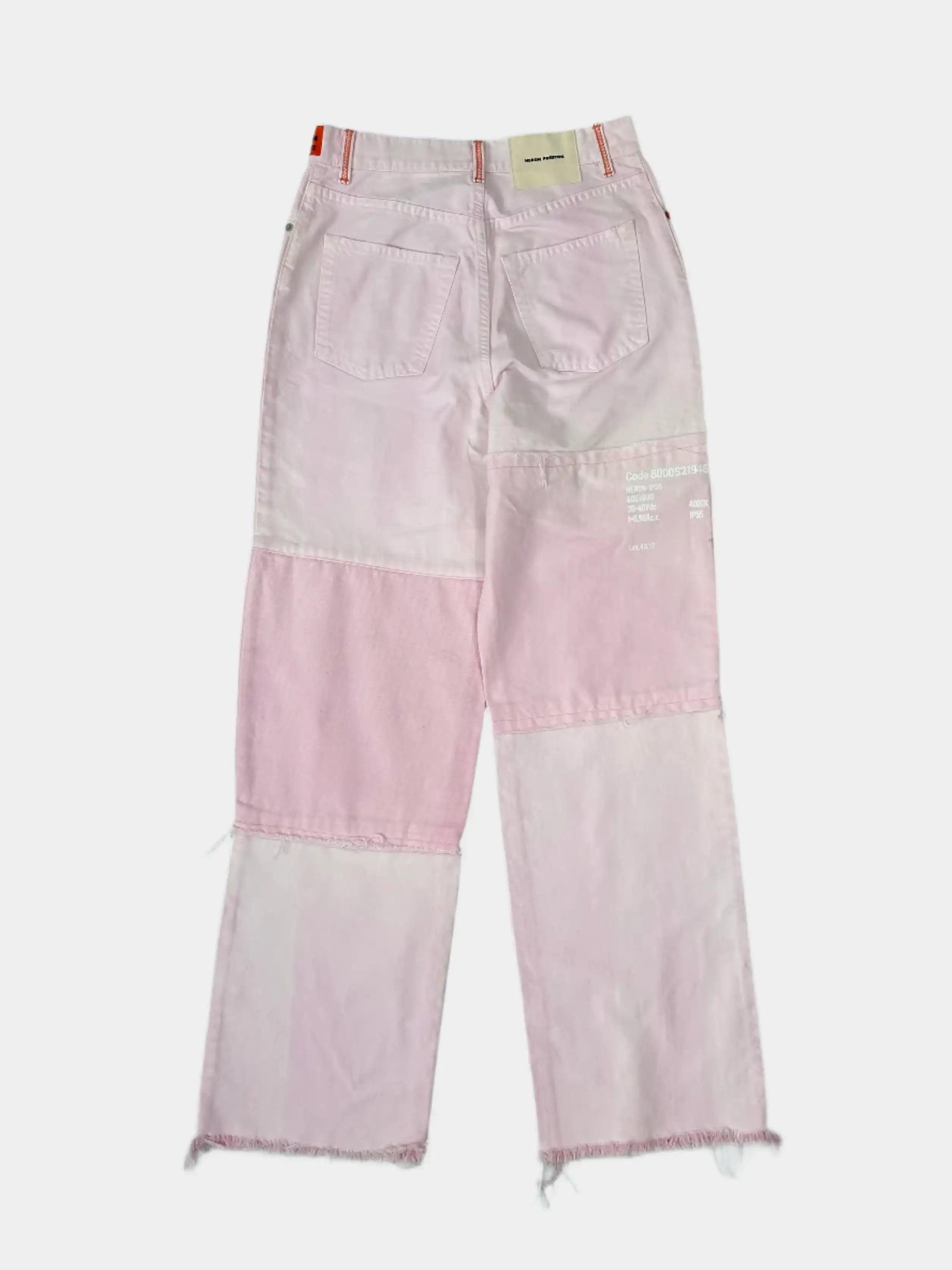 Espressione di stile contemporaneo, questi pantaloni a 5 tasche combinano patch di denim rosa e bianco per un effetto grafico audace. La silhouette dritta è valorizzata da cuciture a vista, orli tagliati vivi e dettagli stampati a contrasto che sottolineano l’estetica industriale del capo. Un modello distintivo pensato per chi cerca carattere e originalità nel denim.