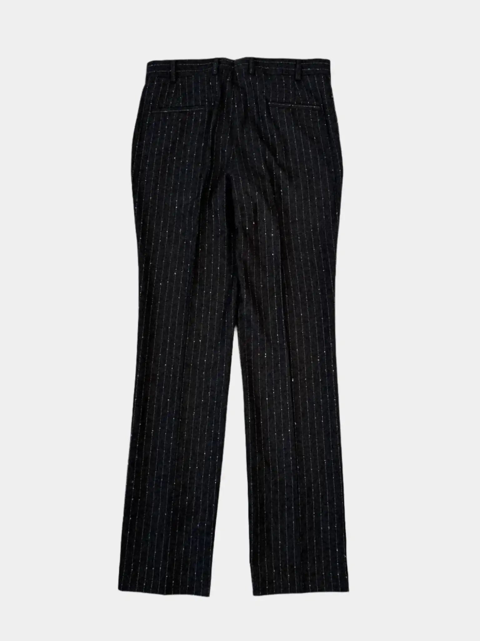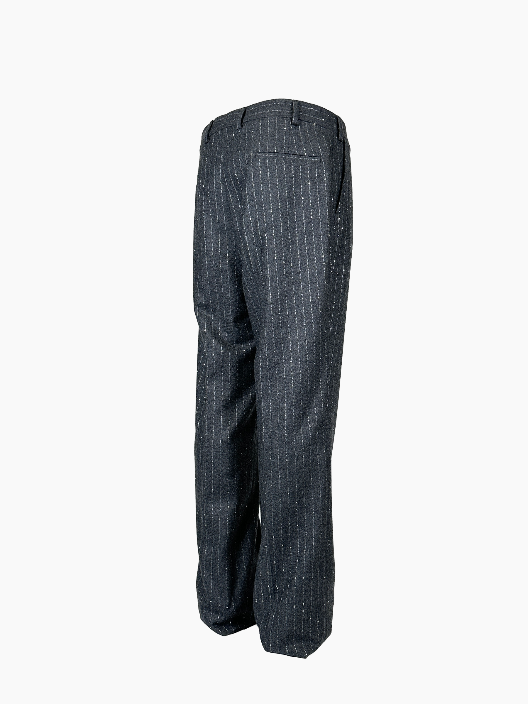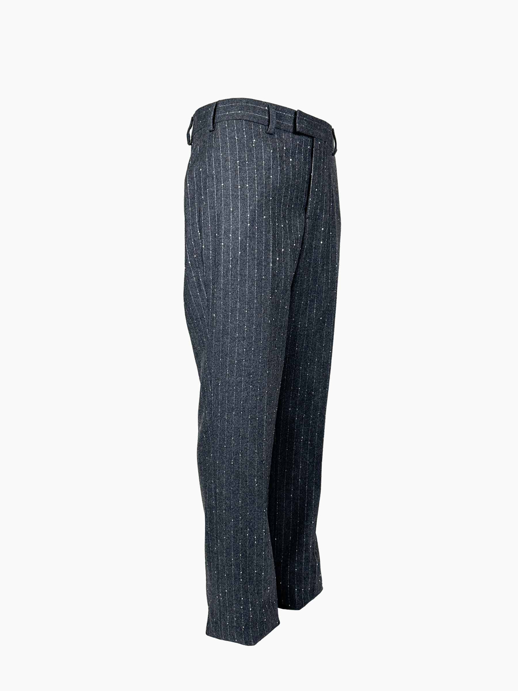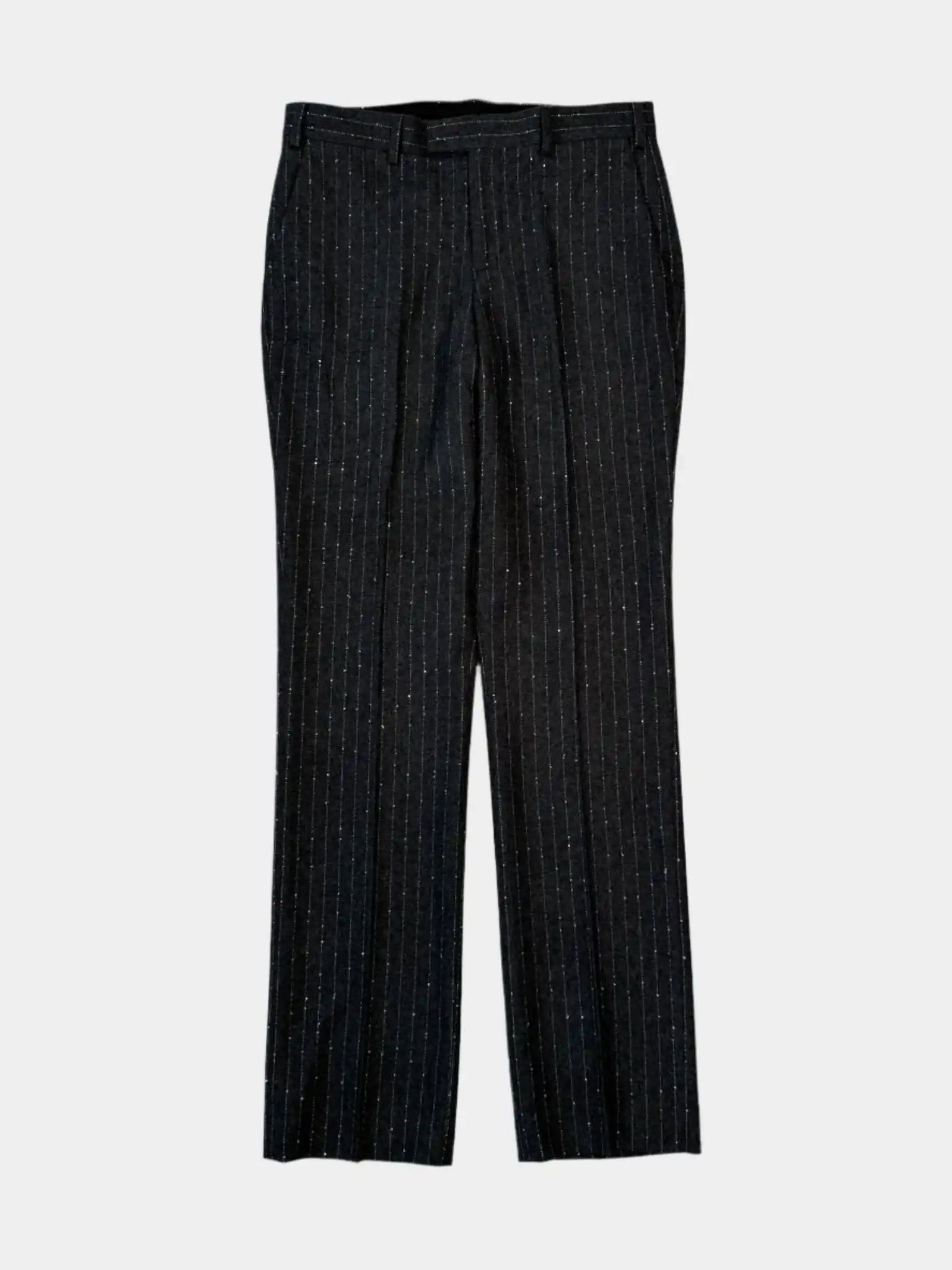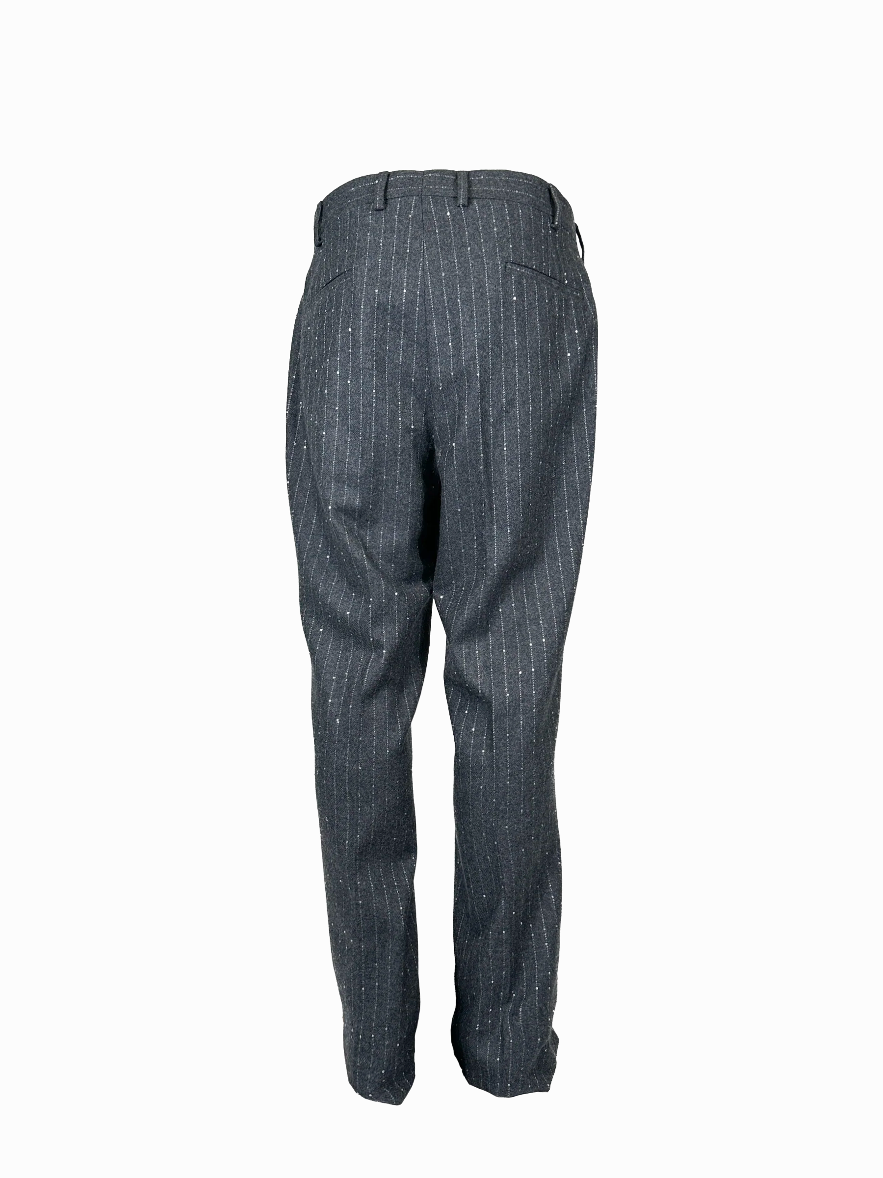 Eleganza e sartorialità si fondono in questi pantaloni grigi Laneus, realizzati in lana vergine con motivo gessato a righe sottili. Il taglio dritto e la linea classica valorizzano la figura con discrezione, mentre la lavorazione del tessuto aggiunge una raffinata brillantezza grazie al filato con effetto luminoso. Perfetti per outfit formali o da sera, questi pantaloni rappresentano il perfetto equilibrio tra modernità e tradizione.