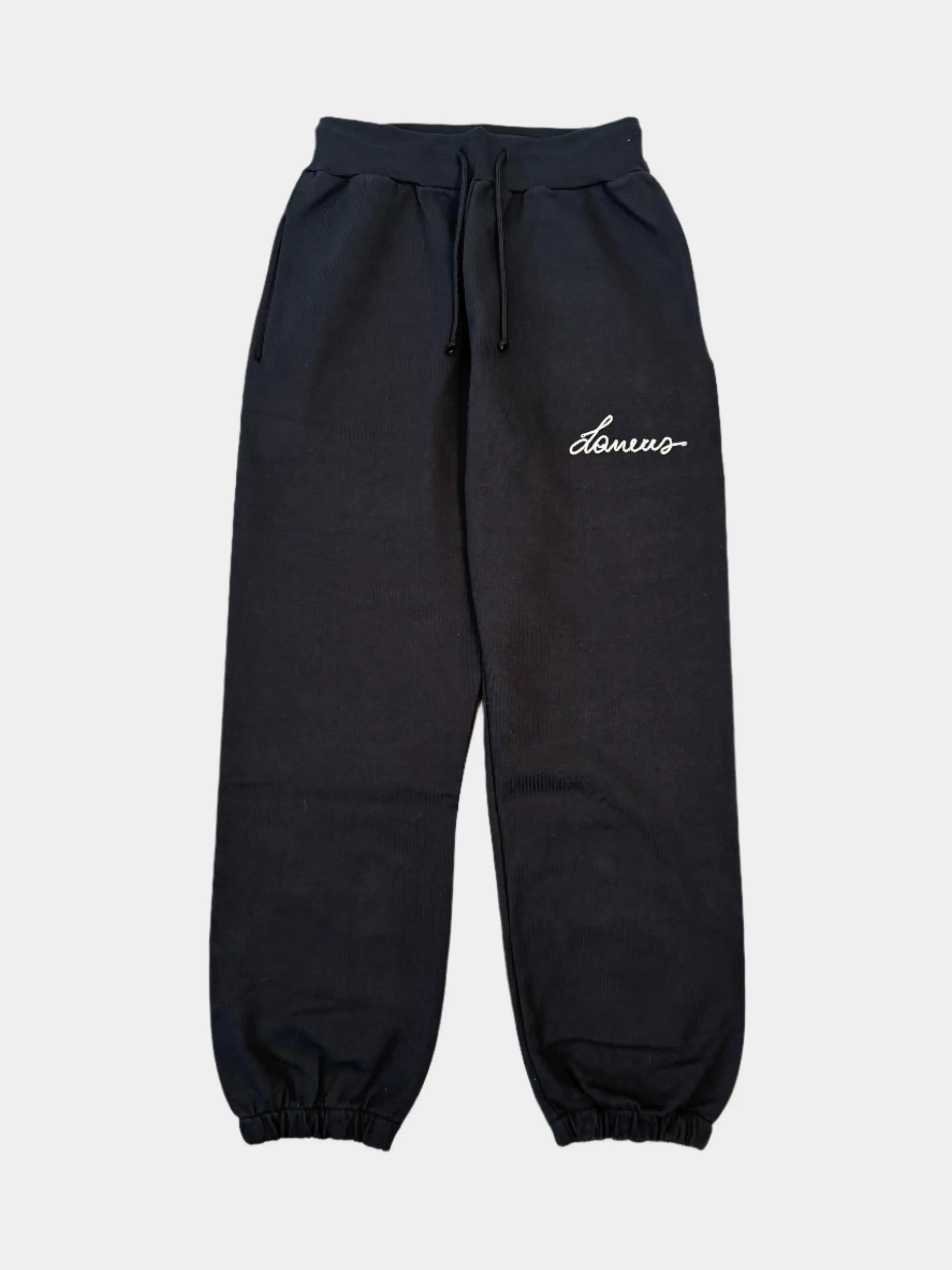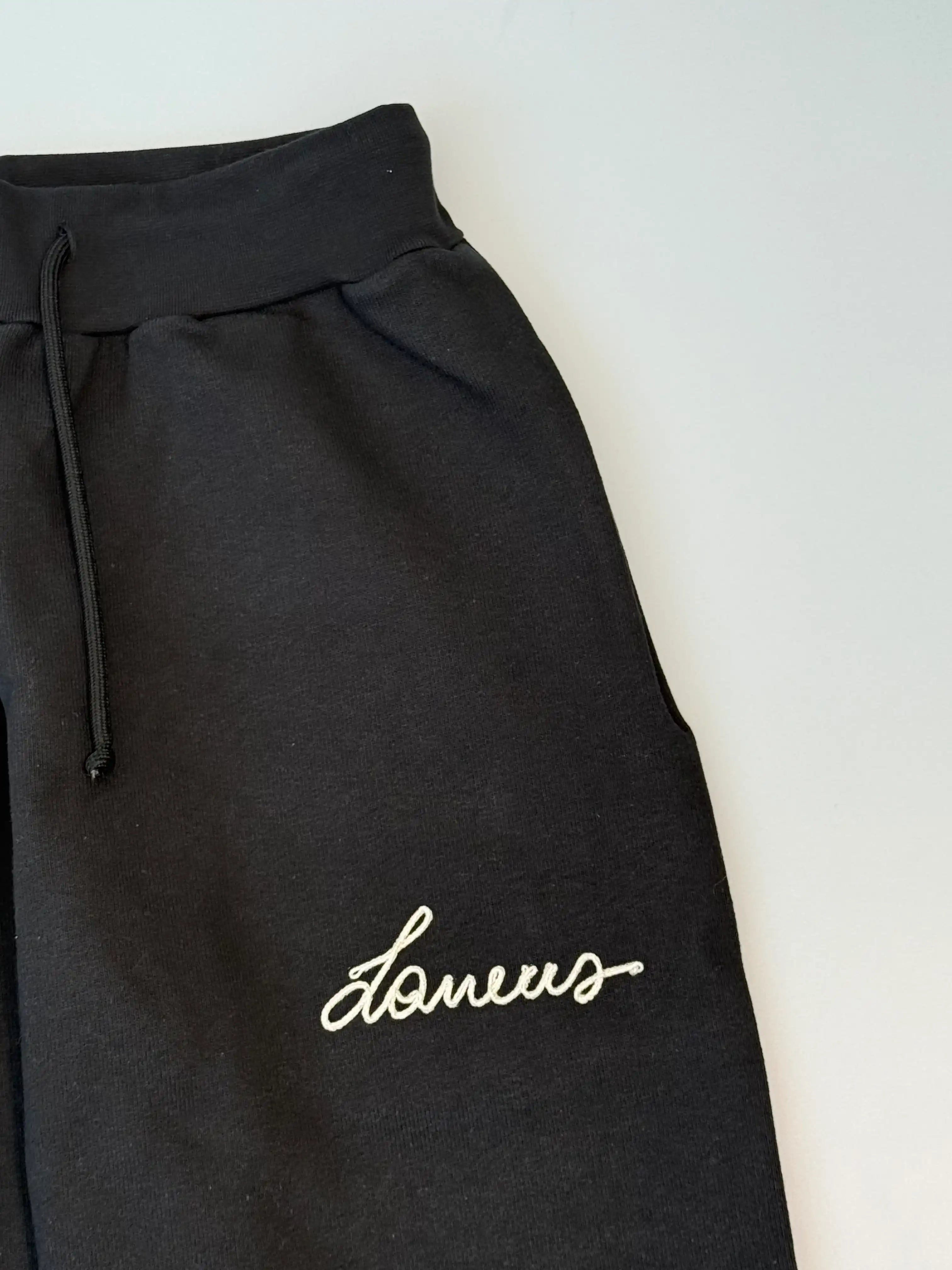 Pantaloni in felpa firmati Laneus, con silhouette sportiva e fondo elasticizzato. Il logo ricamato sul fianco aggiunge un tocco distintivo a un capo pensato per il comfort quotidiano, senza rinunciare allo stile.