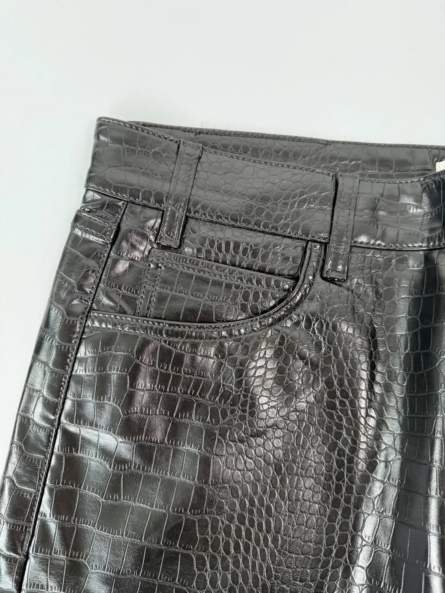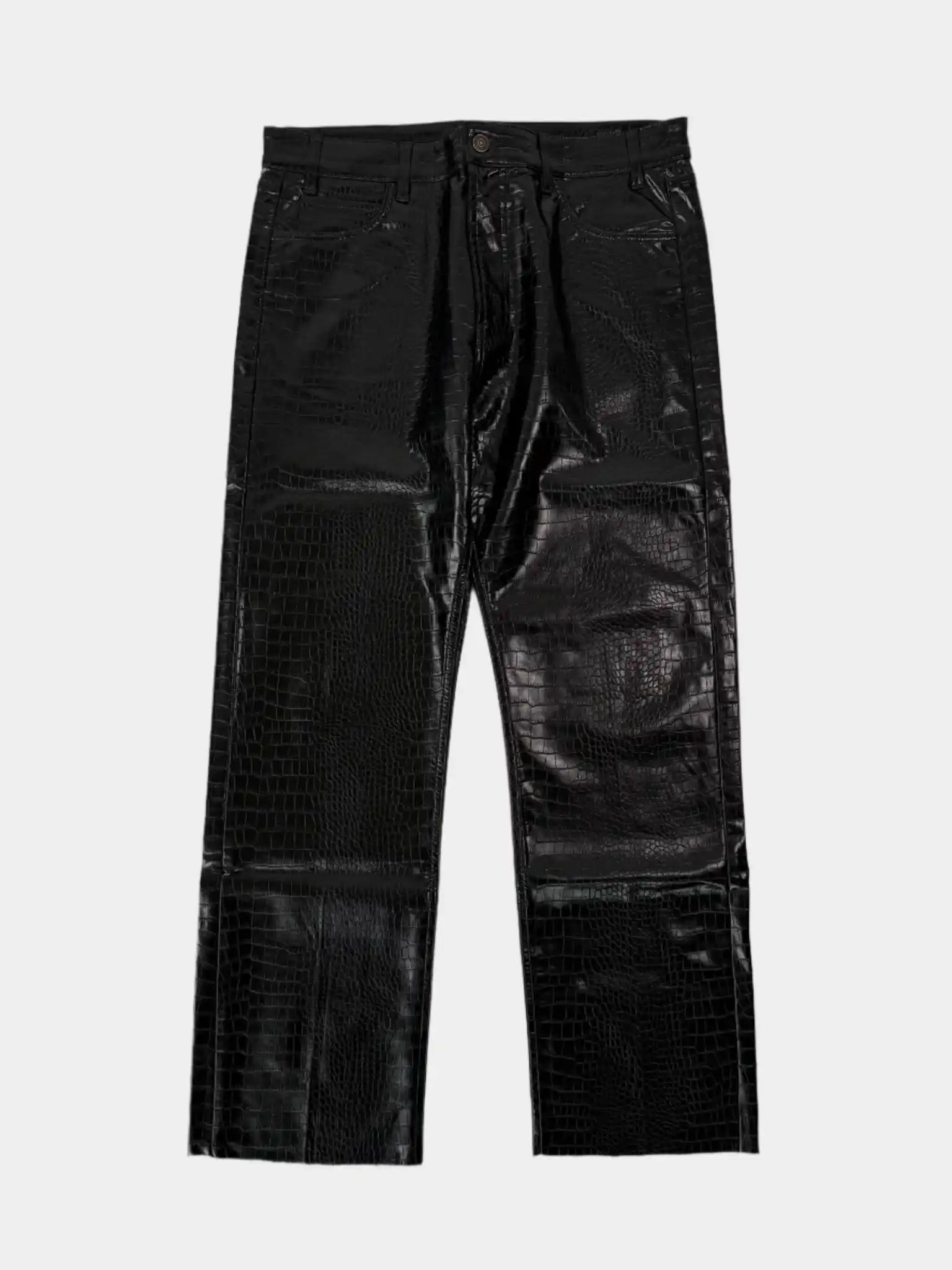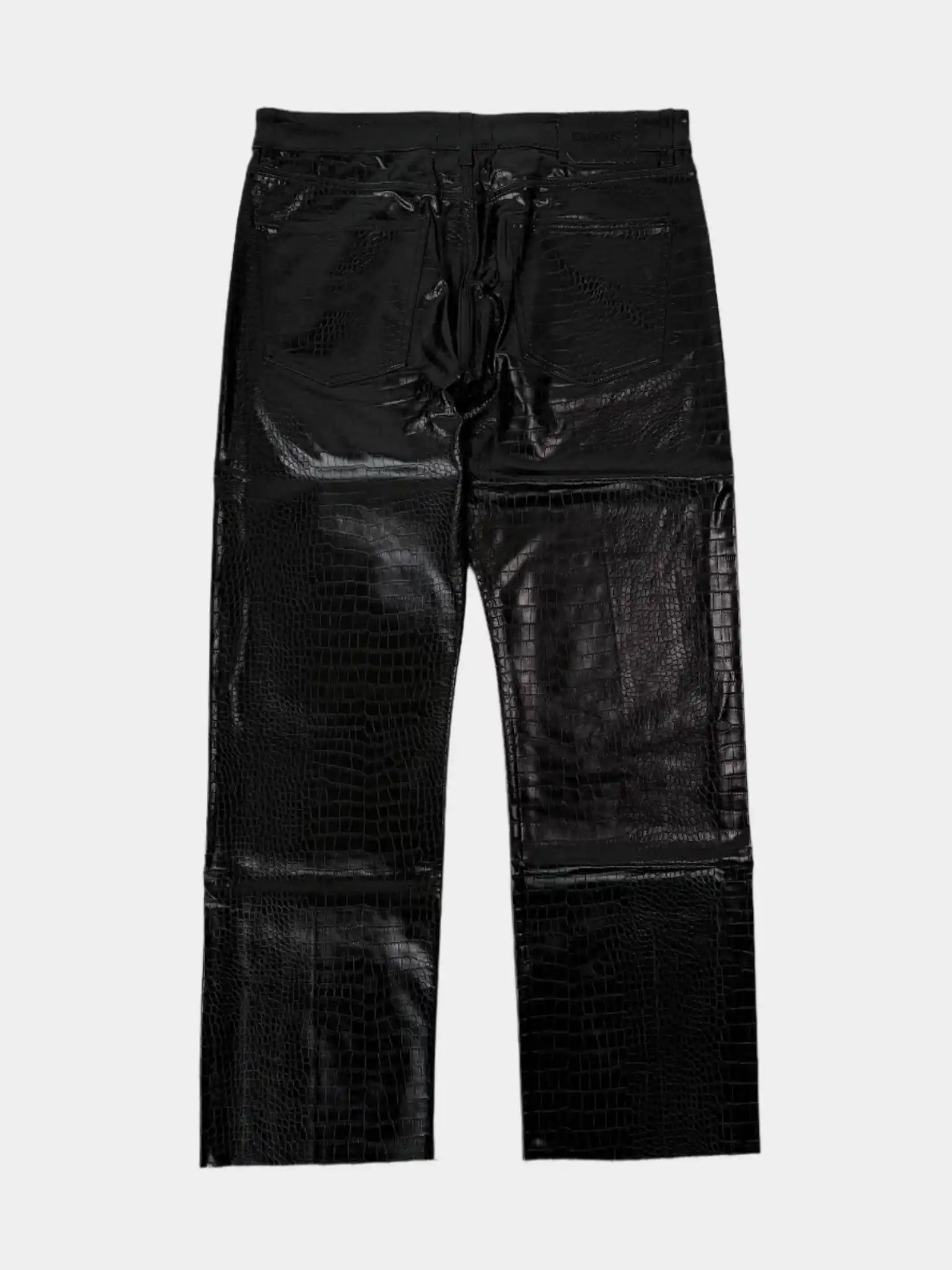 Con una texture audace ed effetto lucido, questi pantaloni neri firmati Laneus donano un tocco contemporaneo al guardaroba. Il motivo effetto coccodrillo e la finitura brillante creano un look d'impatto, mentre la vestibilità dritta e la chiusura con bottone e zip li rendono facili da abbinare a camicie o maglie per un outfit deciso. Il fondo tagliato vivo aggiunge un dettaglio raw di tendenza.