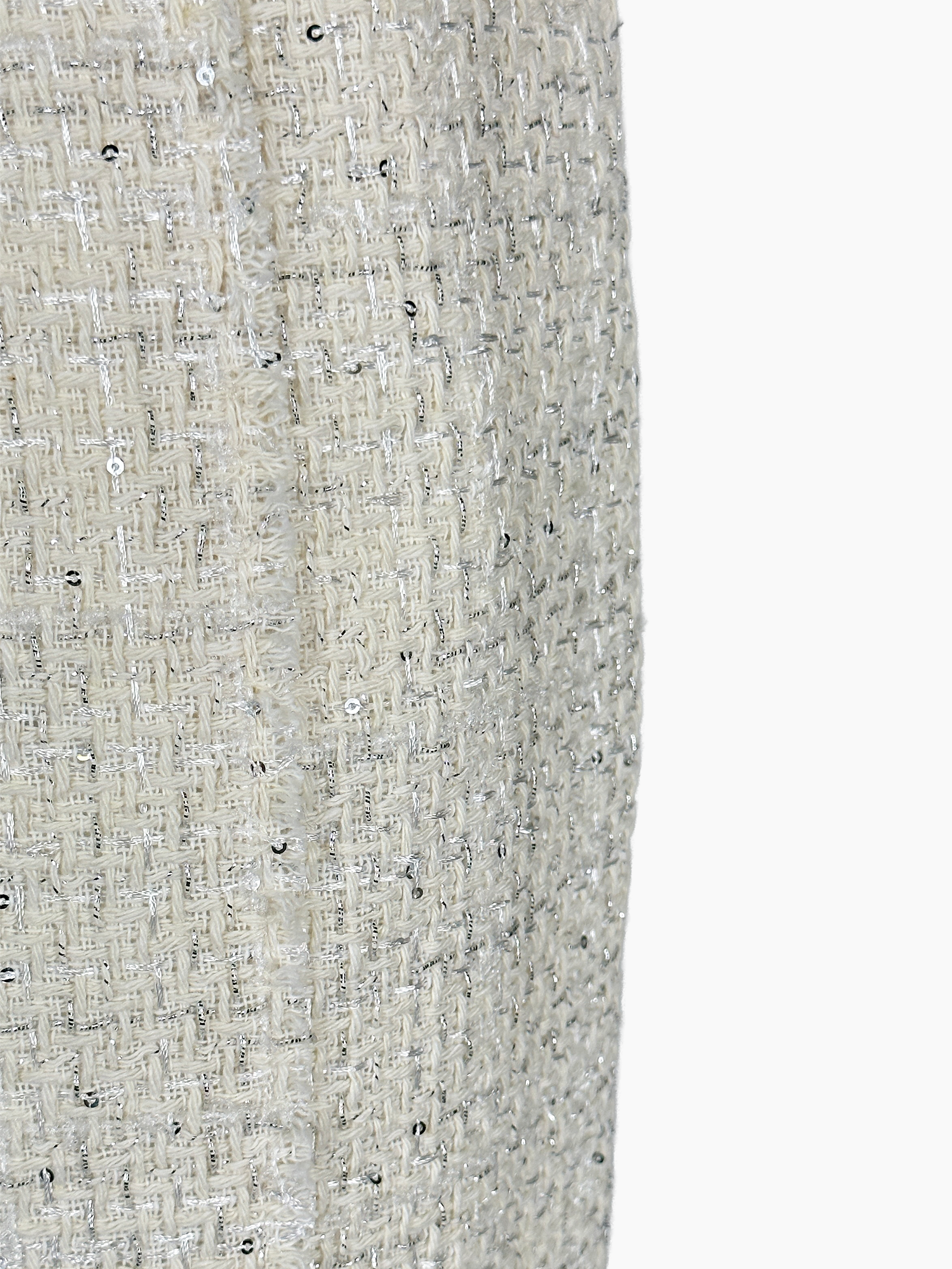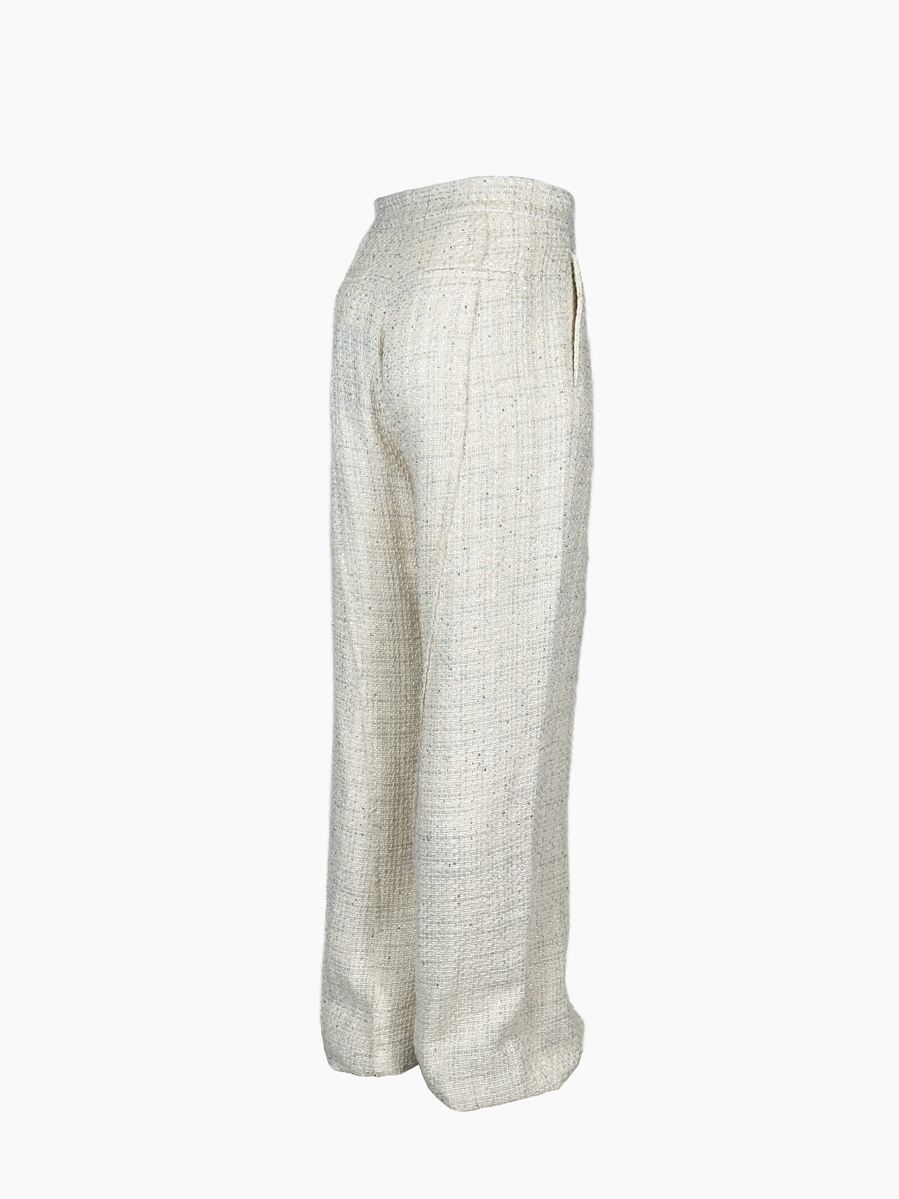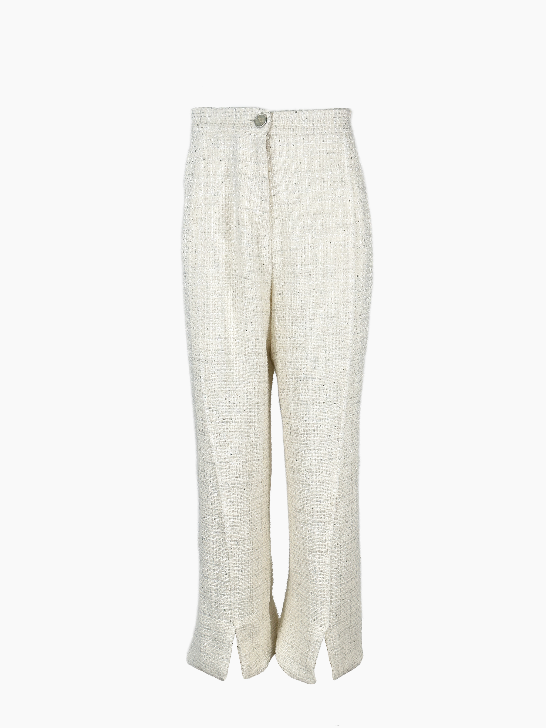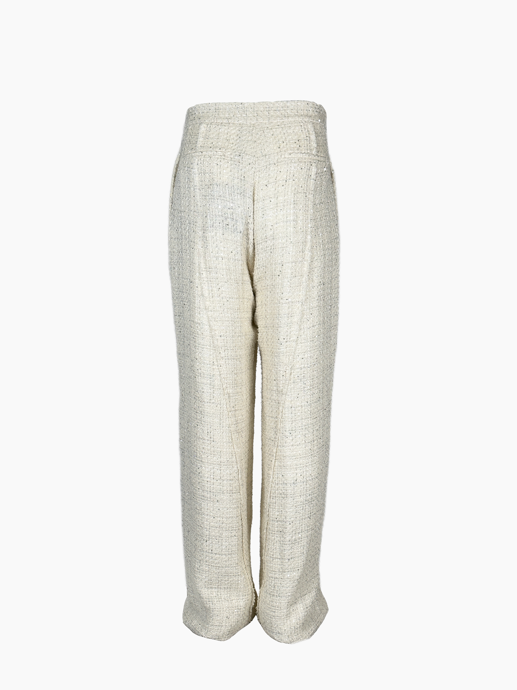 Pantaloni in tweed bianco dalla texture strutturata e dall’estetica ricercata, perfetti per costruire look eleganti e contemporanei. Il modello presenta vita media, gamba dritta e dettagli sartoriali tipici di GCDS, offrendo un equilibrio ideale fra carattere e versatilità. Ideali per outfit raffinati ma con personalità.